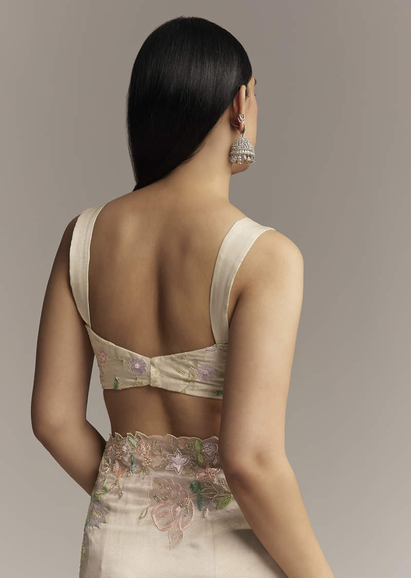 Make a glowing statement in this water-gold paper tissue saree. Featuring multicolor resham floral embroidery, cutwork border, and shimmering sequins, moti, and cutdana—this is luxury in drape form. Awarded as... More Product Details