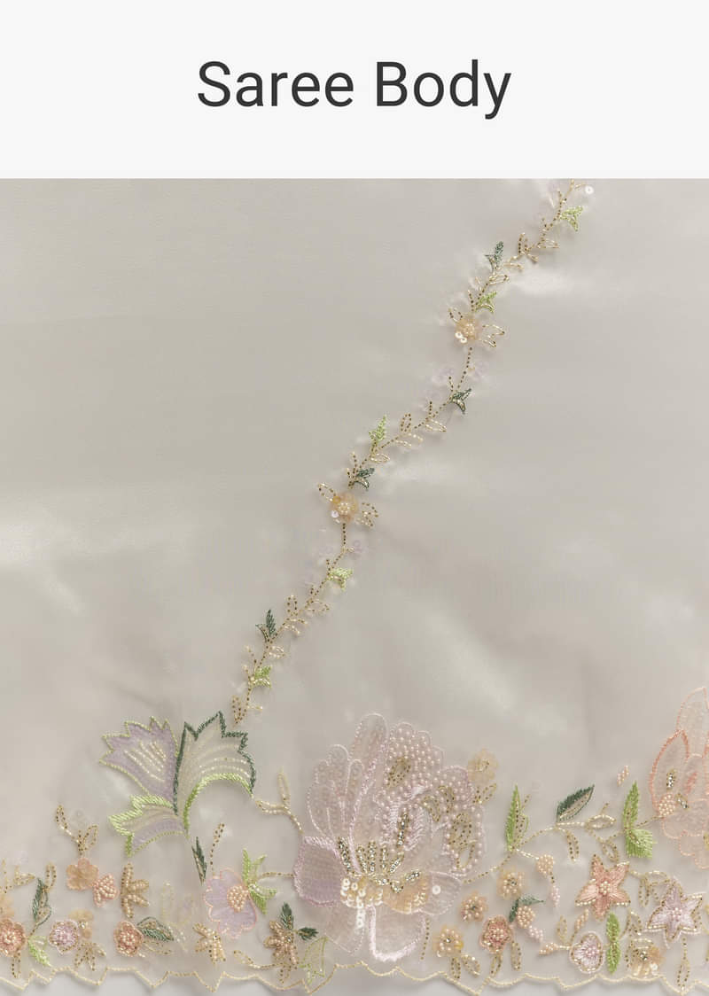 Make a glowing statement in this water-gold paper tissue saree. Featuring multicolor resham floral embroidery, cutwork border, and shimmering sequins, moti, and cutdana—this is luxury in drape form. Awarded as the Most Trusted Brand, we're delivering styles you love, just as promised.