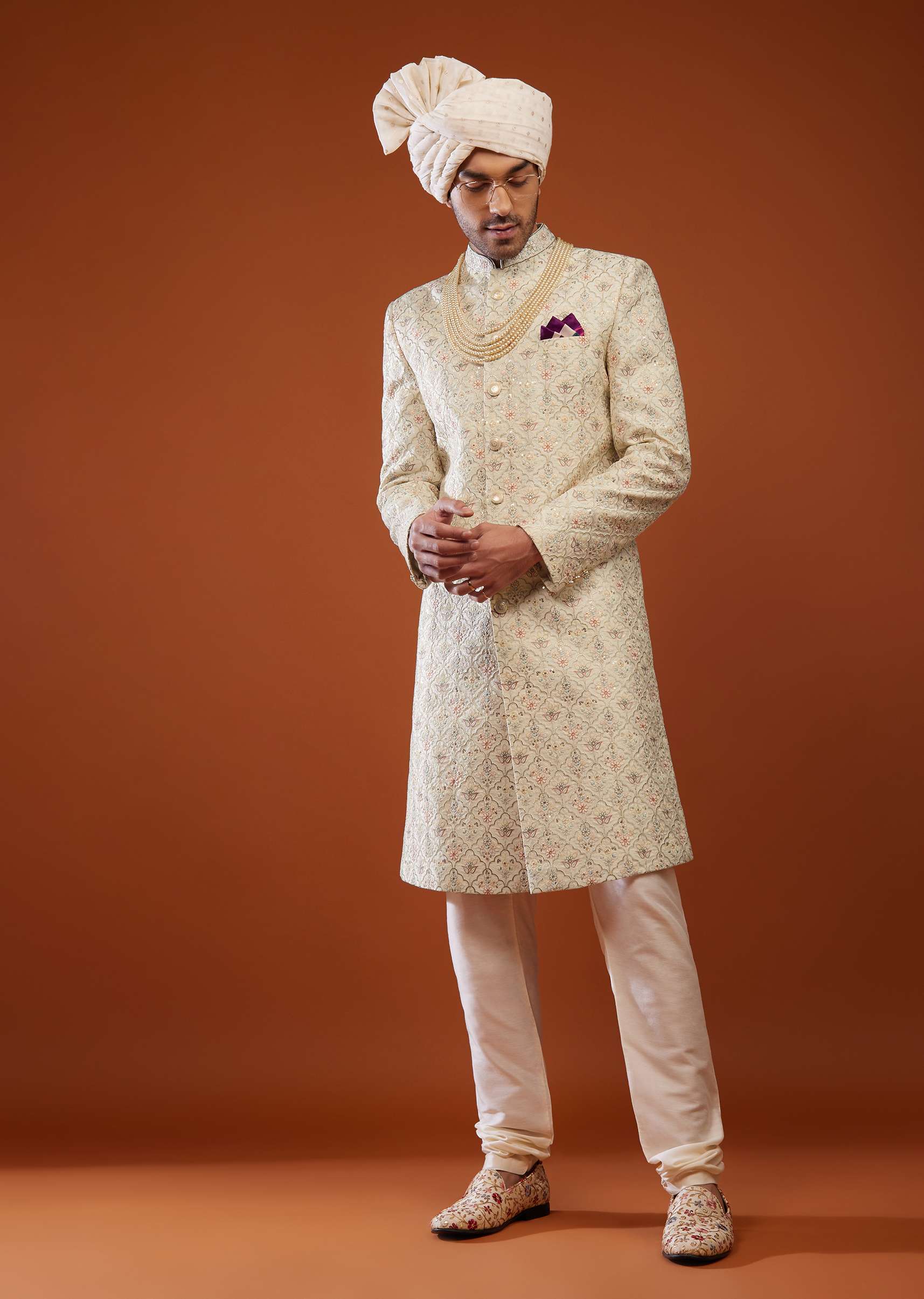 Charming Whisper White Sherwani Set fabricated in tussar silk.The Sherwani comes in delicate colorful floral embroidery all over highlighted with resham and sequence work with a button-down closure.It has beautiful... More Product Details