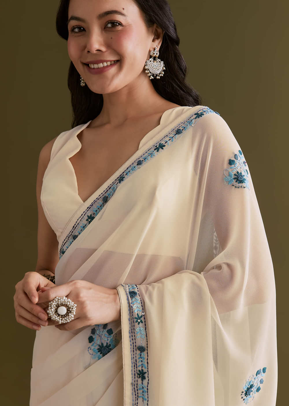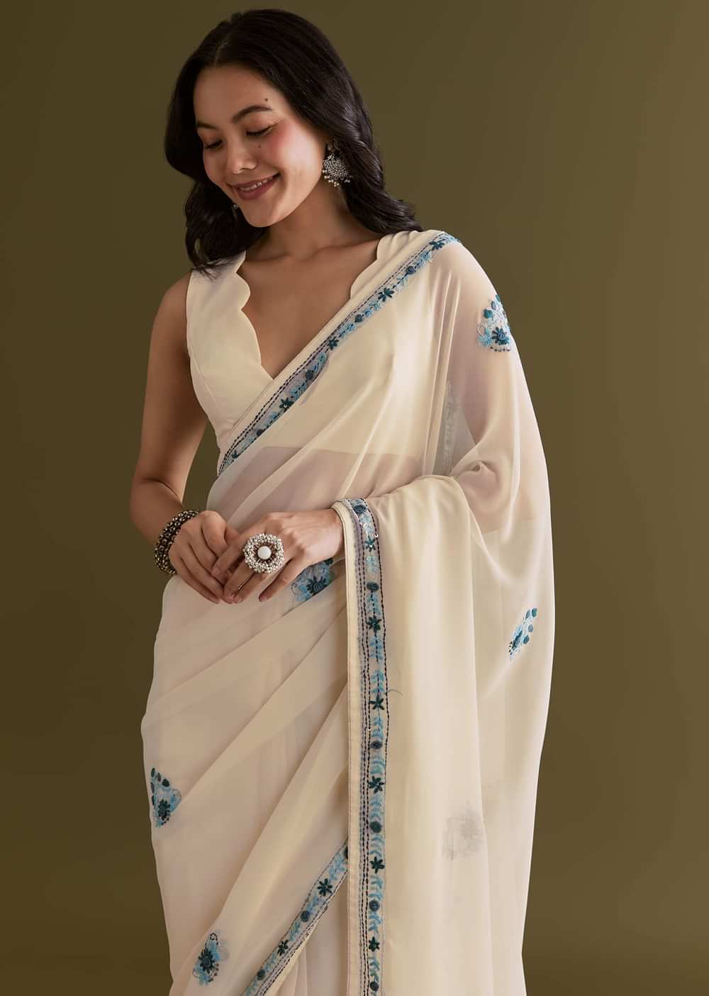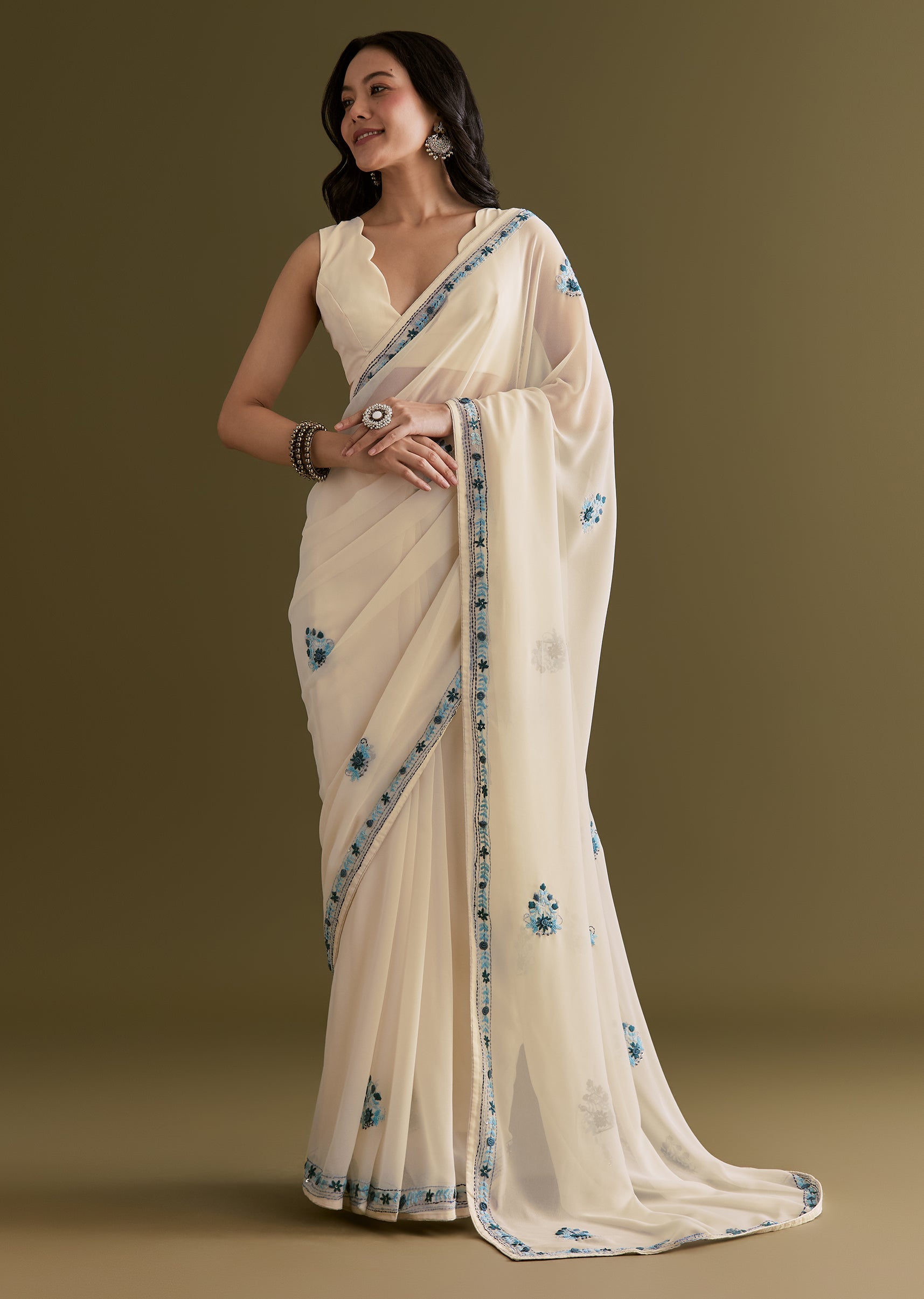 White And Blue Georgette Saree With Kashmiri Bud Embroidery