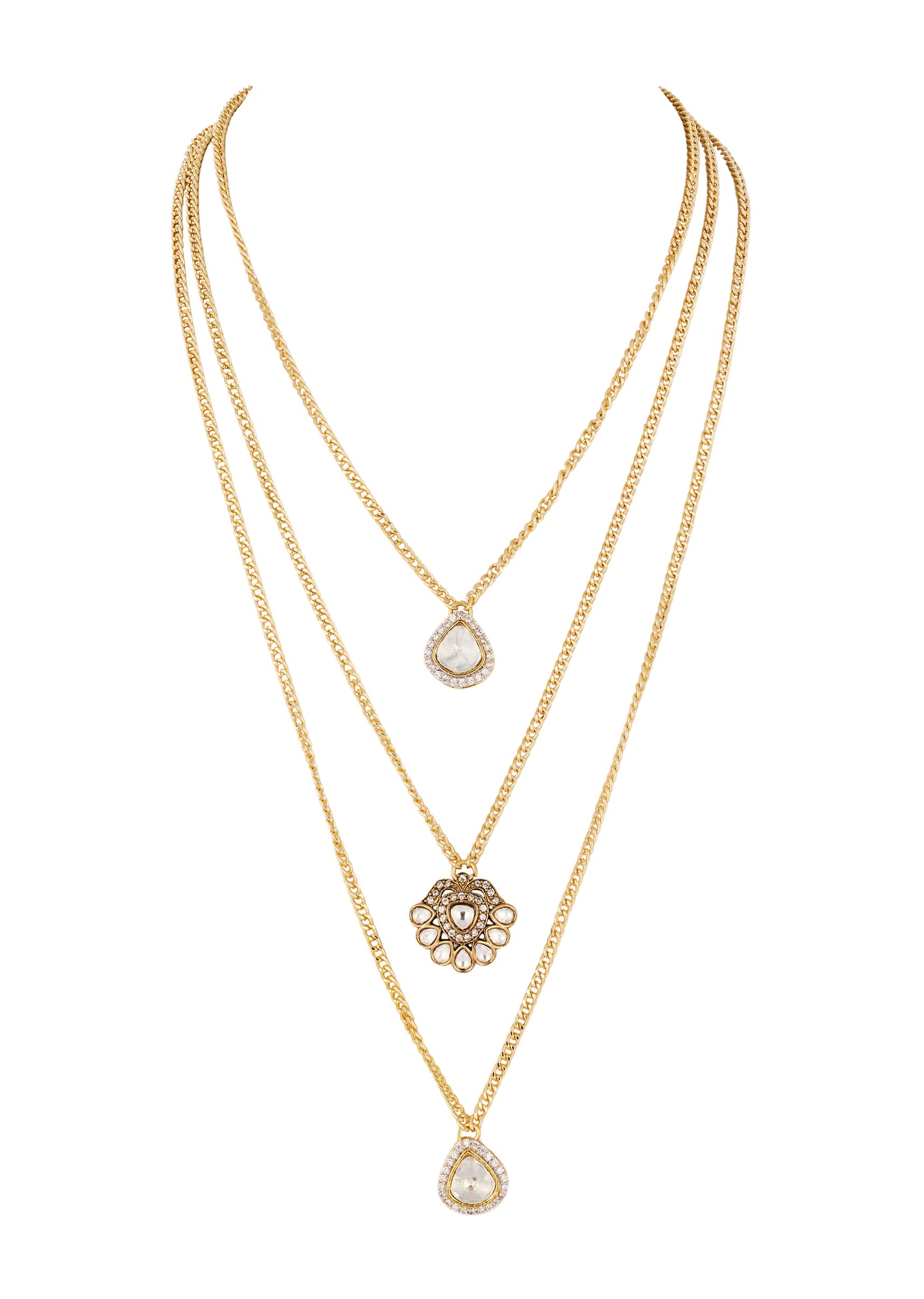 Make a regal statement with this Kundan Polki style layered necklace, crafted in a classic gold tone finish. Embellished with simulated red and green coloured stones, the layered design reflects... More Product Details