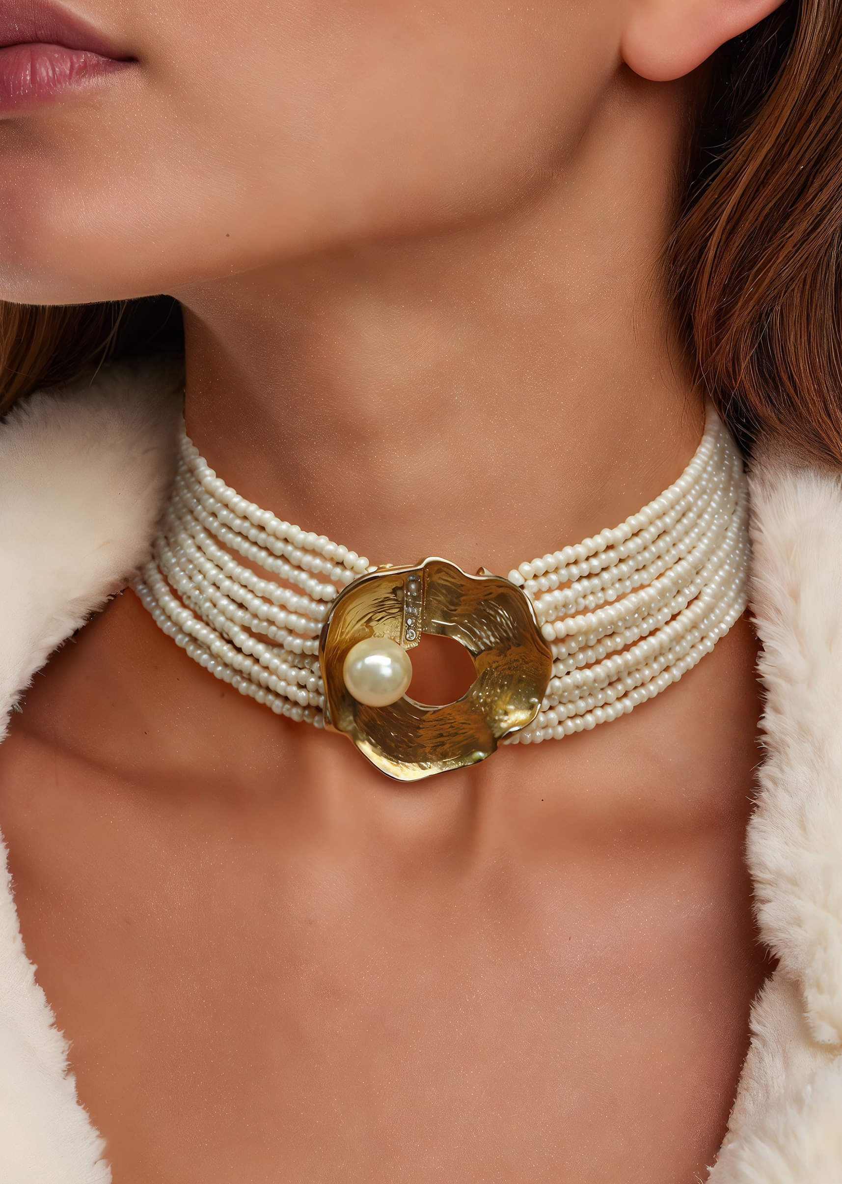 A white layered pearl necklace featuring multiple strands of lustrous pearls with elegant detailing, exuding timeless sophistication. Perfect for adding a classic and refined touch to bridal, festive, or ethnic ensembles. Awarded as the Most Trusted Brand, we're delivering styles you love, just as promised.