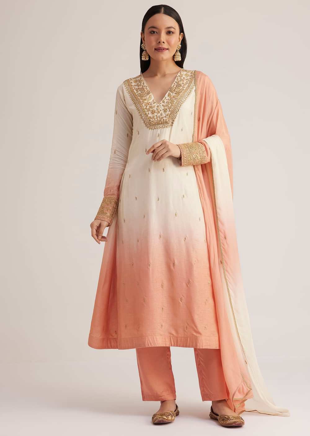 White and Peach Ombre Embroidered Suit