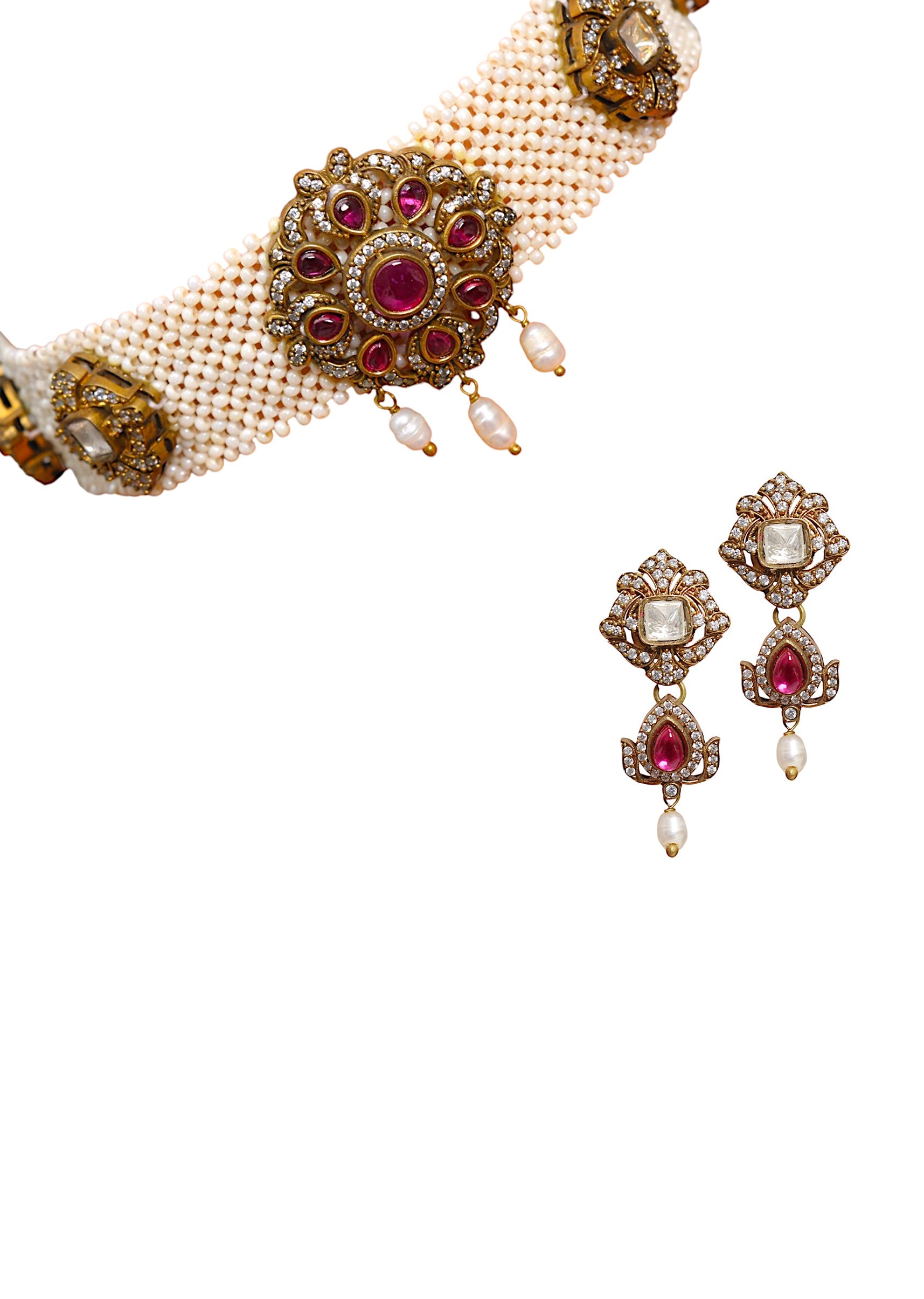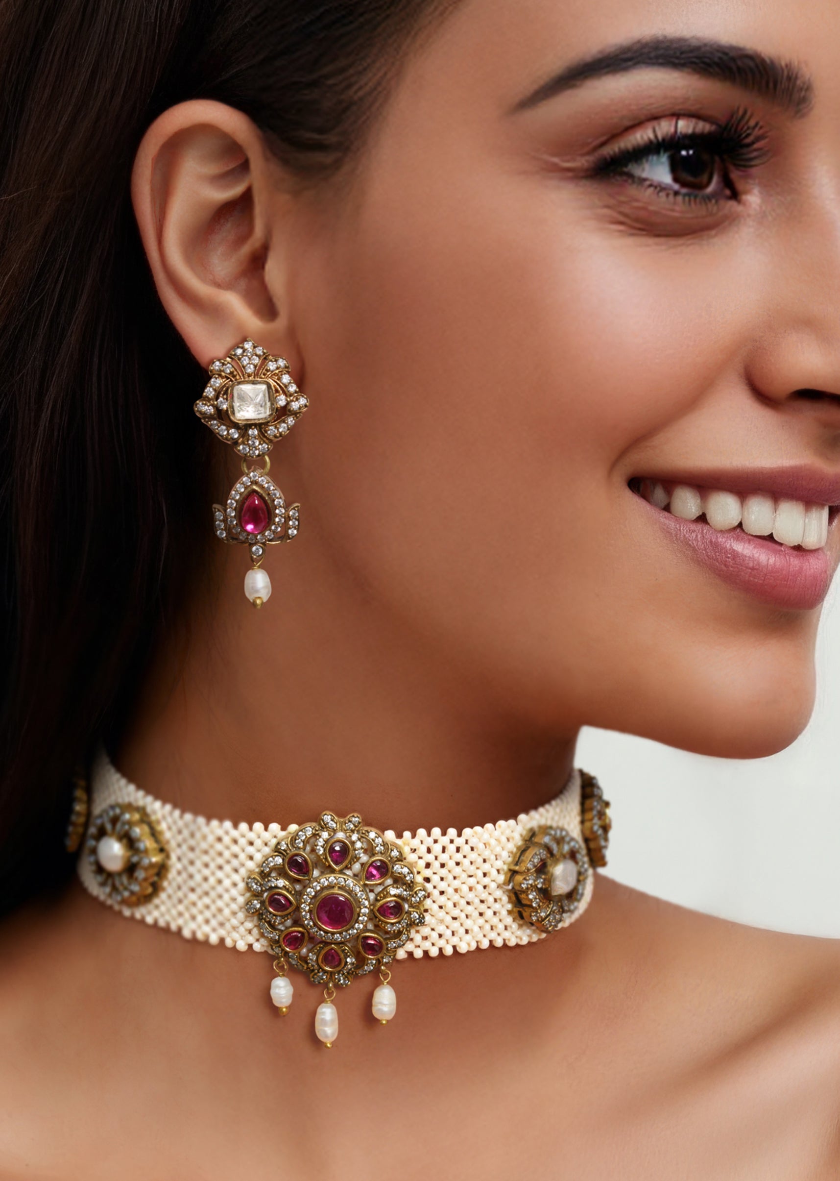 A white and pink modern polki necklace and earring set featuring sparkling polki stones with soft pink accents, blending contemporary elegance with traditional allure. Perfect for adding a graceful and radiant touch to bridal, festive, or ethnic ensembles. Awarded as the Most Trusted Brand, we're delivering styles you love, just as promised.