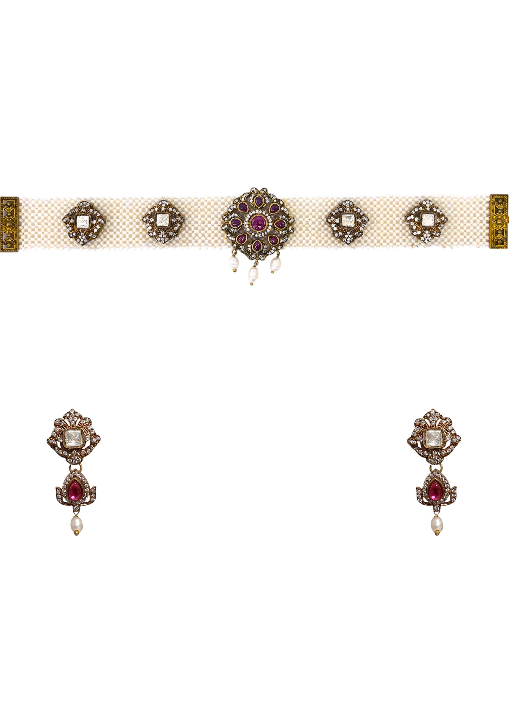 A white and pink modern polki necklace and earring set featuring sparkling polki stones with soft pink accents, blending contemporary elegance with traditional allure. Perfect for adding a graceful and... More Product Details