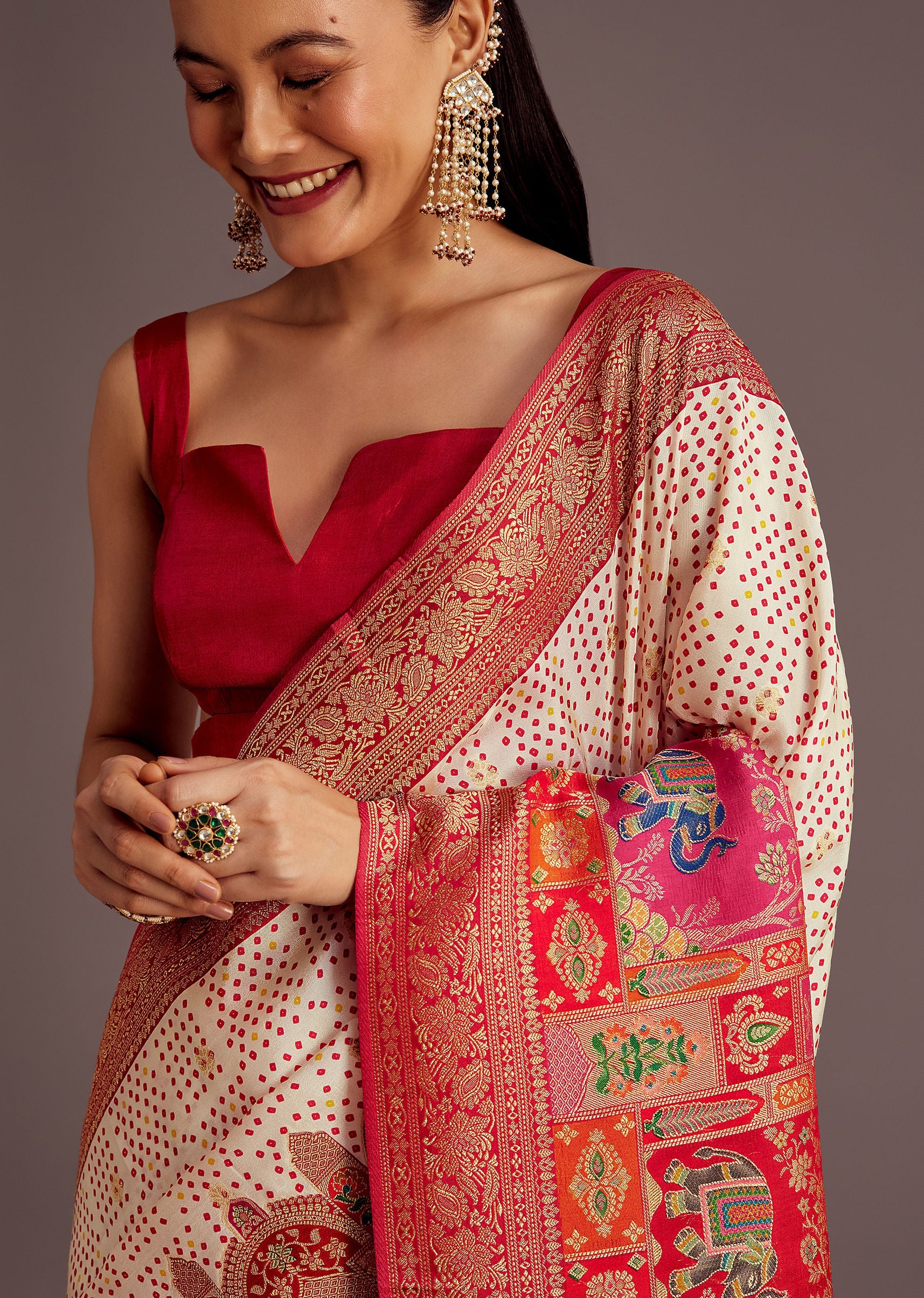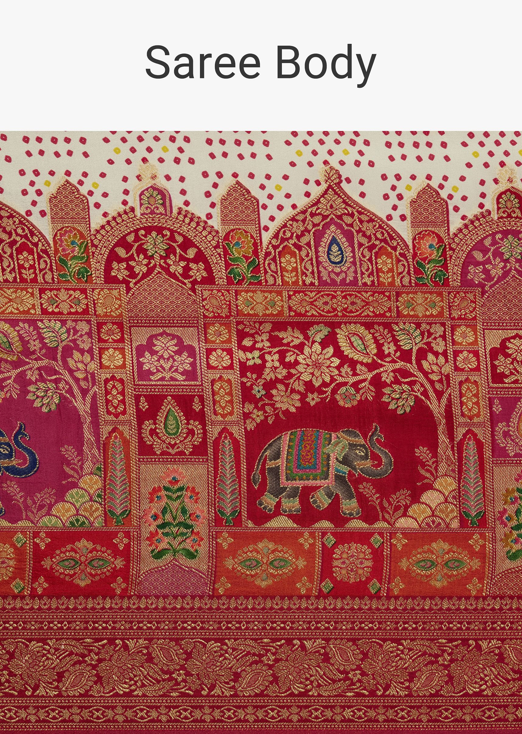 White And Red Silk Saree with Elephant Jamdani Print