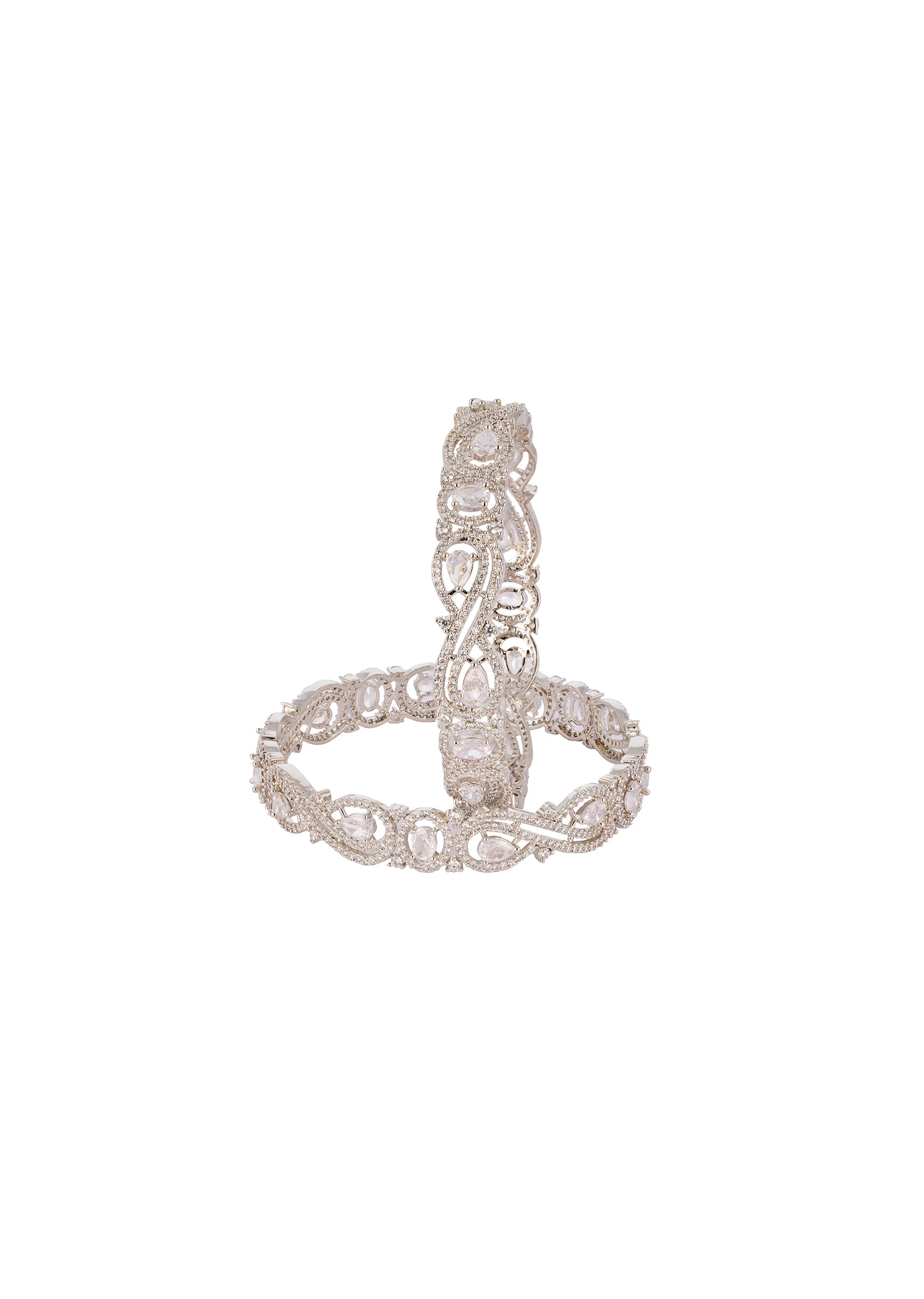Gracefully radiant, this white and silver CZ diamond look bangle set is crafted in durable rhodium plated brass with a long lasting anti tarnish finish. The shimmering CZ detailing paired... More Product Details
