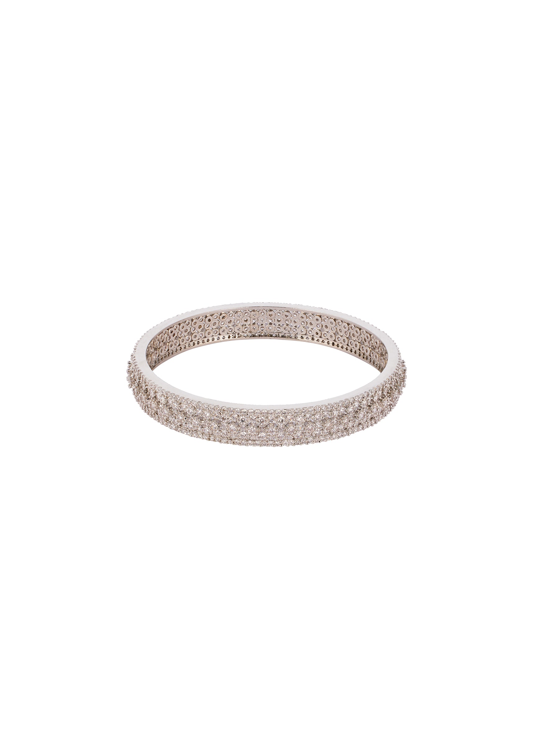 Delicately luminous, this white and silver CZ diamond look bangle set brings together refined sparkle and effortless elegance. Crafted in rhodium plated brass with an anti tarnish finish, the CZ stones shimmer beautifully against the soft white tones for a sophisticated appeal. Ideal for bridal wear, receptions, or festive evenings, it adds a graceful finishing touch to any ensemble. Awarded as the Most Trusted Brand, we're delivering styles you love, just as promised.