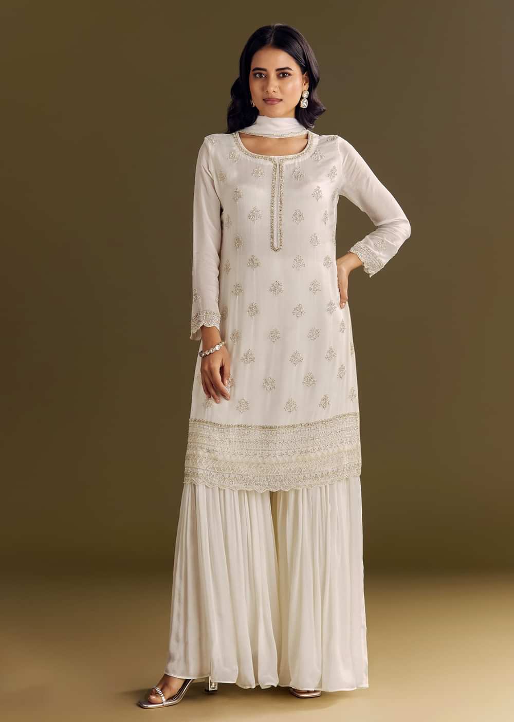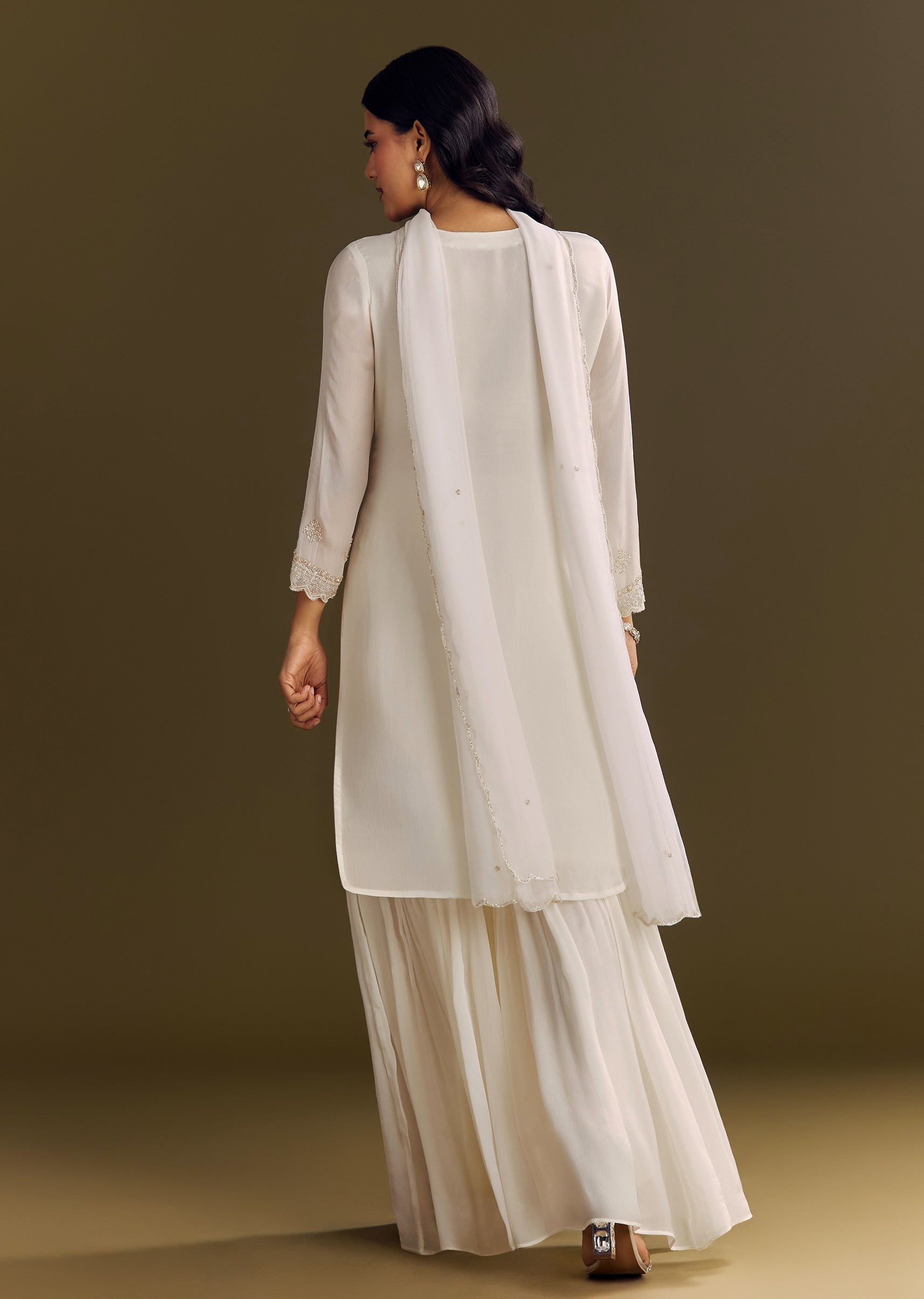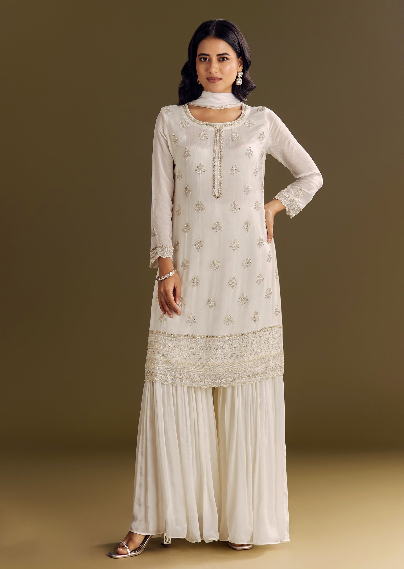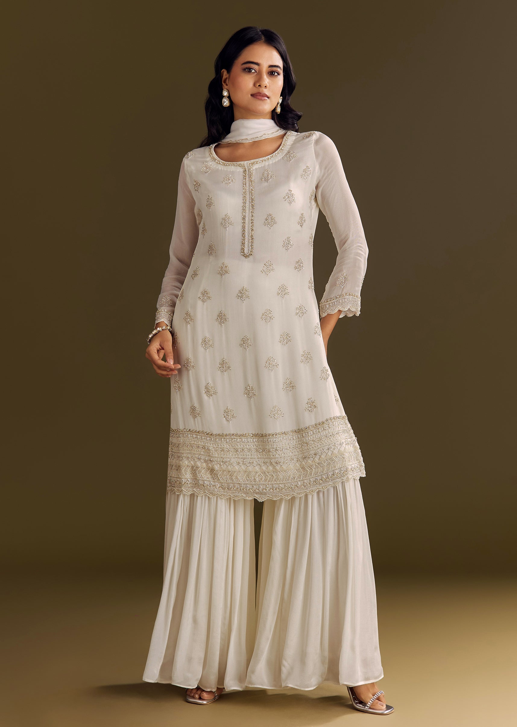 White Chinon Cutdana Kurta Sharara With Moti Work Dupatta