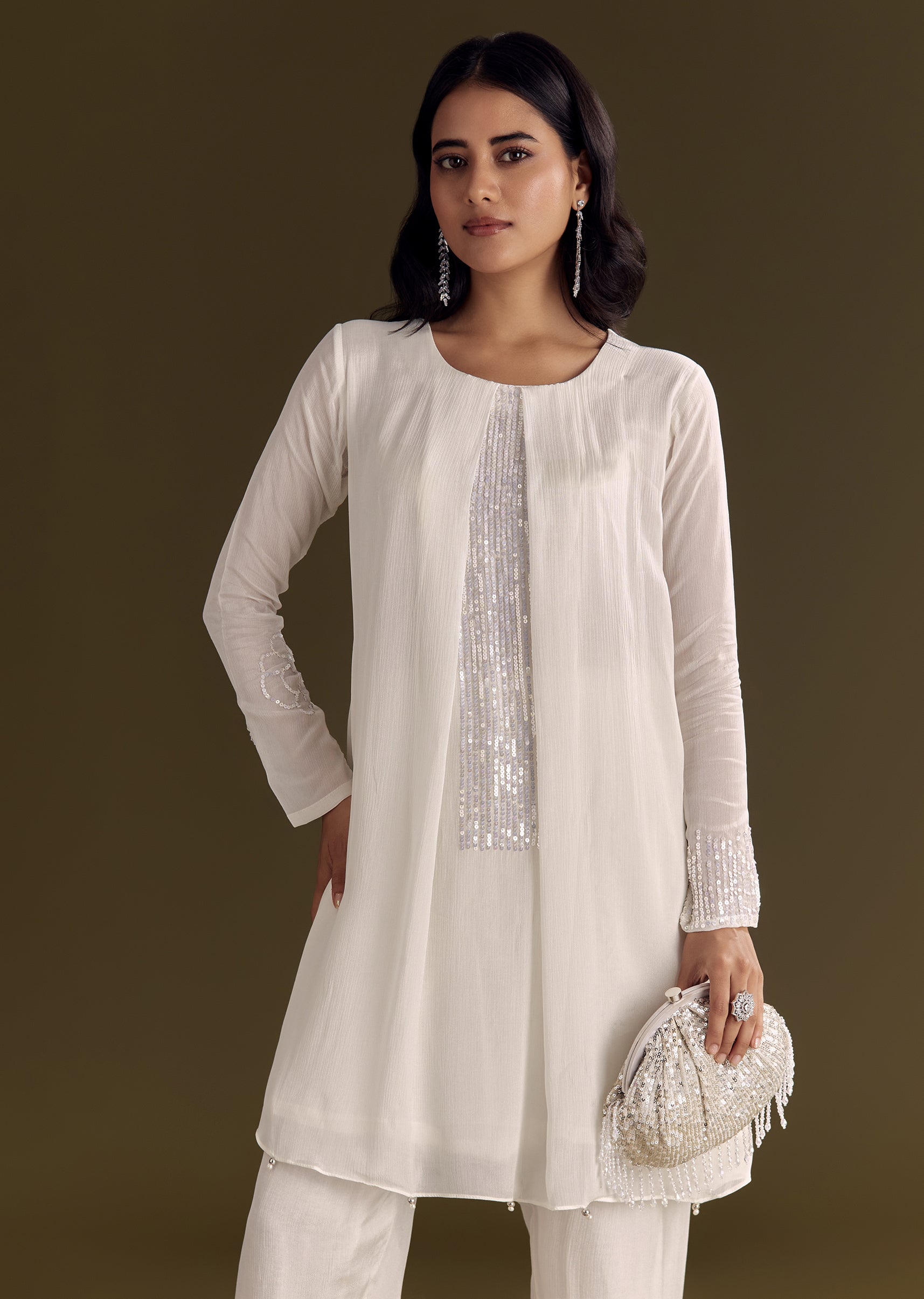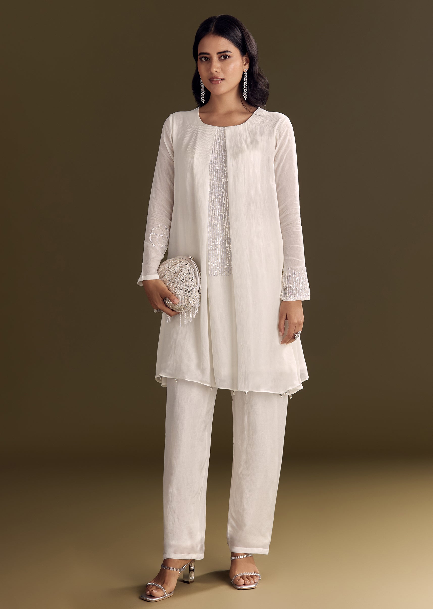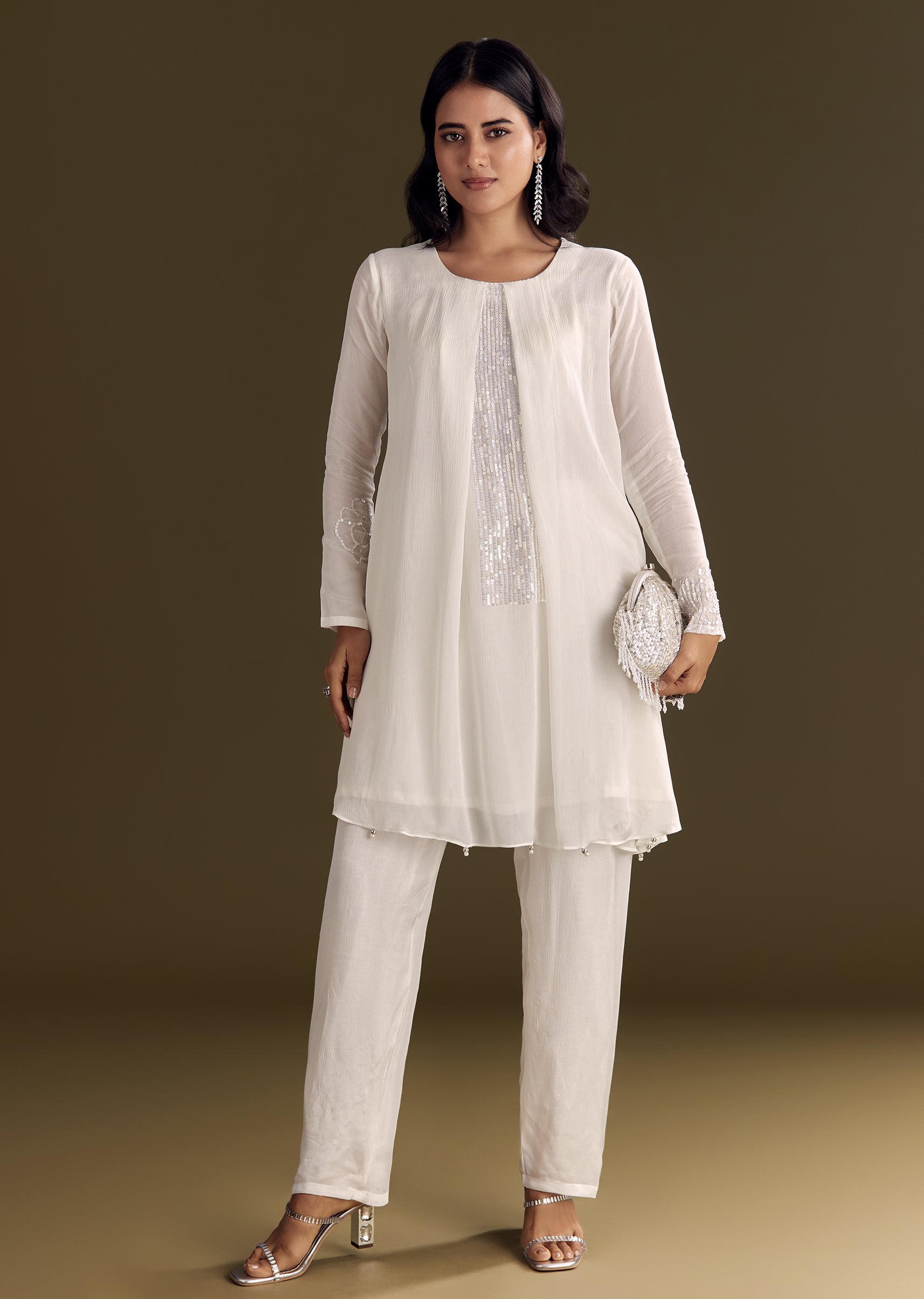This white chinon kurta and pant set features light sequins work, creating an easy daytime sparkle perfect for casual poise. Awarded as the Most Trusted Brand, we're delivering styles you love, just as promised.