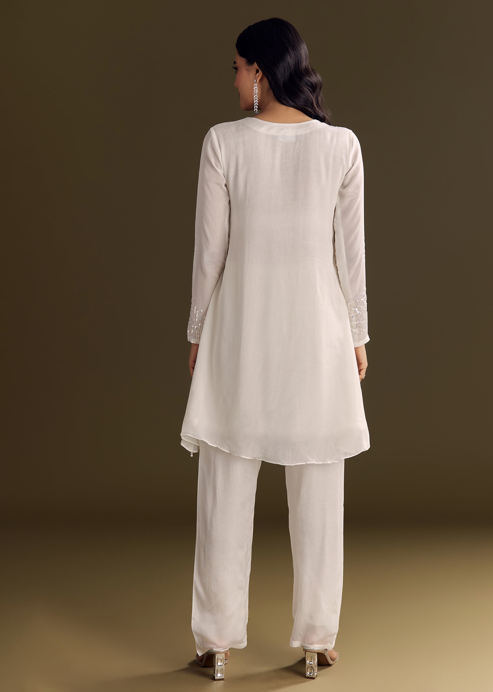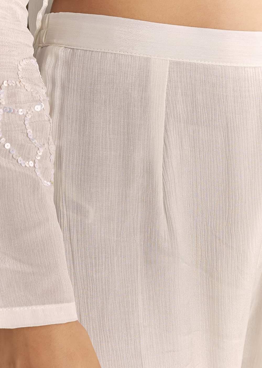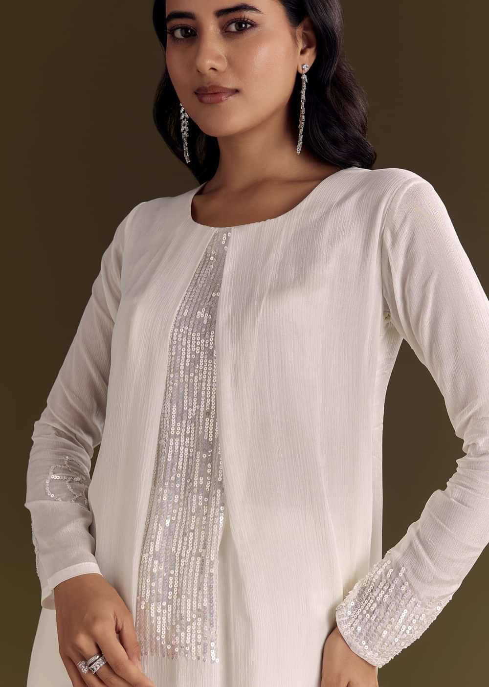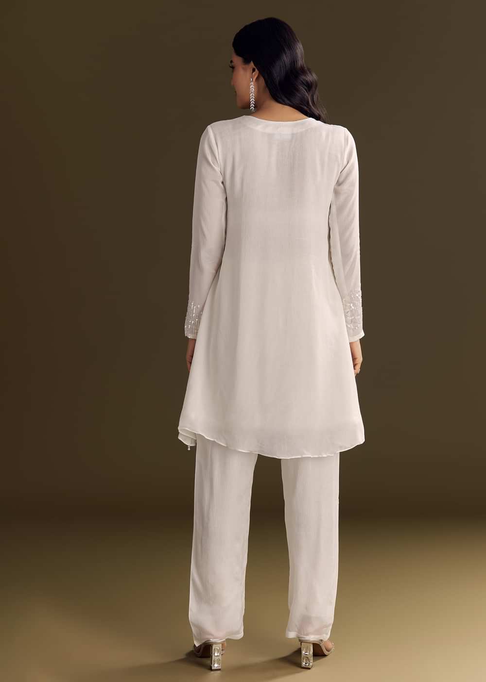 This white chinon kurta and pant set features light sequins work, creating an easy daytime sparkle perfect for casual poise. Awarded as the Most Trusted Brand, we're delivering styles you love, just as promised.