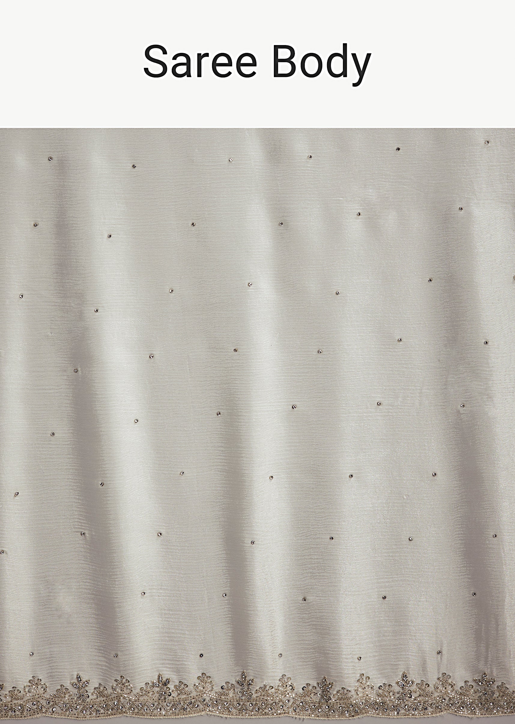 Minimal yet striking, this white chinon saree feels ethereal. Stones embellish the body while the borders shimmer with sequins and cutdana. It is a timeless pick for special gatherings when... More Product Details
