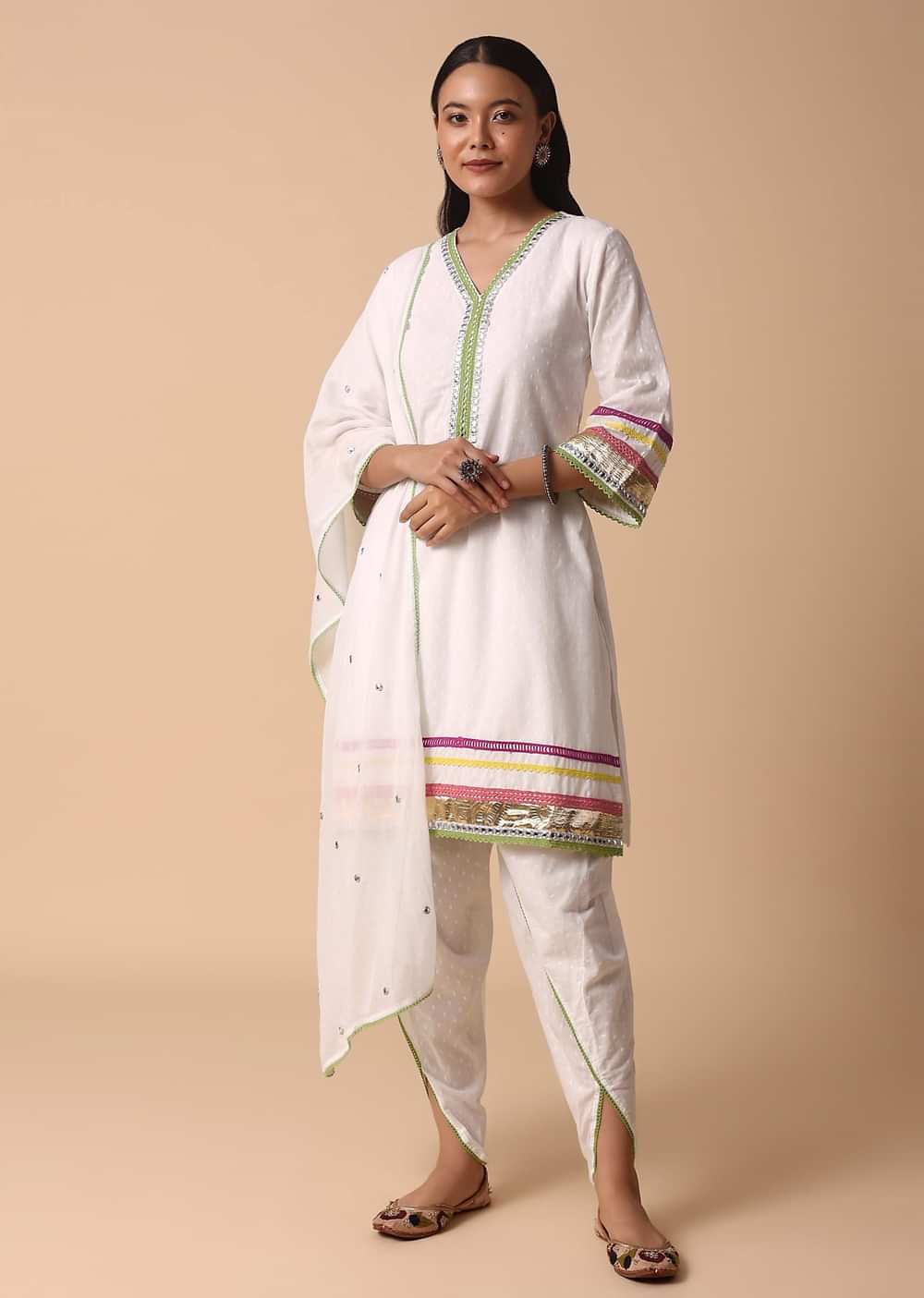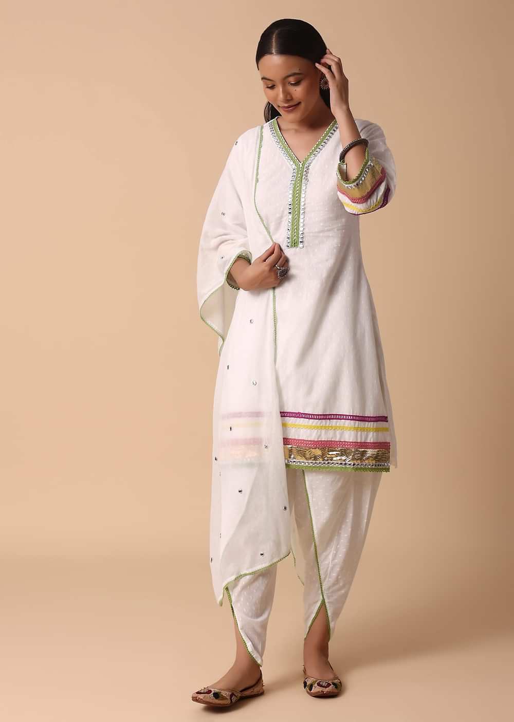 White Cotton Kurta Dhoti SetThis outfit is made from cotton fabric and adorned with mirror embroidery work. Style this set for casual outing and brunchs.The ensemble comes with a kurta... More Product Details