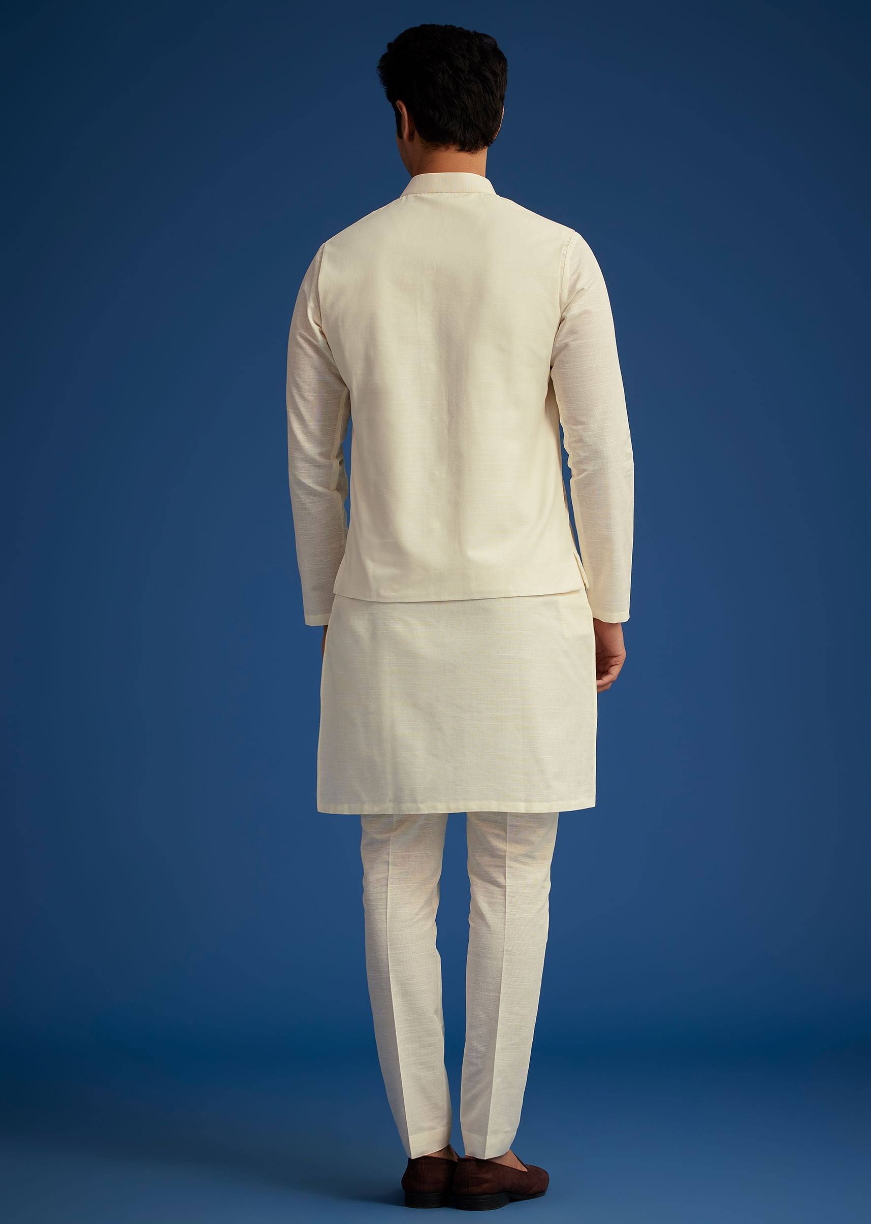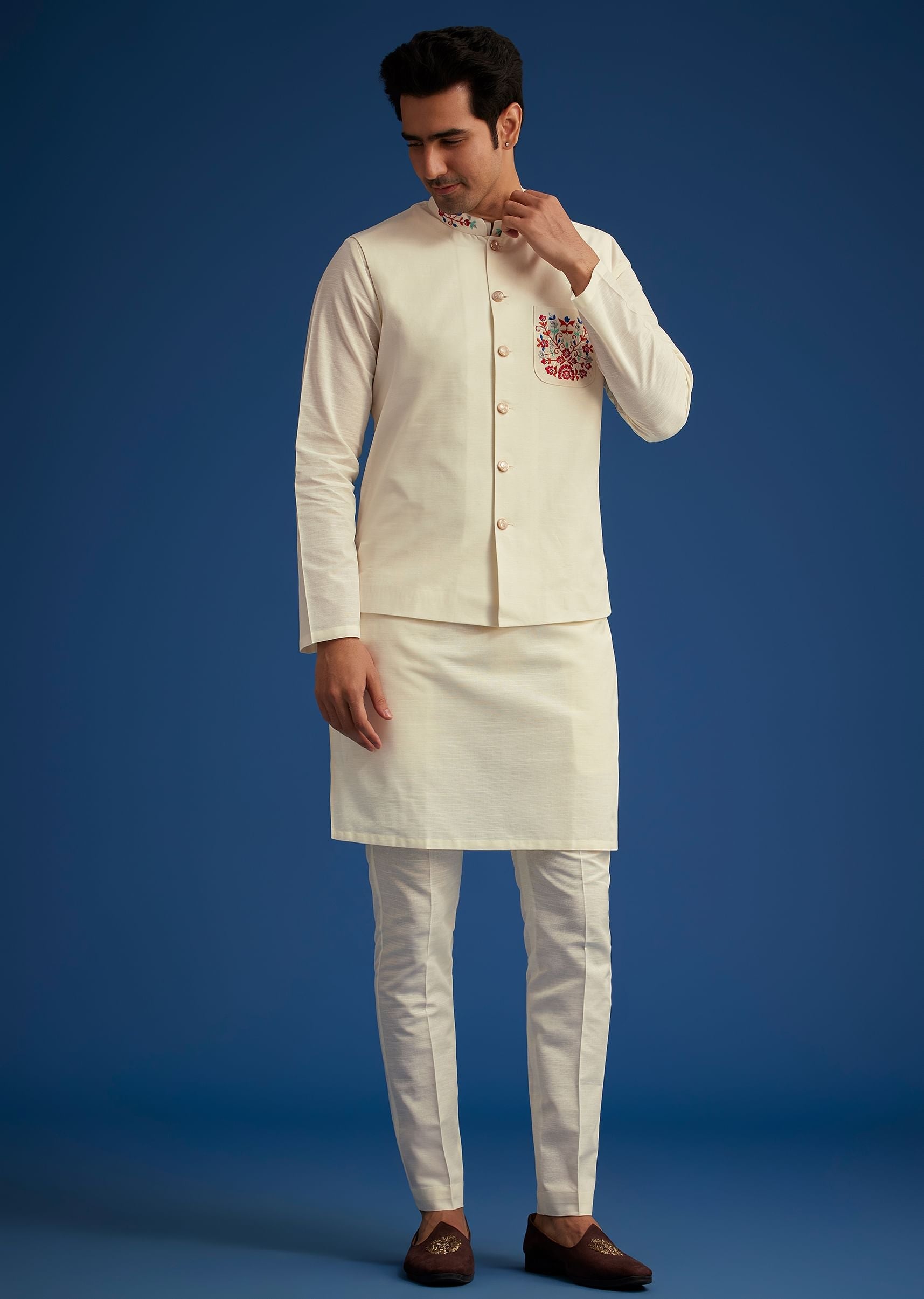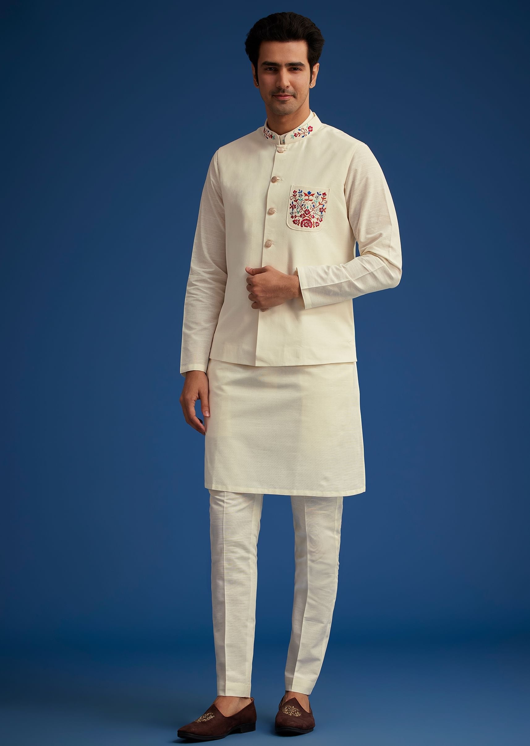 Pair it with tan or embroidered mojris and a sleek wristwatch for a polished festive look.