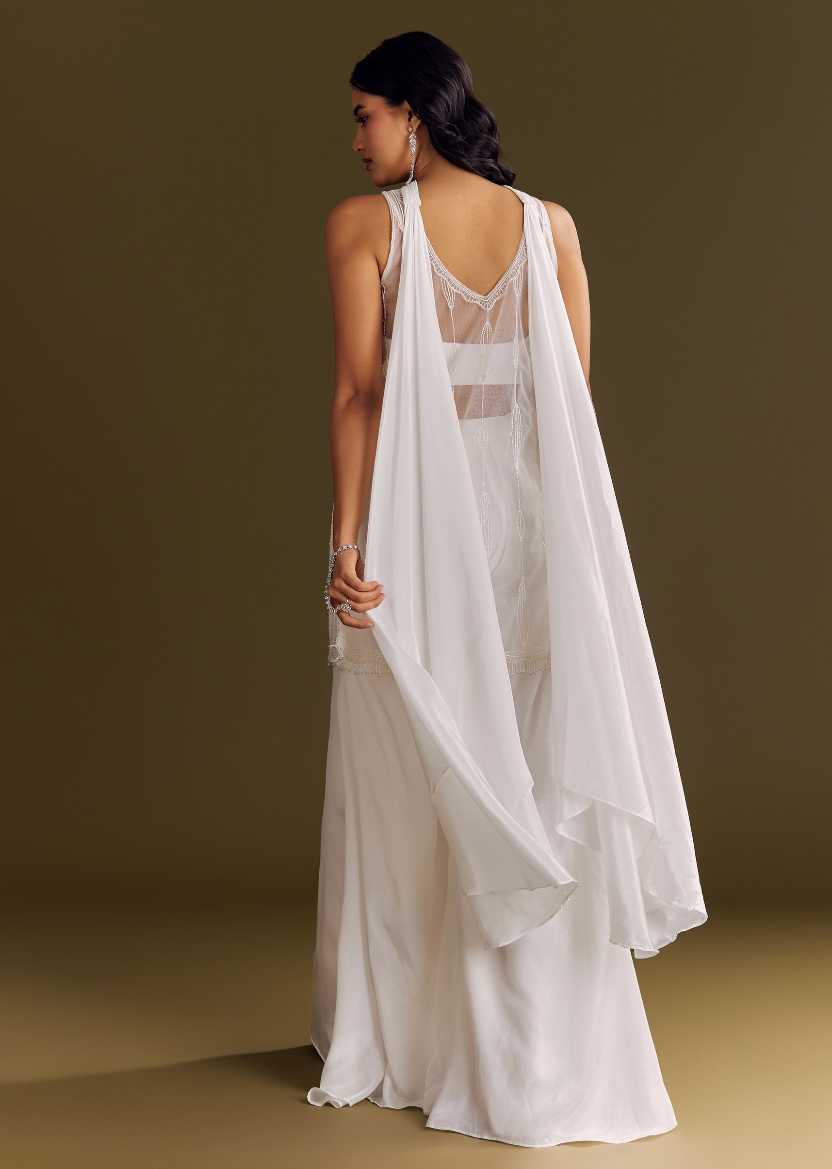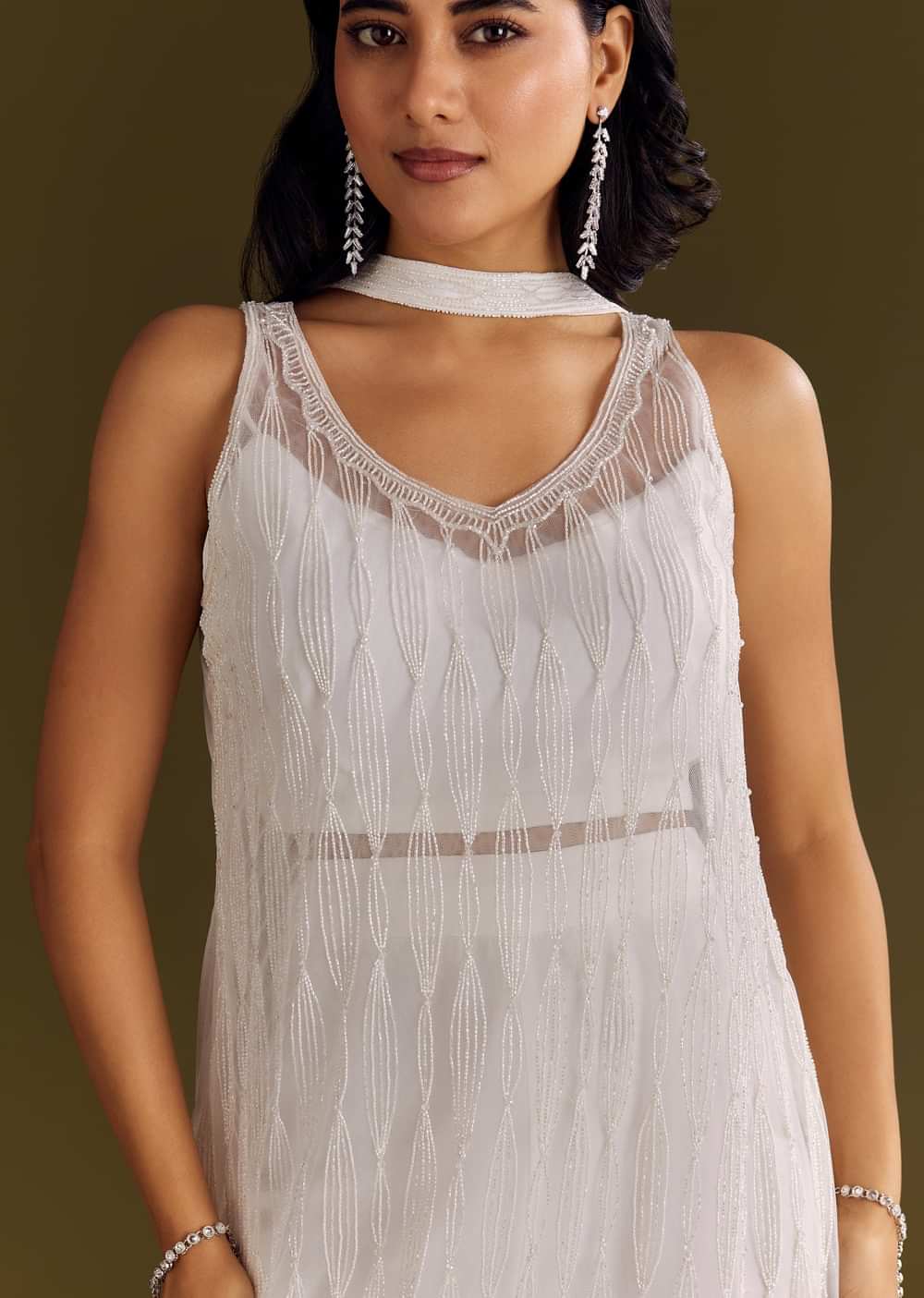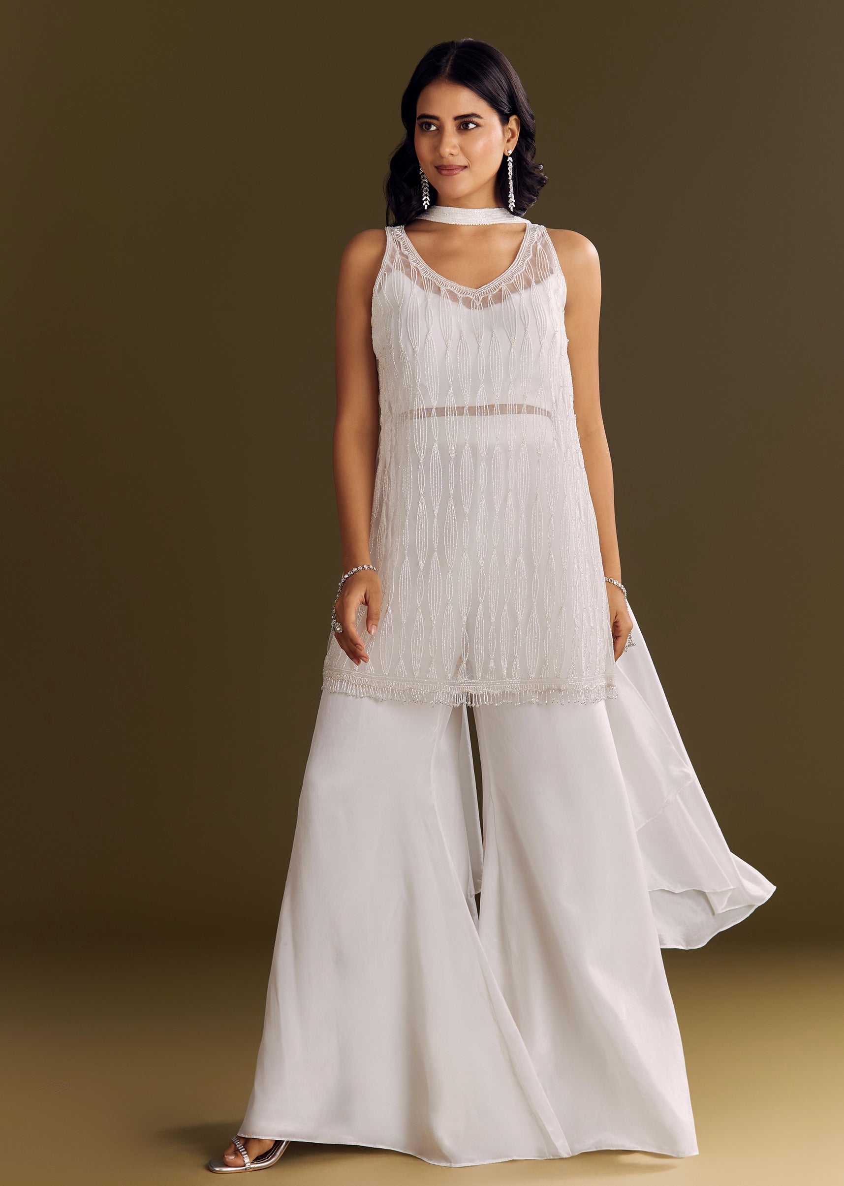 A soft white kurta in crepe detailed with cut dana work, styled with a net choker dupatta that brings graceful geometry to a flowing silhouette. Standard length of Palazzo is... More Product Details