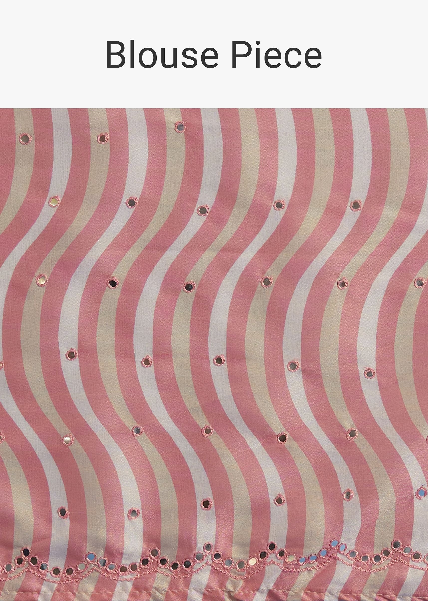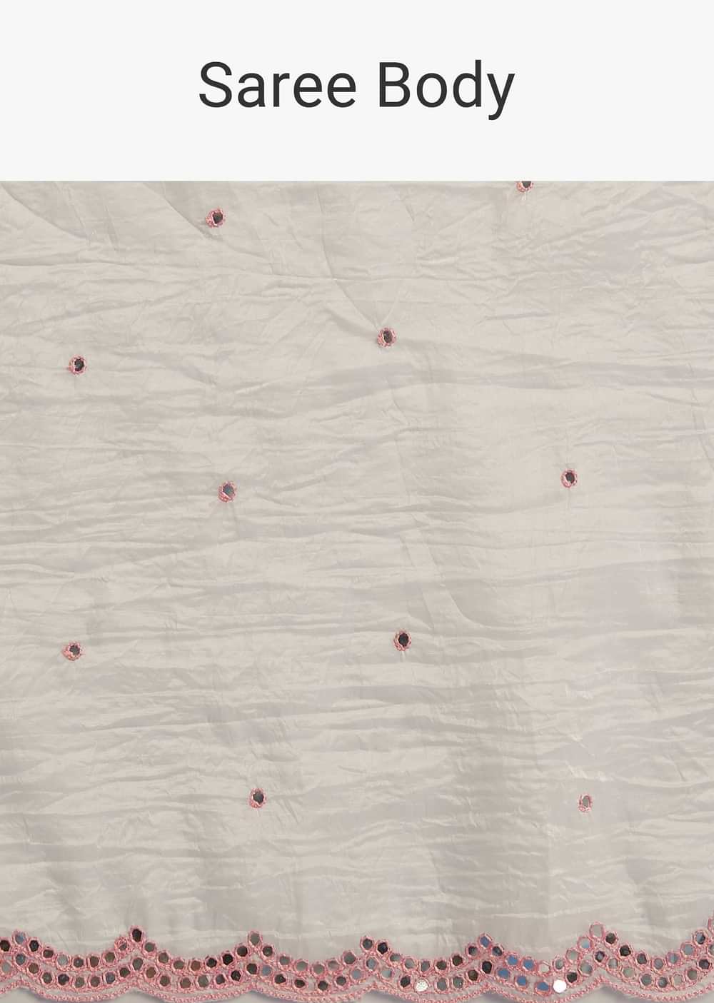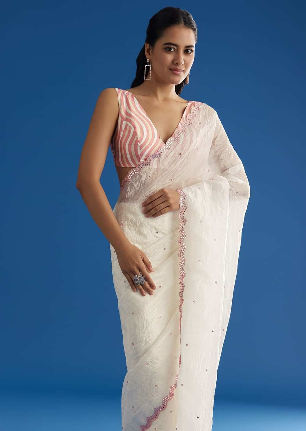 White Crepe Silk Saree With Mirror Scallop Border And Pink Contrast Blouse