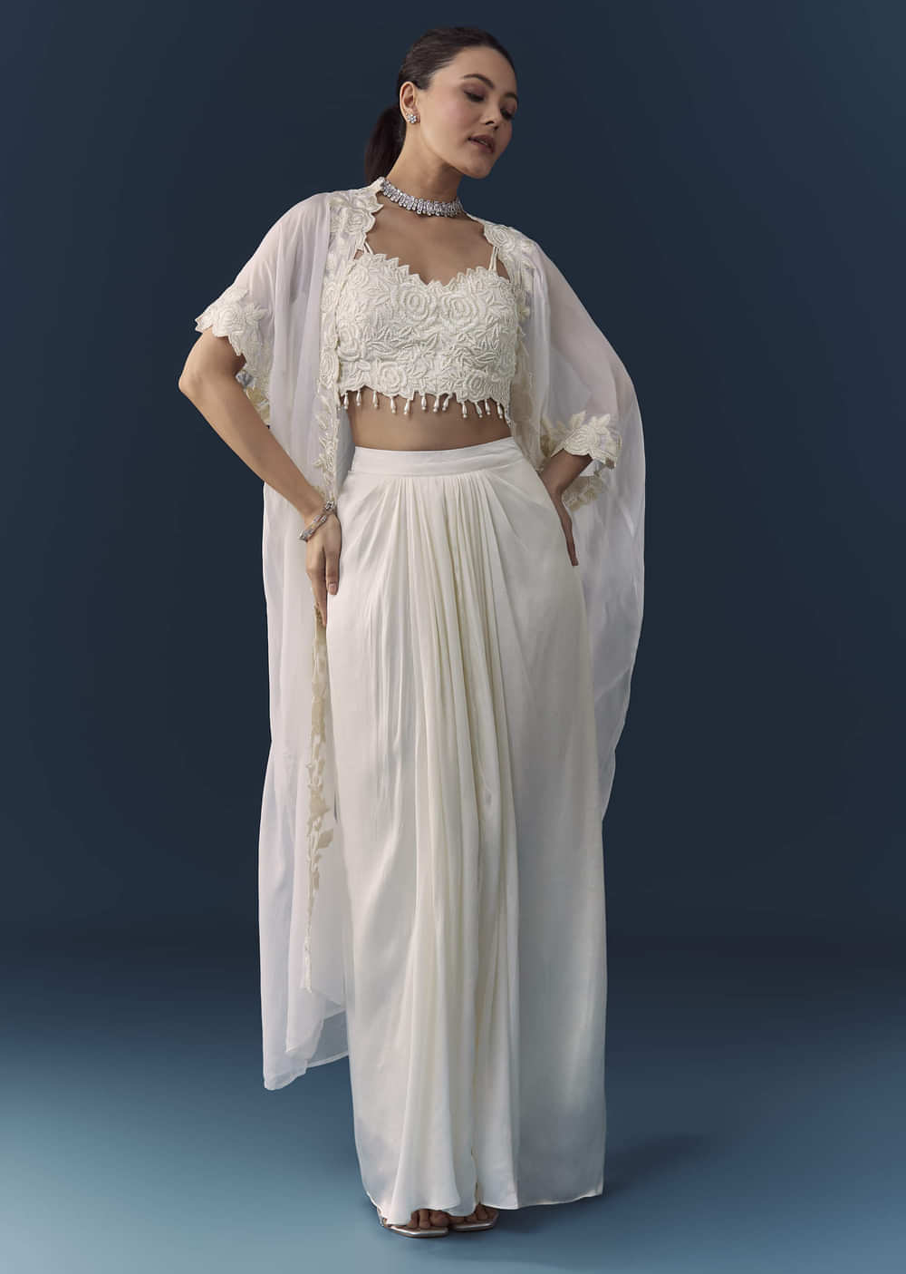 Step into refined elegance with this white crop top and draped skirt set, paired with a beautifully detailed cape featuring exquisite cutdana and resham embroidery. The pristine white hue exudes... More Product Details