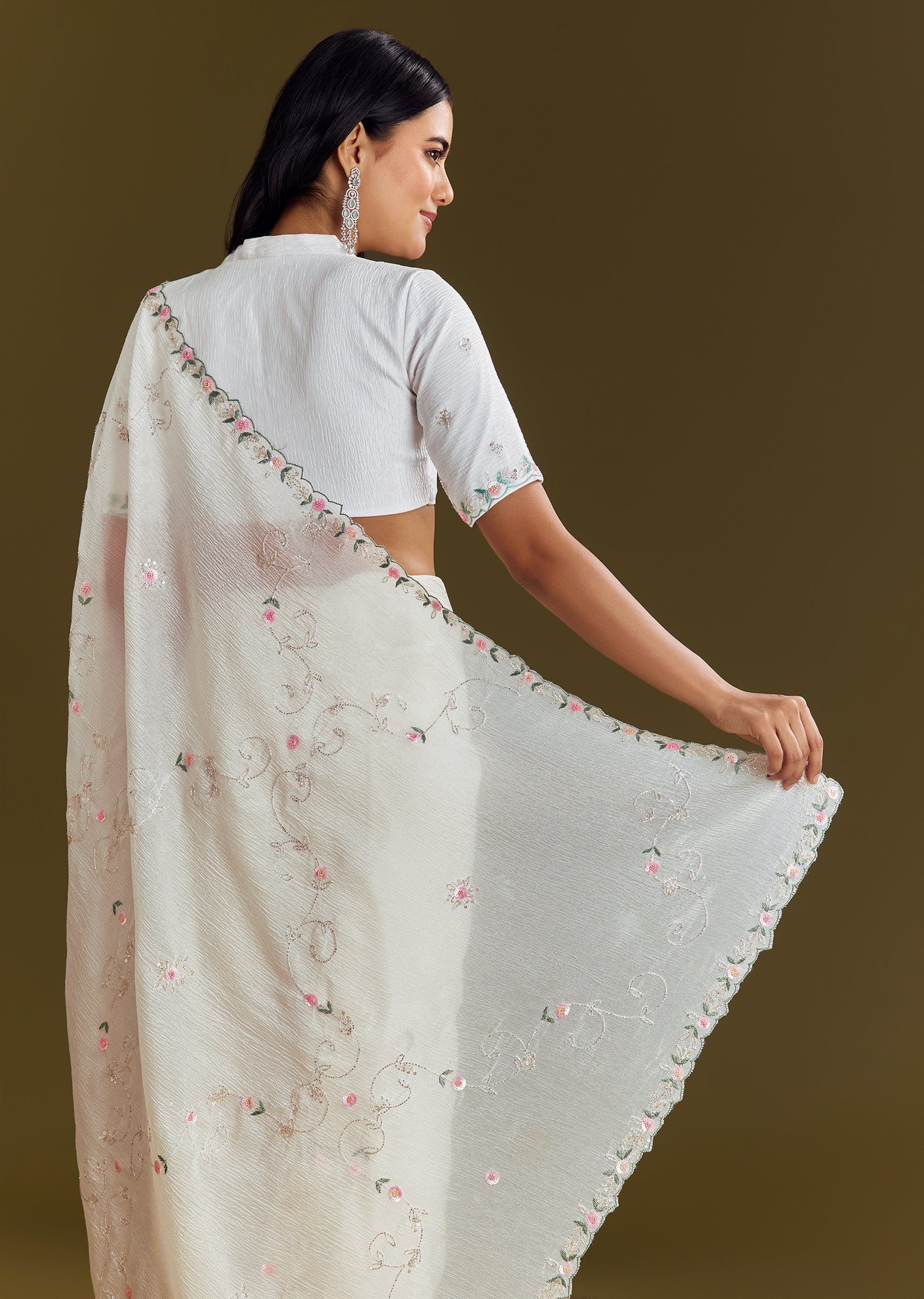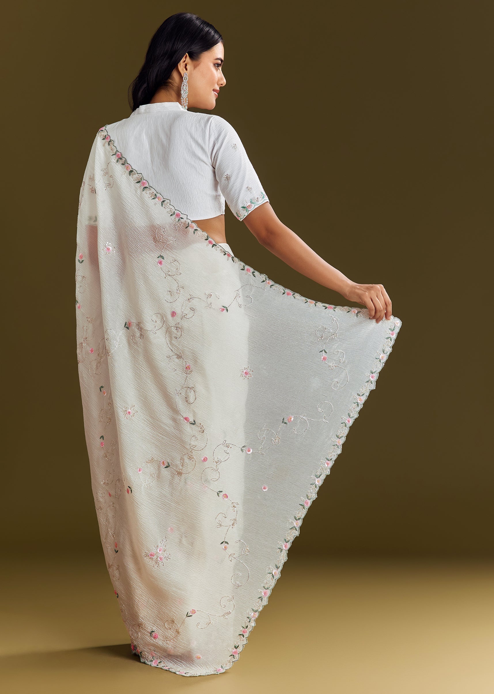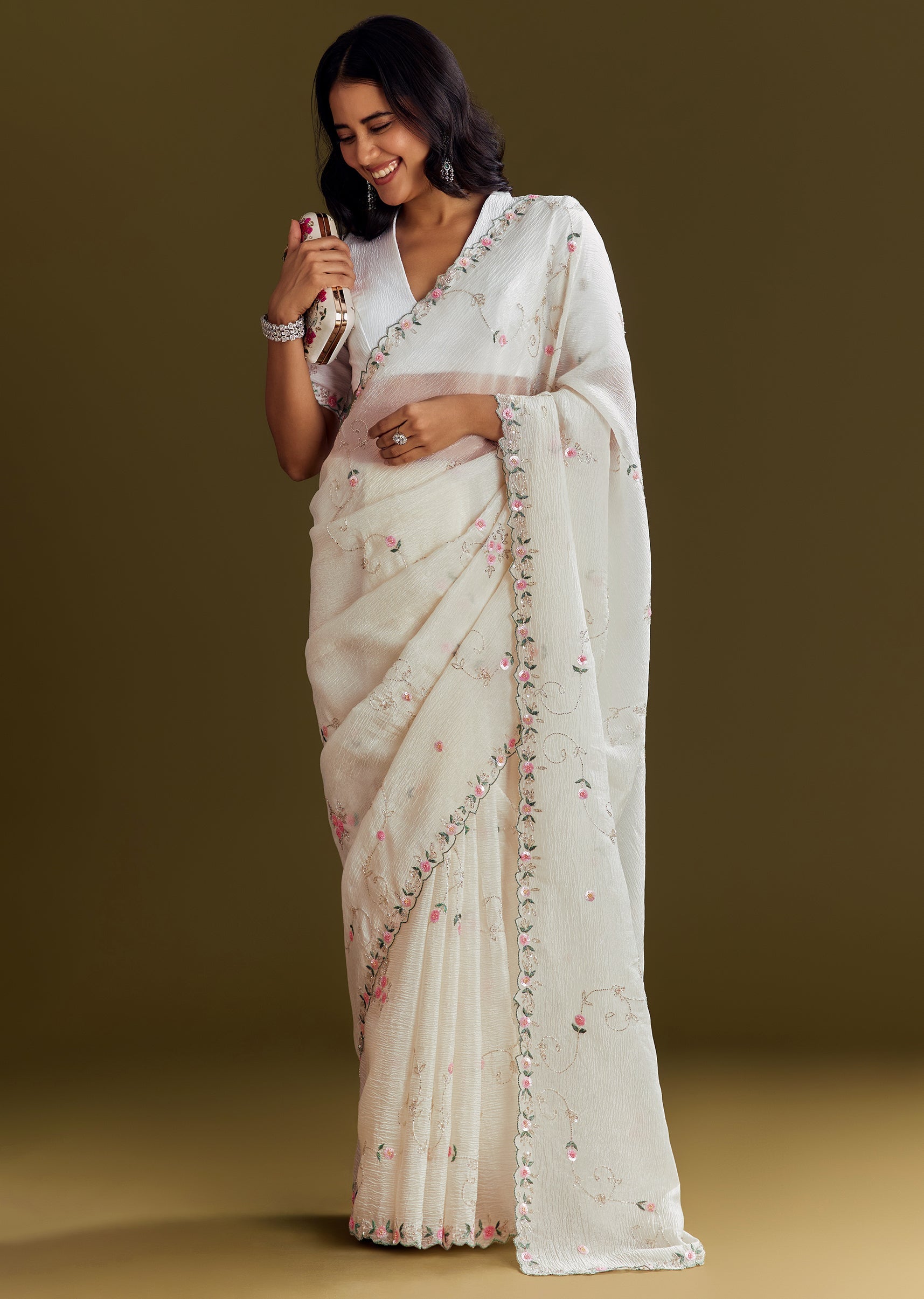 White Crush Tissue Saree With Cutdana And Beads Scallop Border