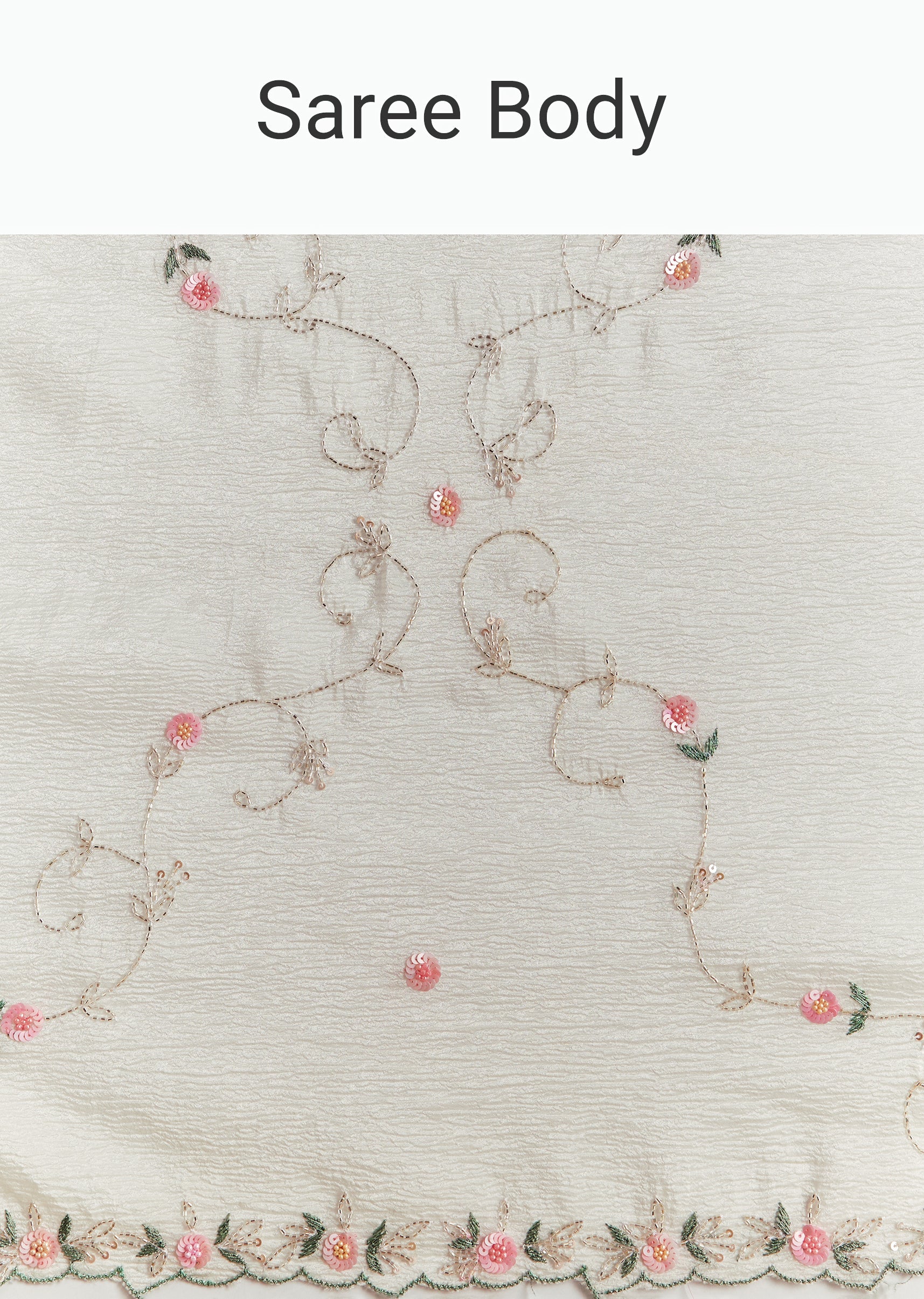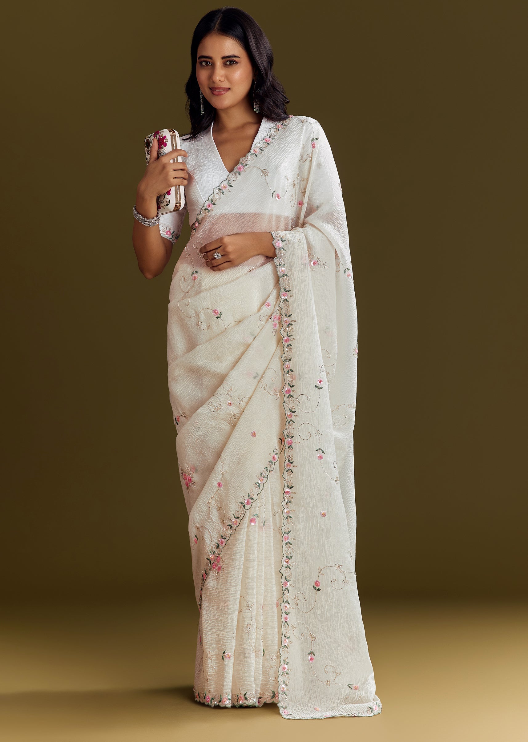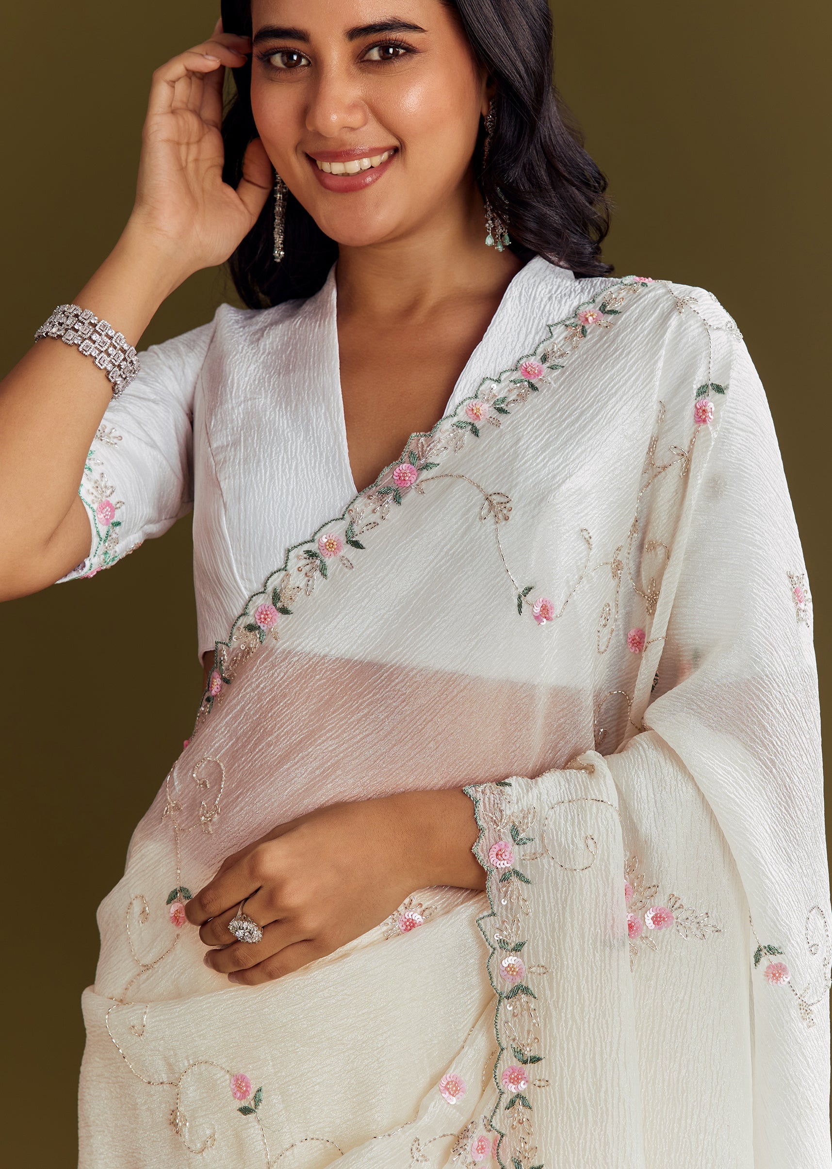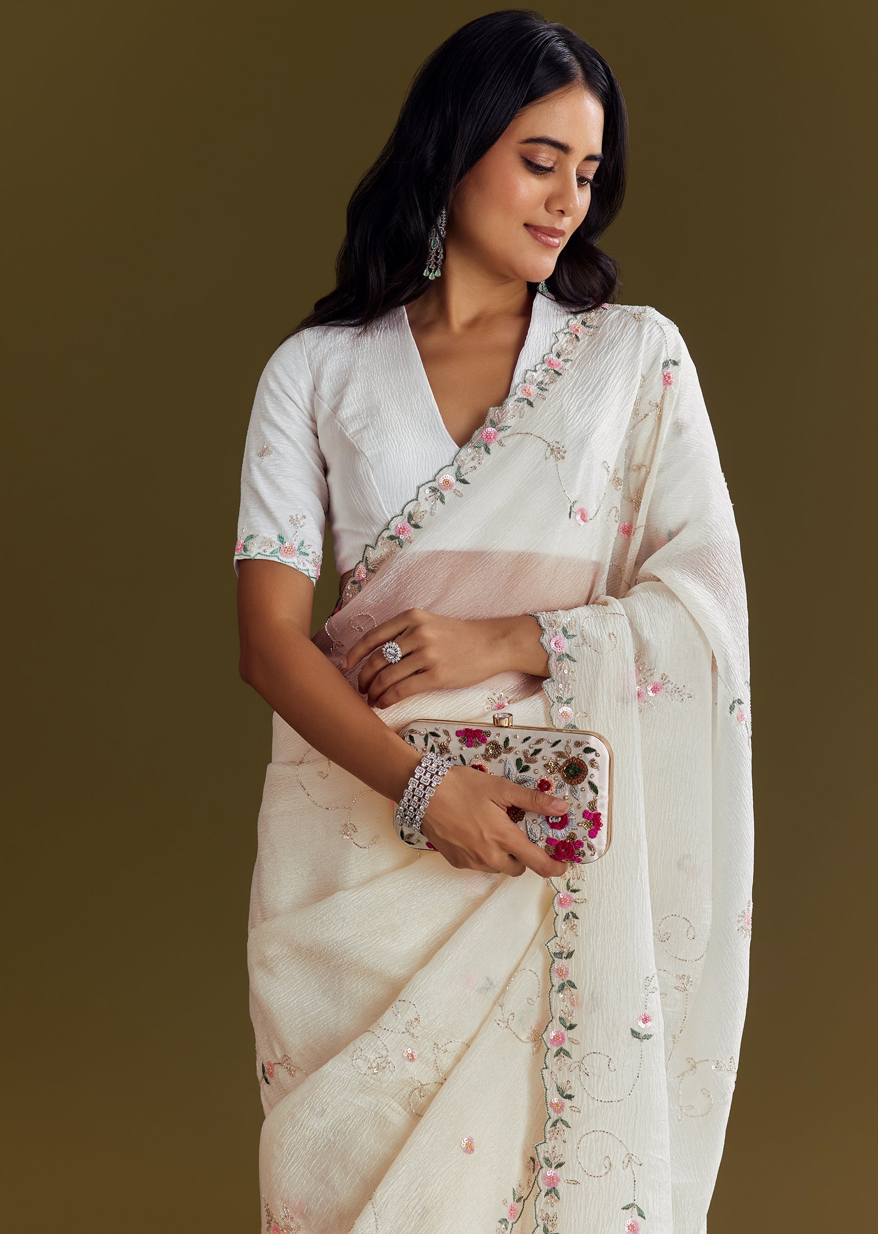 White Crush Tissue Saree With Cutdana And Beads Scallop Border