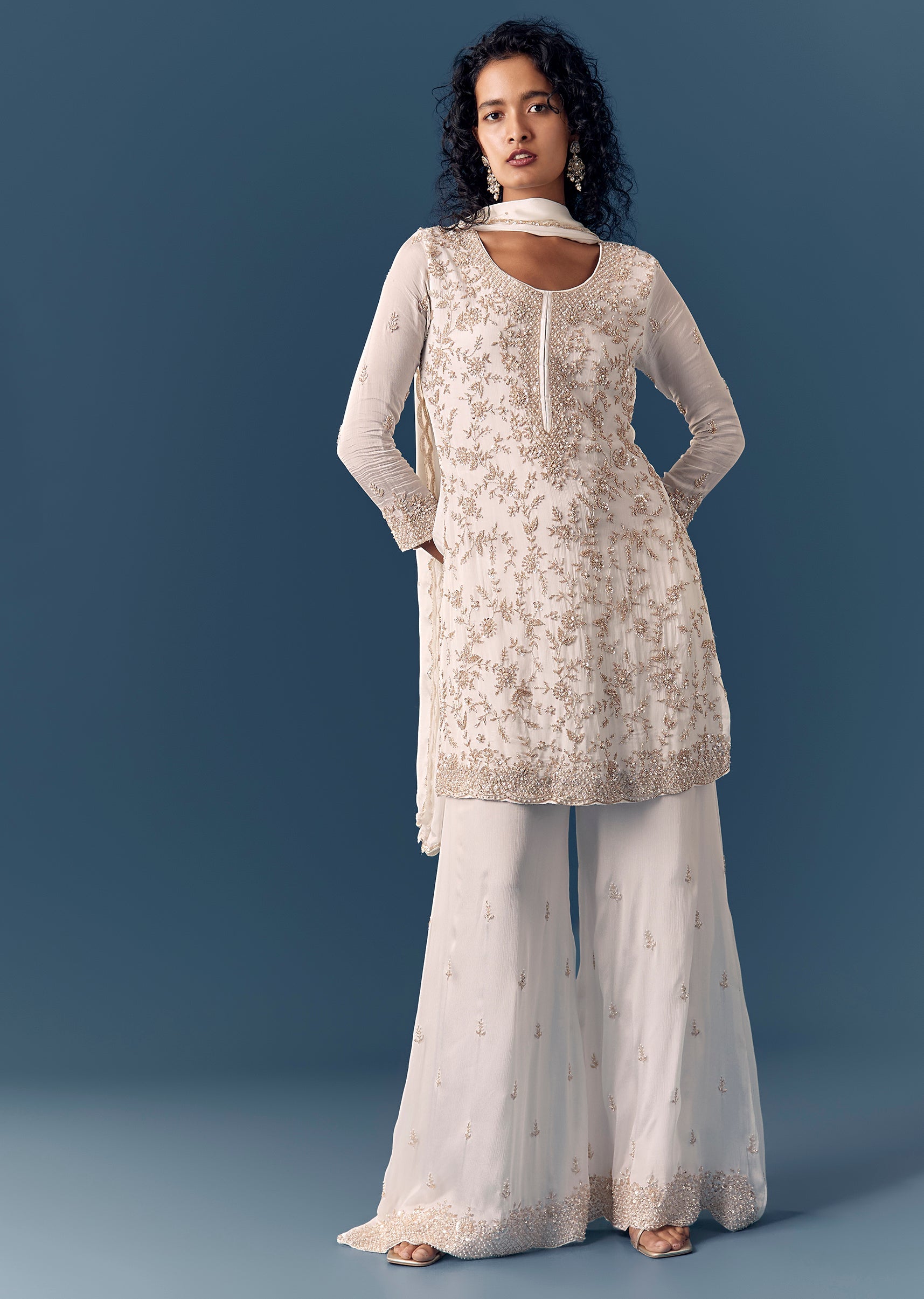 White Cut Dana Kurta Palazzo Set With Dupatta