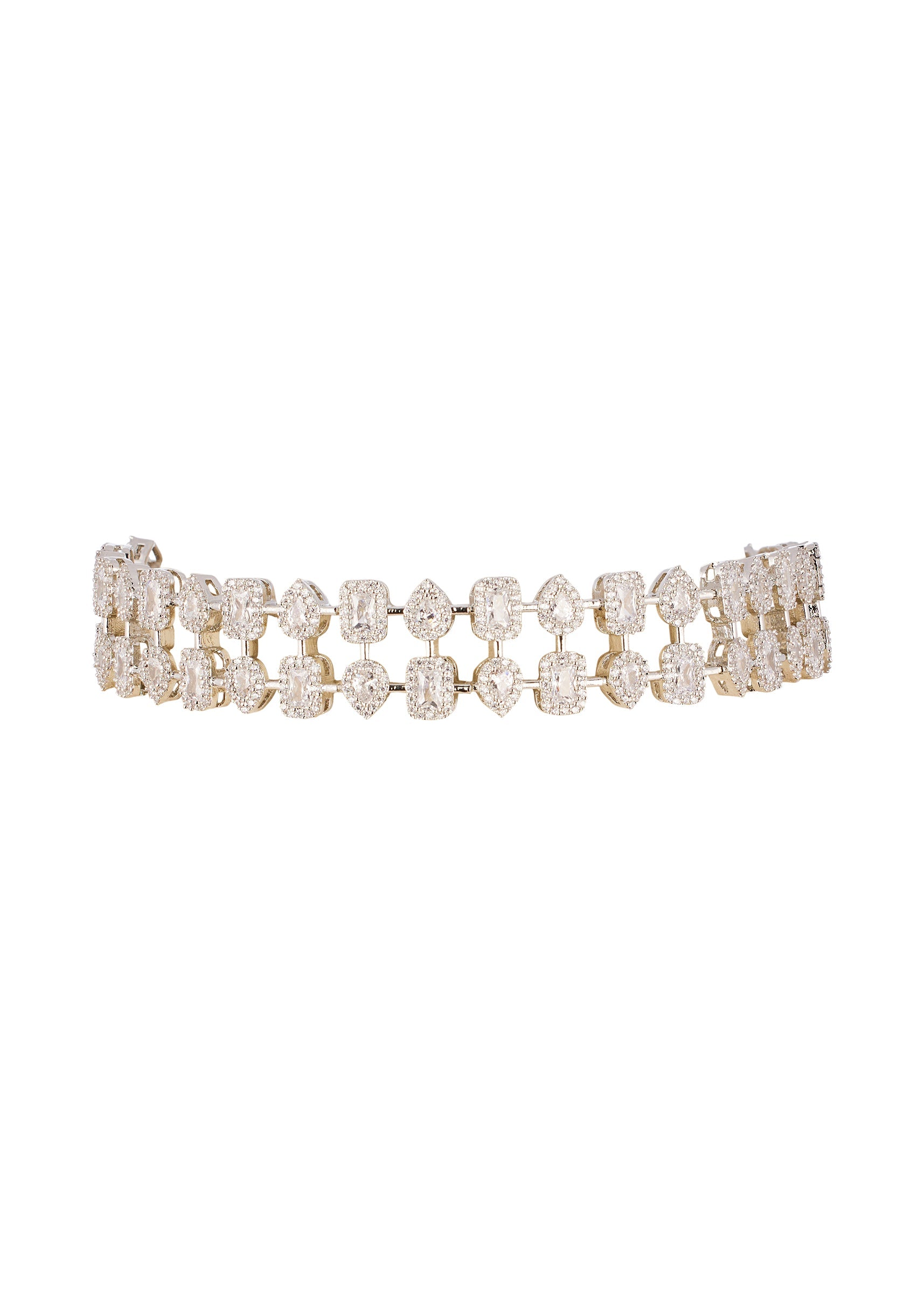 Radiating graceful charm, this CZ diamond look necklace set is adorned with rich rani pink semi precious stones and paired with delicately crafted floral earrings for a soft yet regal finish. Made in rhodium plated brass with an anti tarnish coating, it offers enduring brilliance and a refined, feminine appeal. Ideal for bridal celebrations, sangeet evenings, and festive occasions where elegance takes center stage.