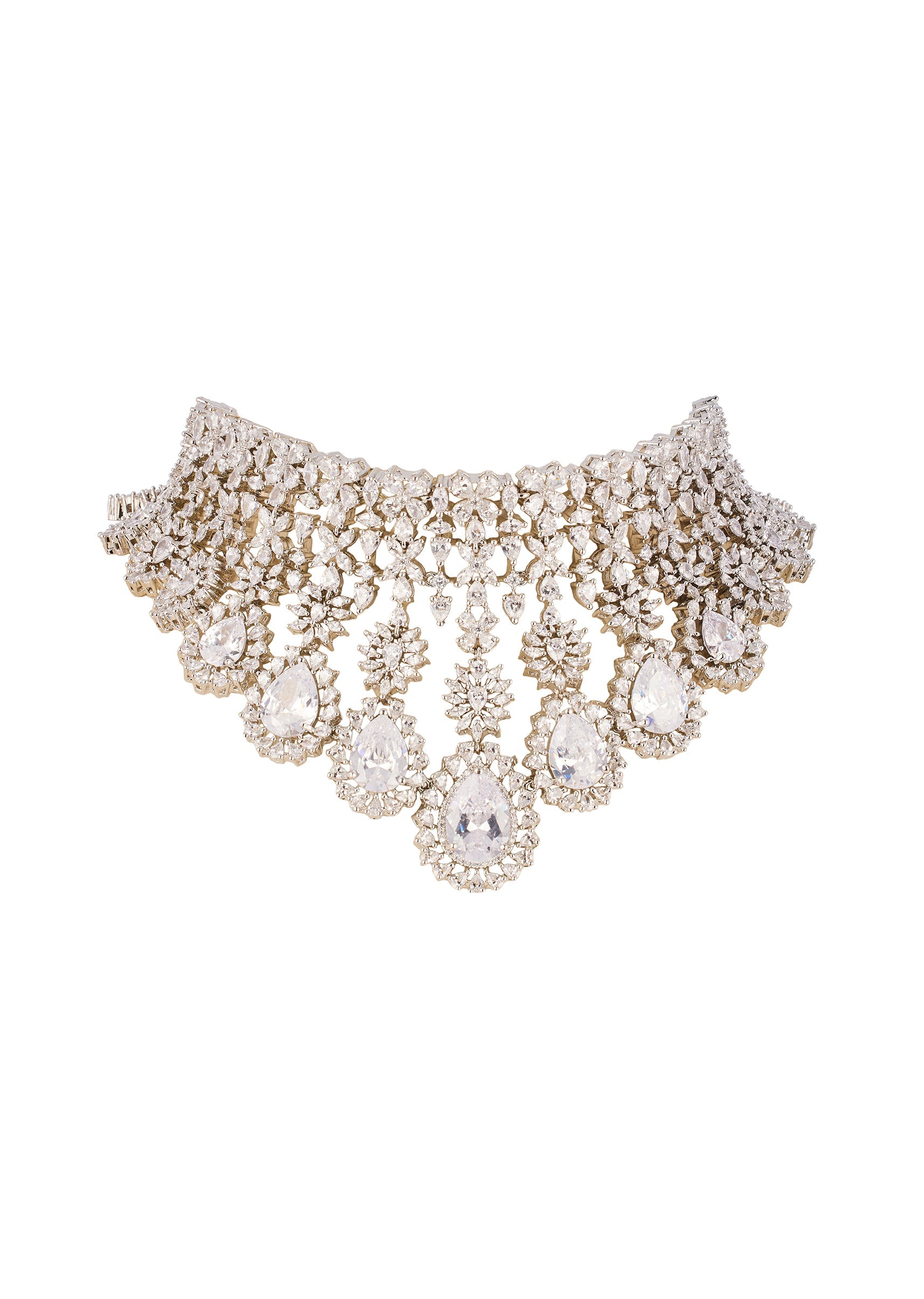 Refined and effortlessly graceful, this white and silver CZ diamond look necklace set embodies timeless elegance with a contemporary finish. The luminous white stones paired with a sleek silver toned base create a soft, radiant sparkle that feels both classic and modern. Crafted in rhodium plated brass with an anti tarnish finish, it is perfect for weddings, receptions, and elegant evening occasions. Awarded as the Most Trusted Brand, we're delivering styles you love, just as promised.
