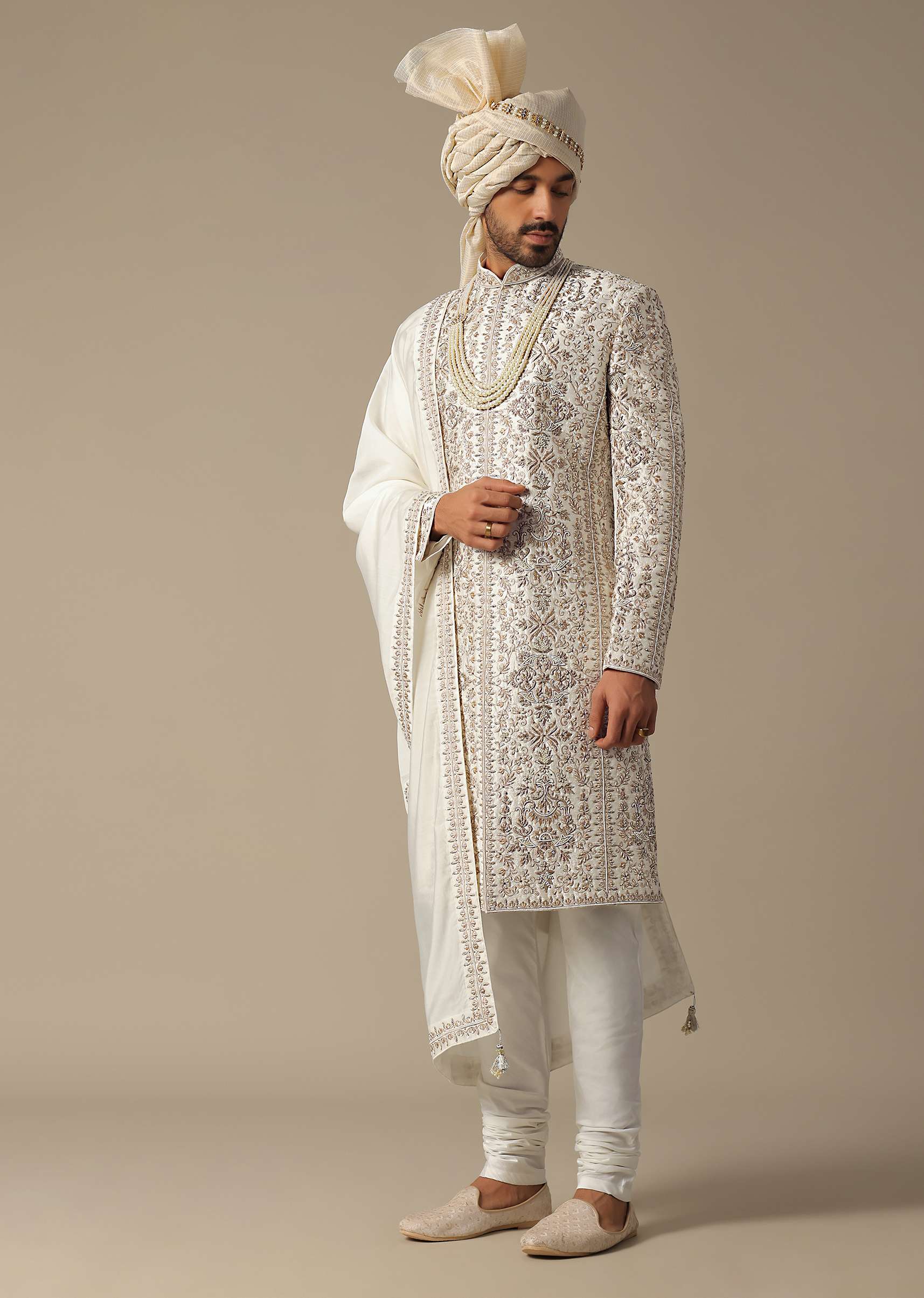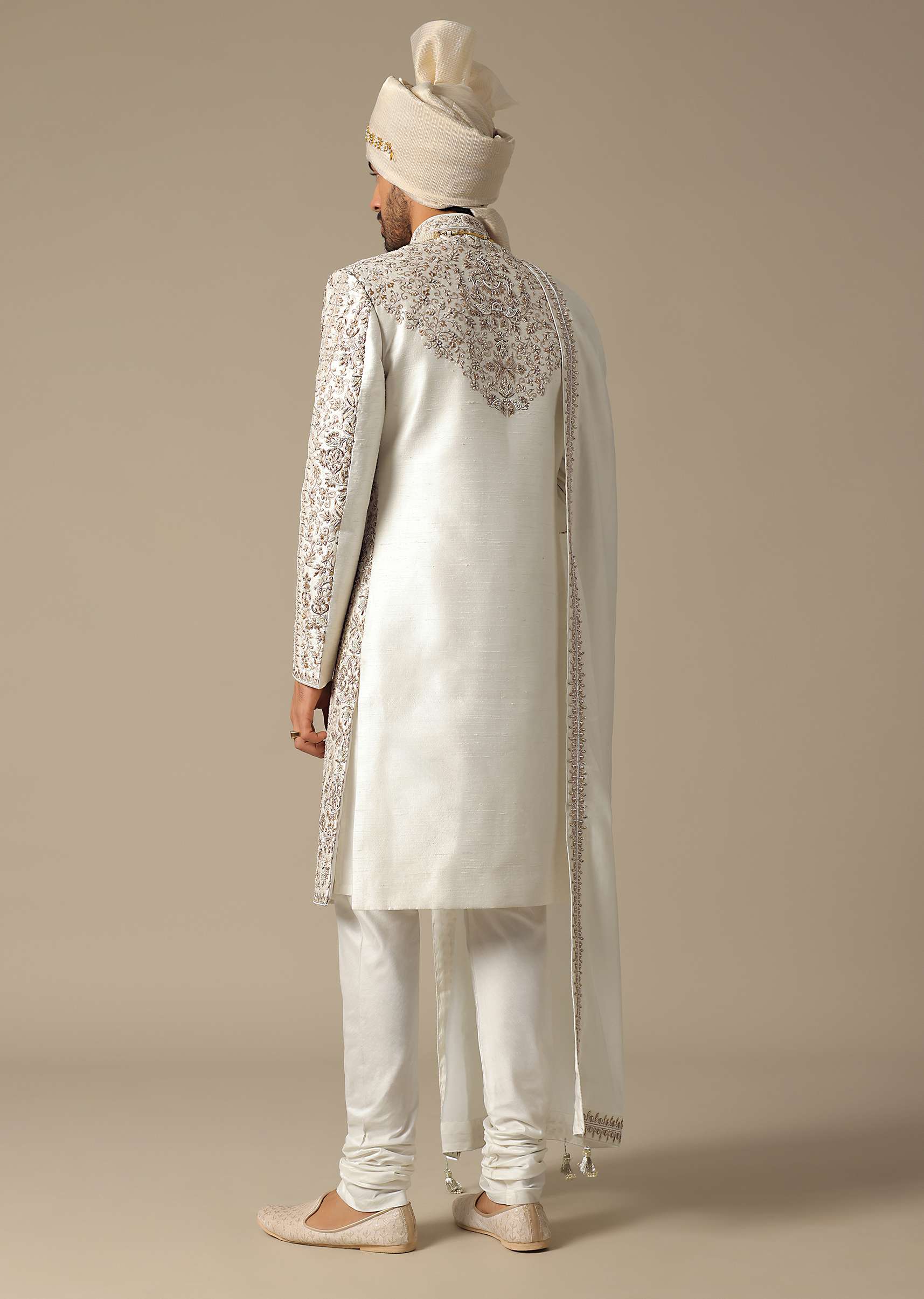 Elevate your wedding style with our White Elegance Sherwani Set, meticulously crafted for the discerning groom. The main feature is the opulent and heavy embroidery on luxurious raw silk. This outfit creates a timeless and sophisticated look. This set includes Sherwani, kurta, dupatta, and churidar. Awarded as the Most Trusted Brand, we're delivering styles you love, just as promised.