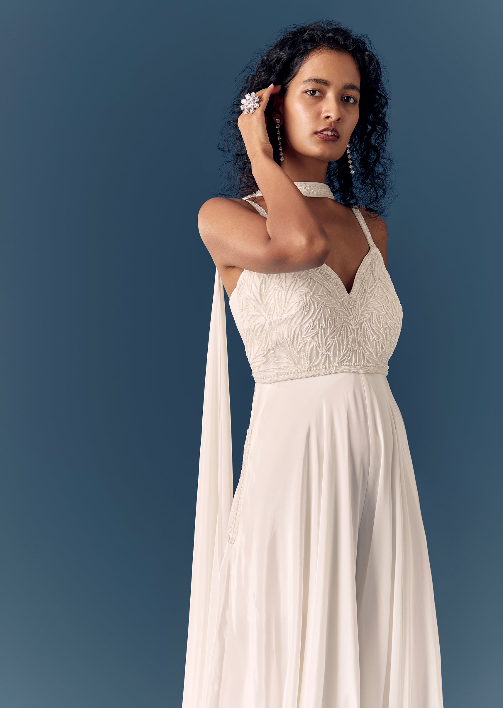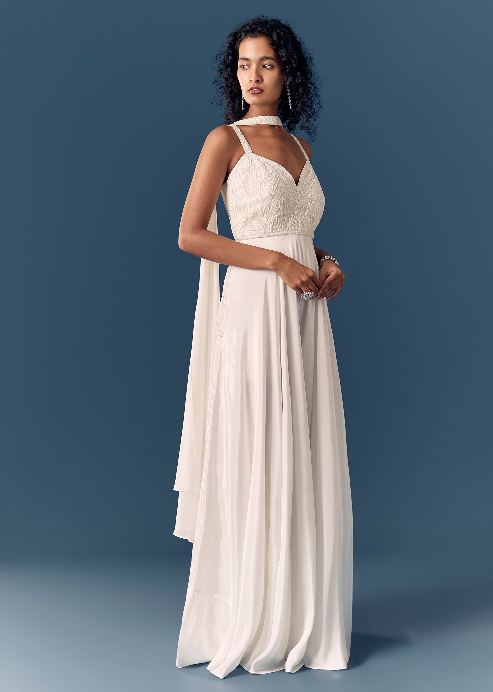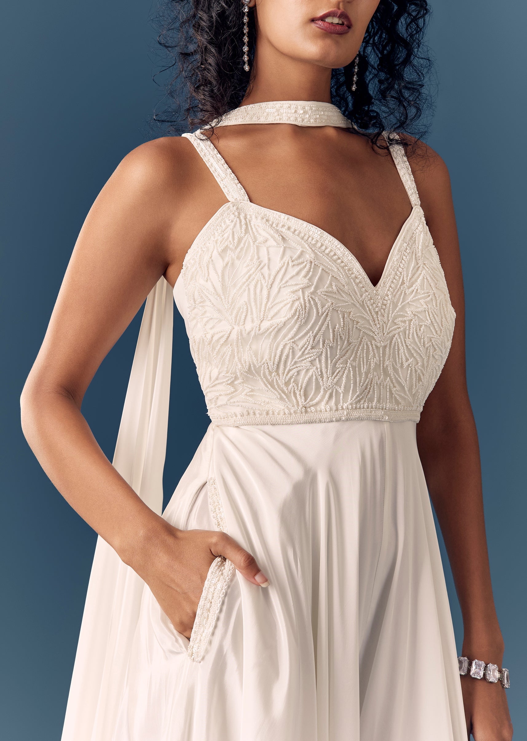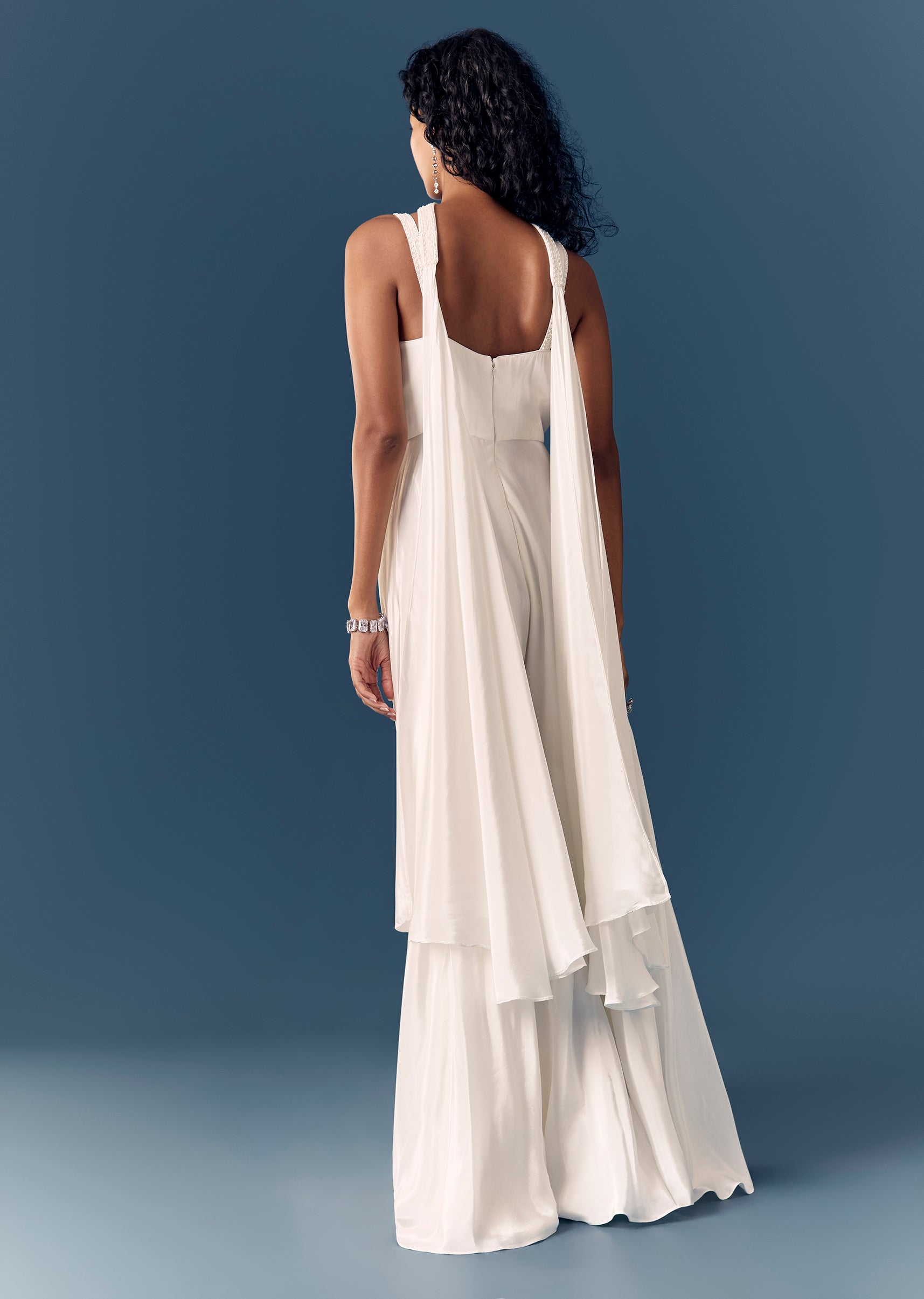 A modern festive white jumpsuit with moti and cut dana embellishment. Sleeveless with sweetheart neckline and a back zip closure, paired with a dupatta perfect for reception and engagement events.... More Product Details