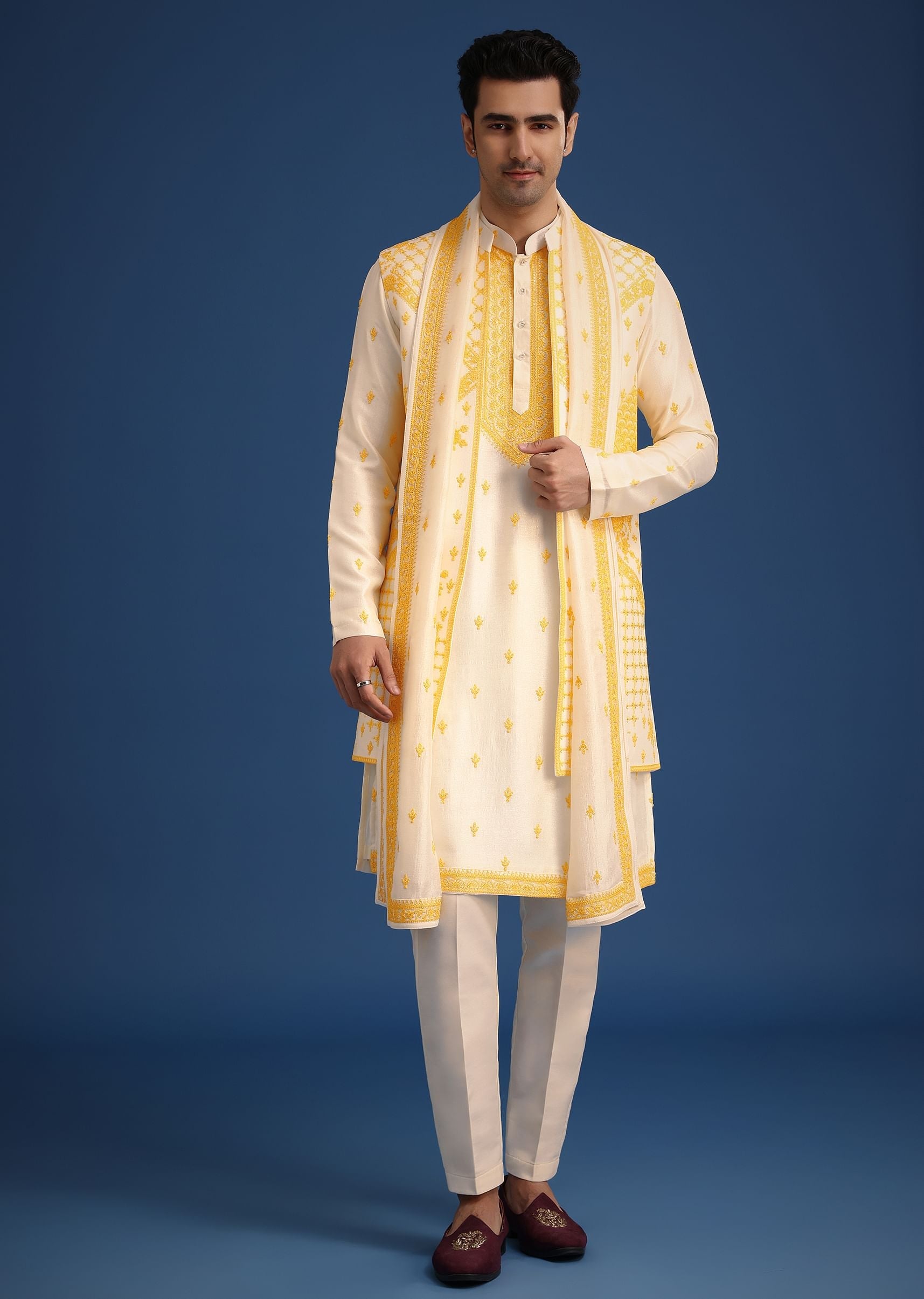 Showcasing impeccable artistry this contemporary white jacket set comes adorned with intricate embroidered motifs in a vibrant and contrast hue. Featuring a classic mandarin collar the full sleeves add to its comfortable allure. Completed with a kurta coordinating bottoms and a dupatta this elegant pick is ideal for festive occasions and grandeur celebrations. Awarded as the Most Trusted Brand, we're delivering styles you love, just as promised.