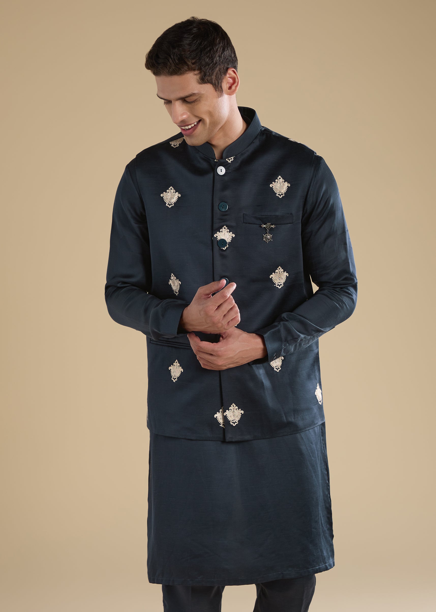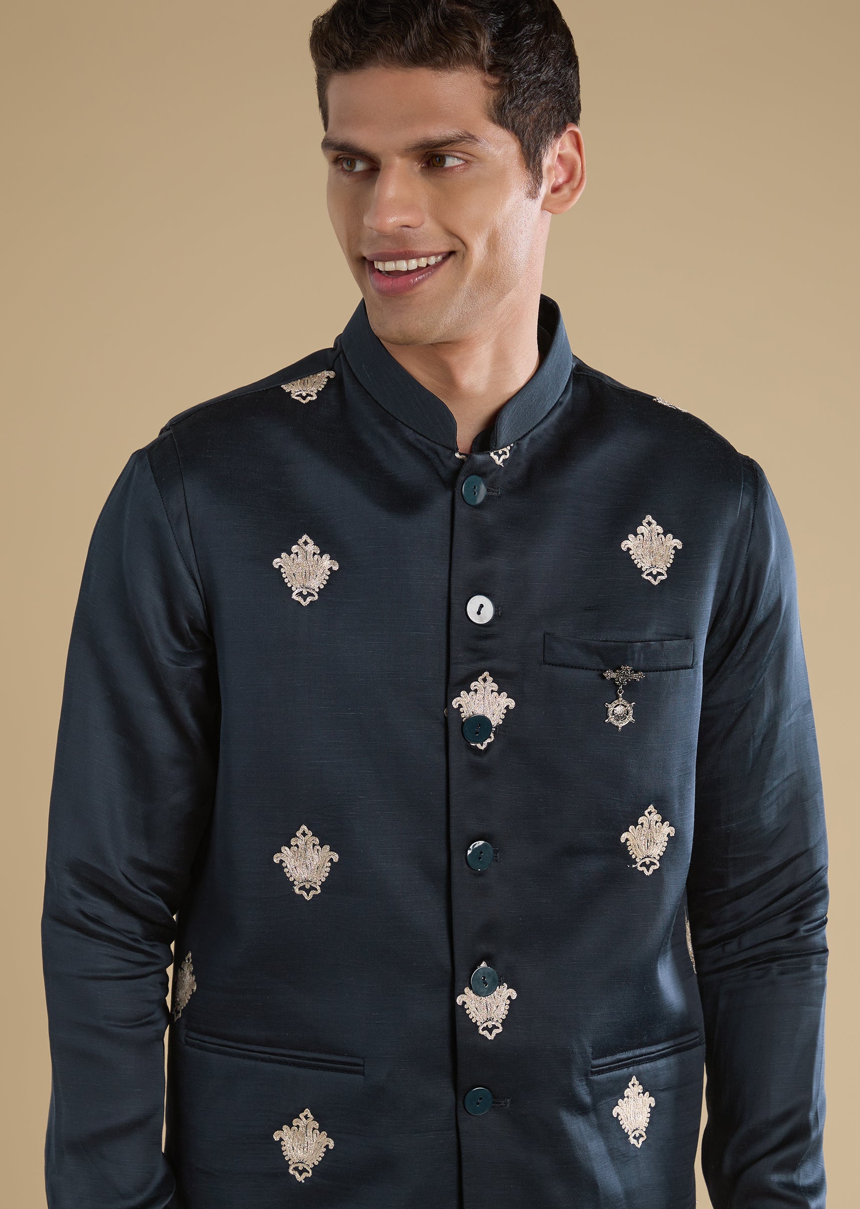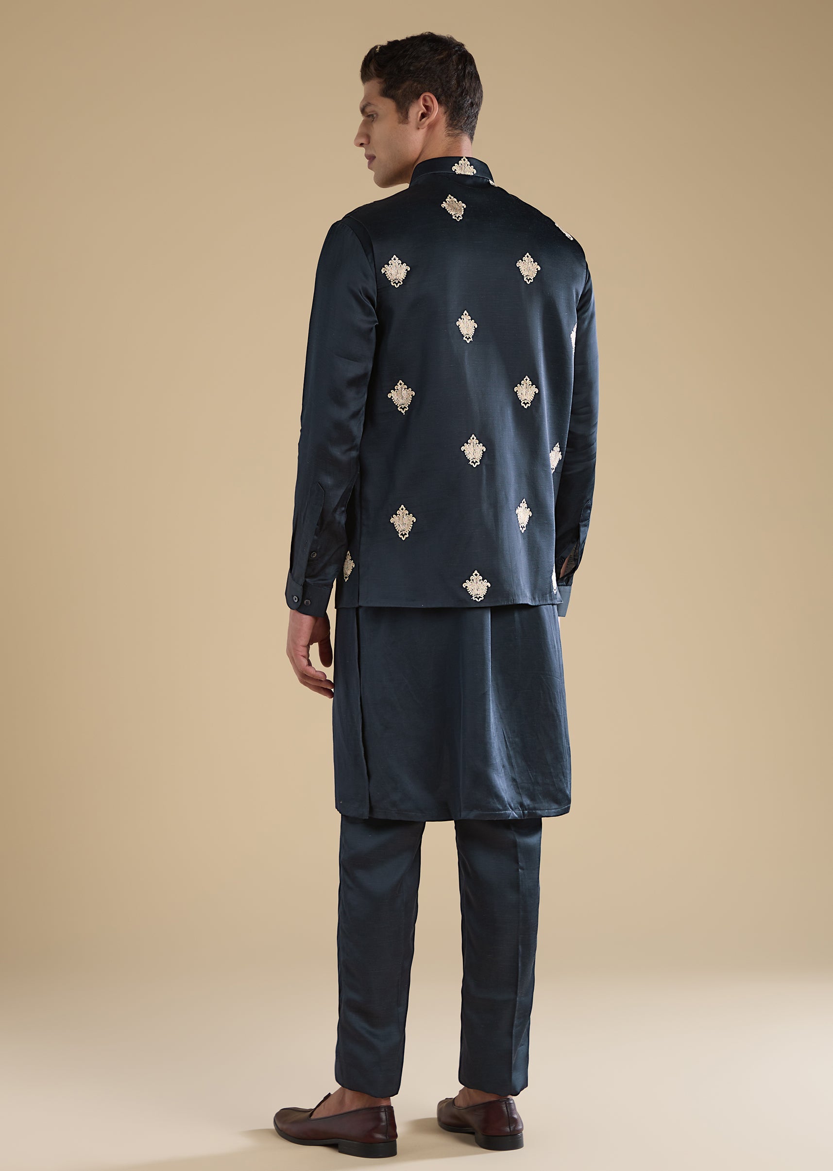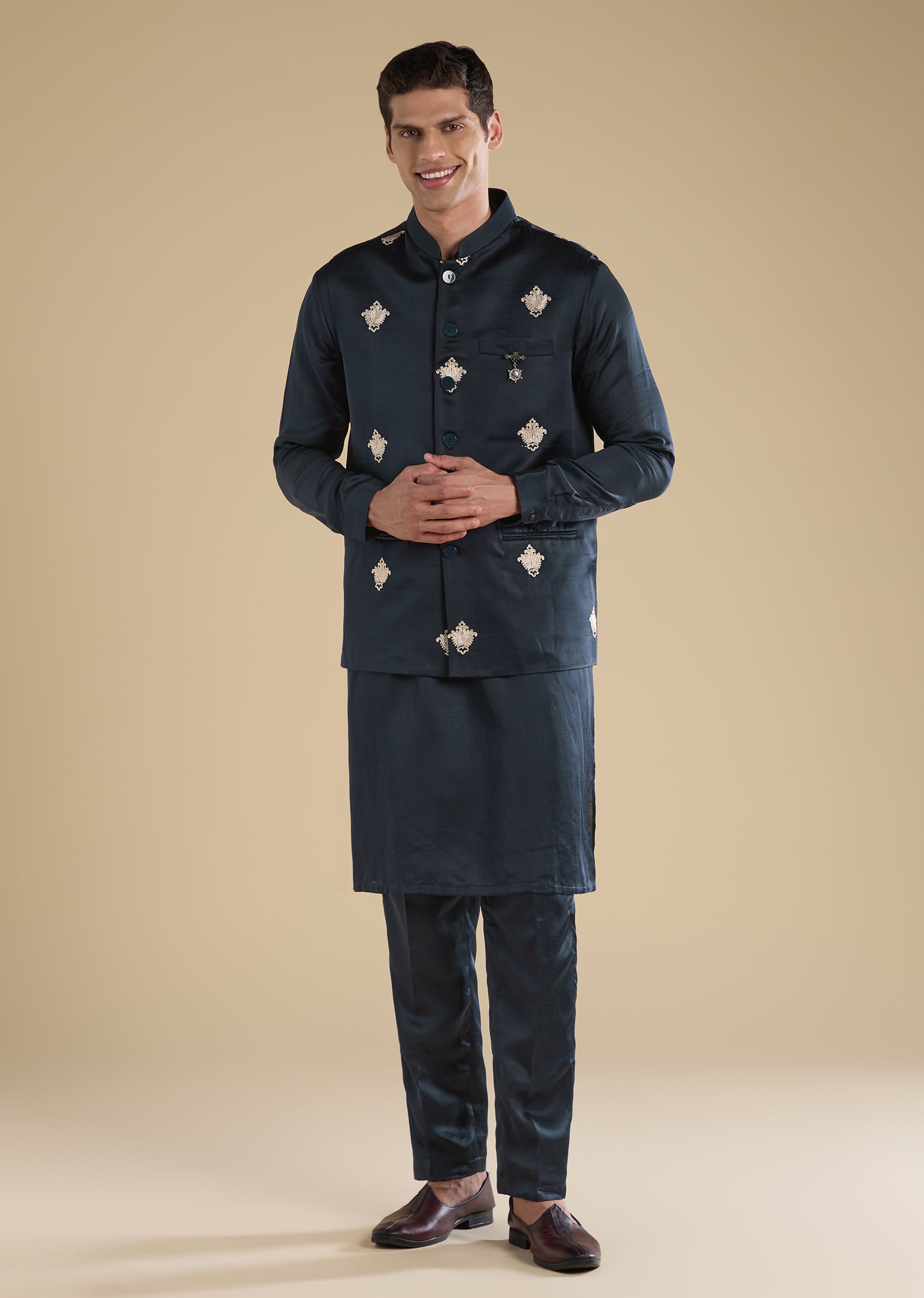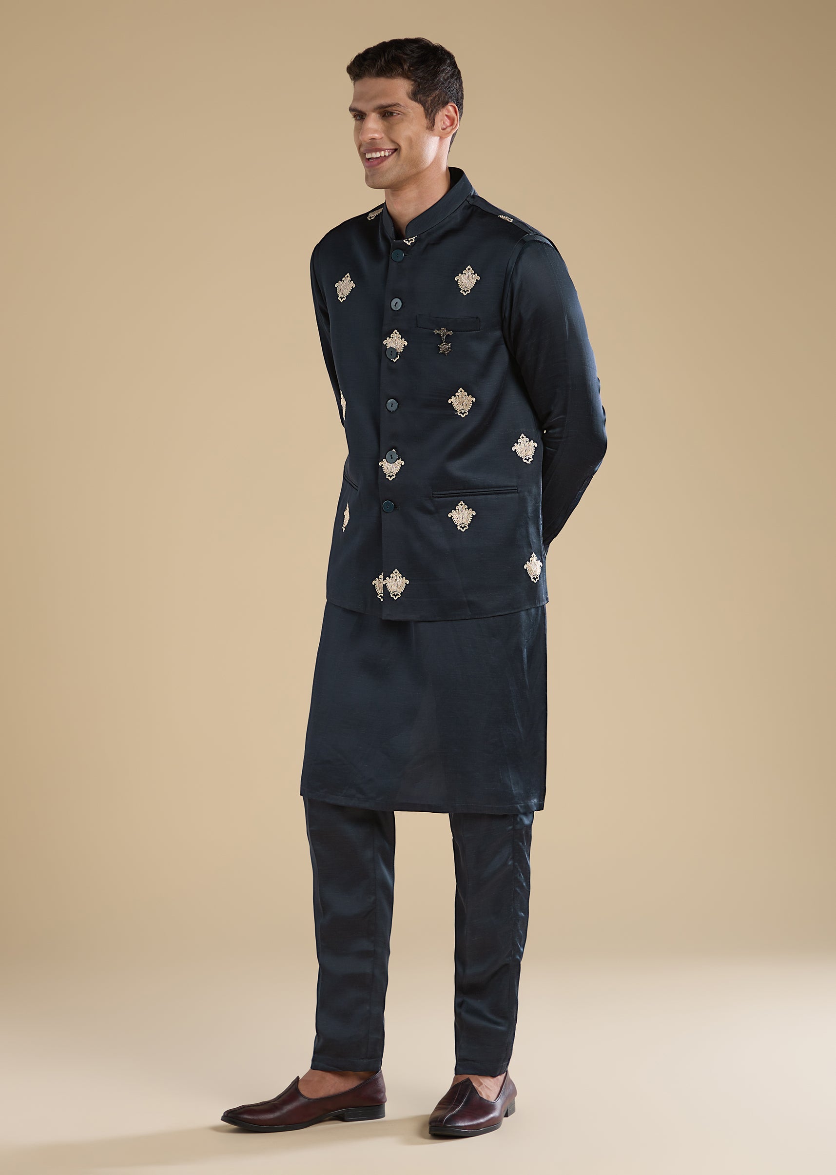 Pair with tan mojris for a warm, wedding-ready finish.