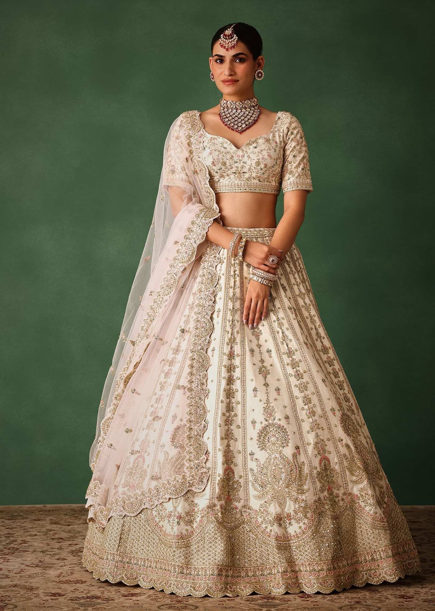 • Speckled with refined hand embroidery this majestic offwhite lehenga set exudes a vintage and royal bridal look.