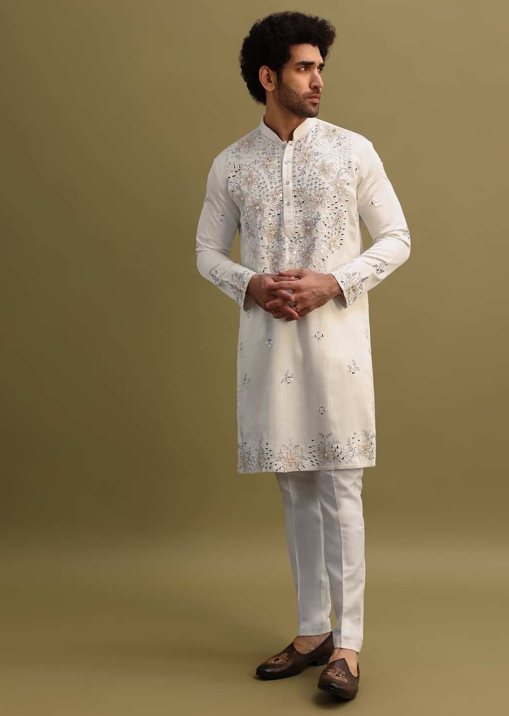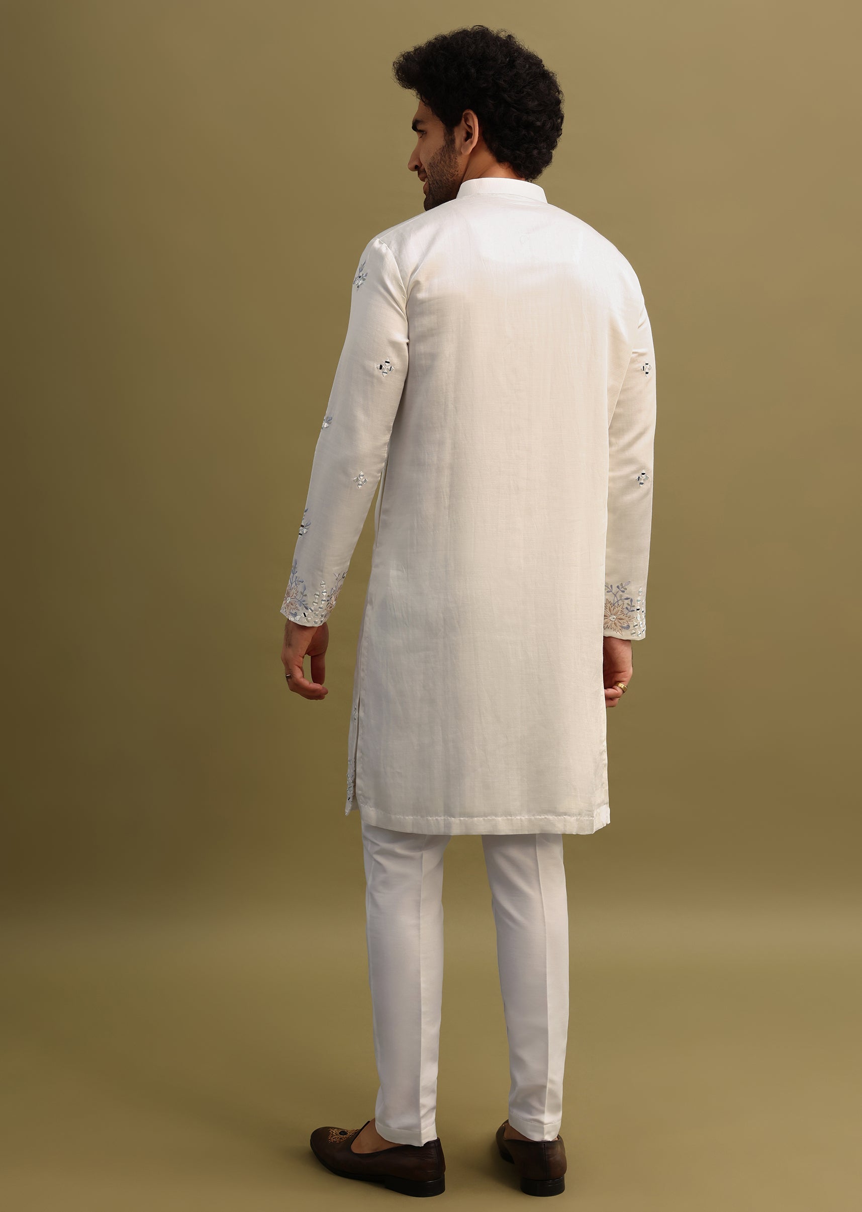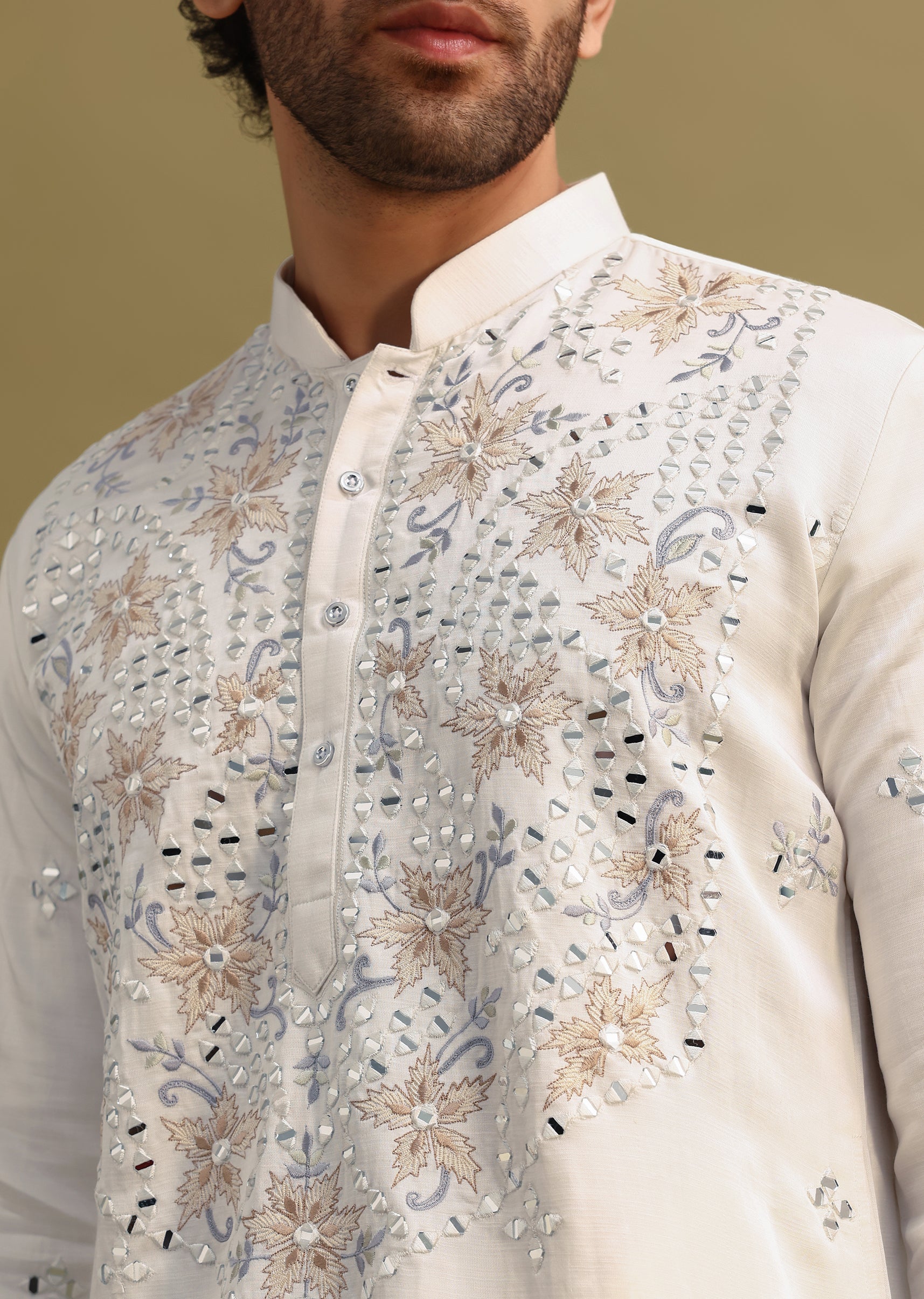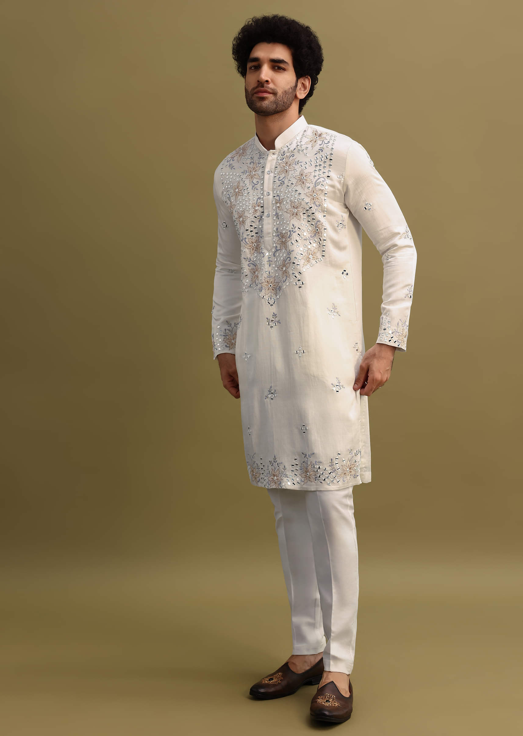 White Embroidered Mirror Work Kurta Set For Men
