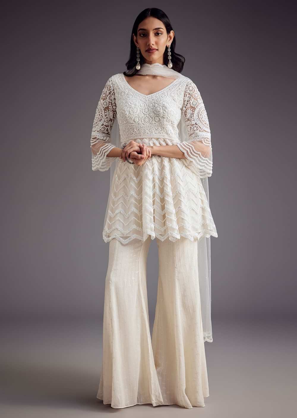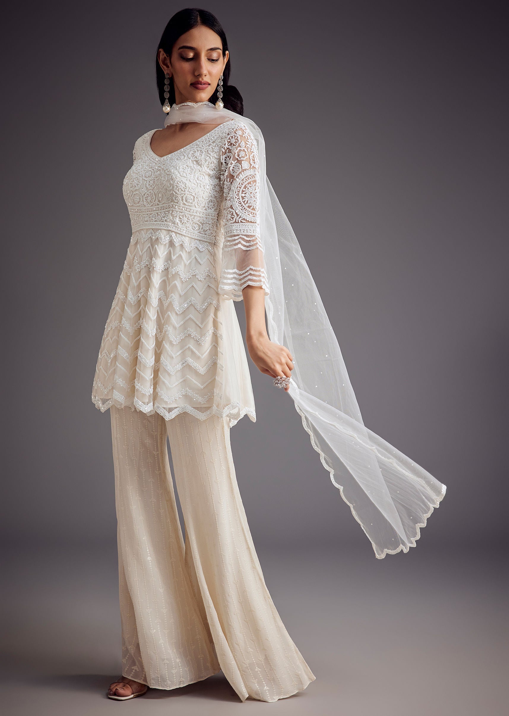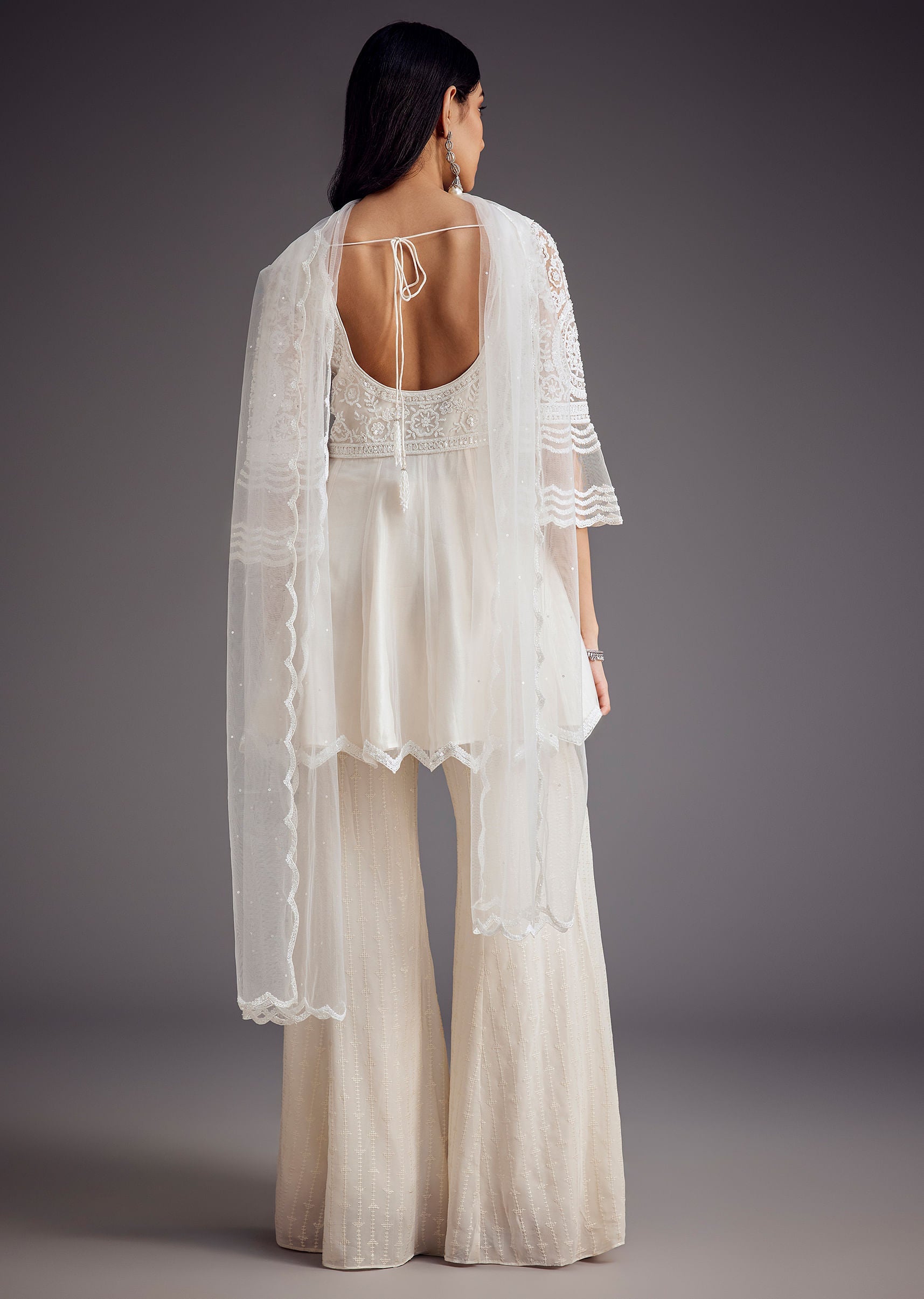 White Embroidered Peplum Kurta With Palazzo And Net Dupatta