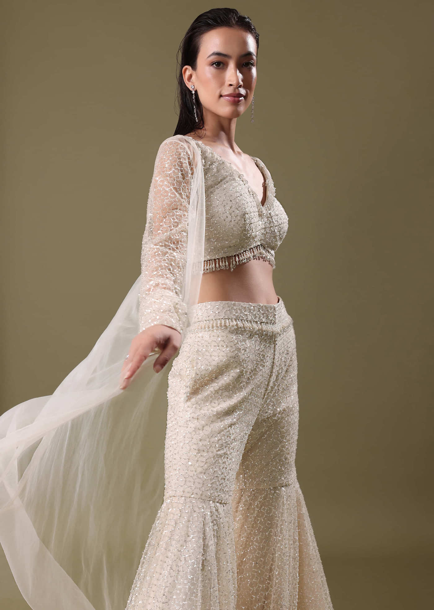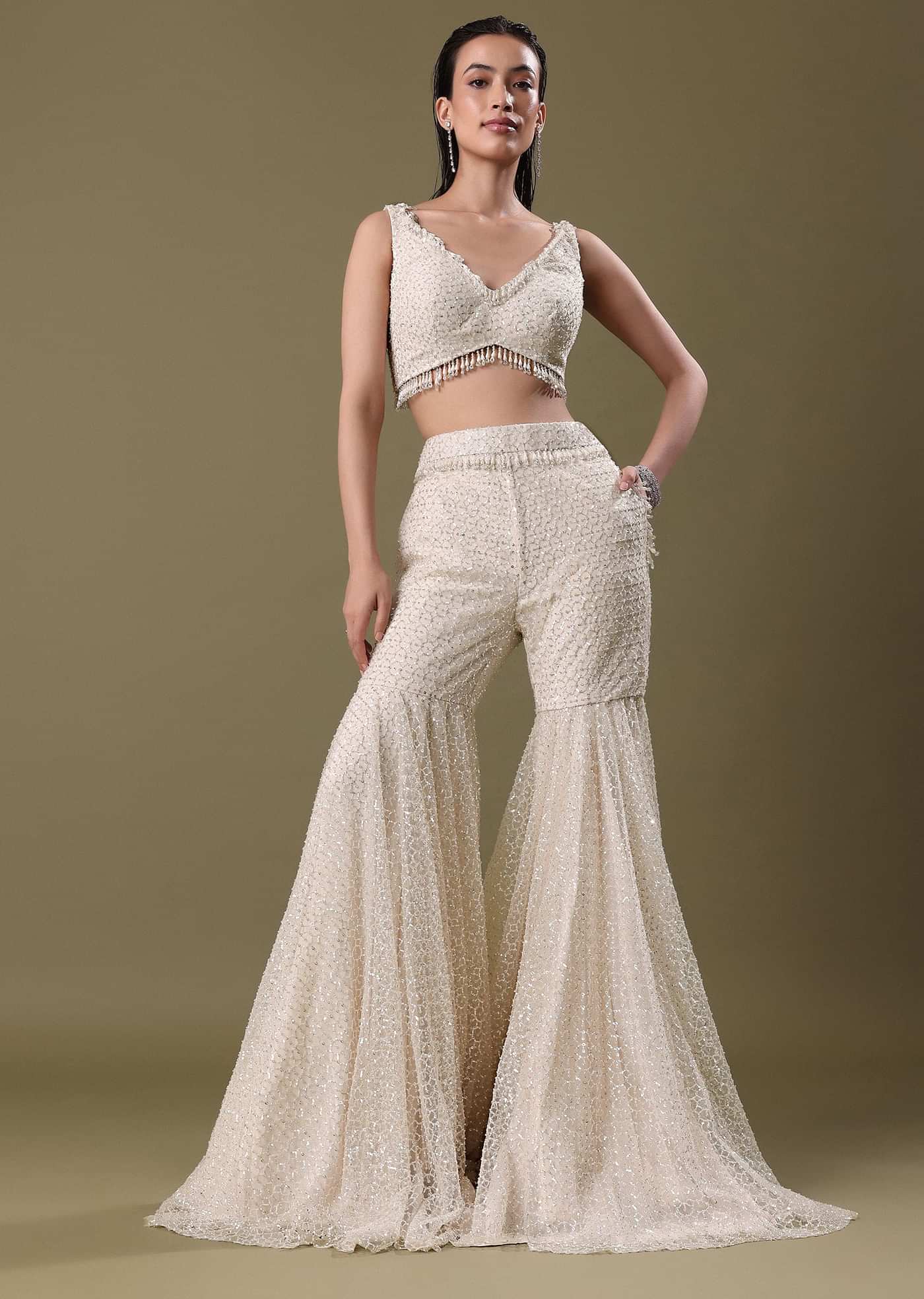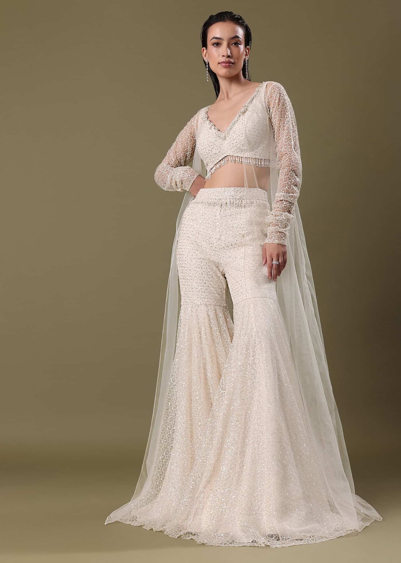 Step into sophistication with our radiant white blouse and sharara set. Designed for receptions and weddings, it's crafted from fine net fabric with intricate sequin work, ensuring opulence. Paired with... More Product Details