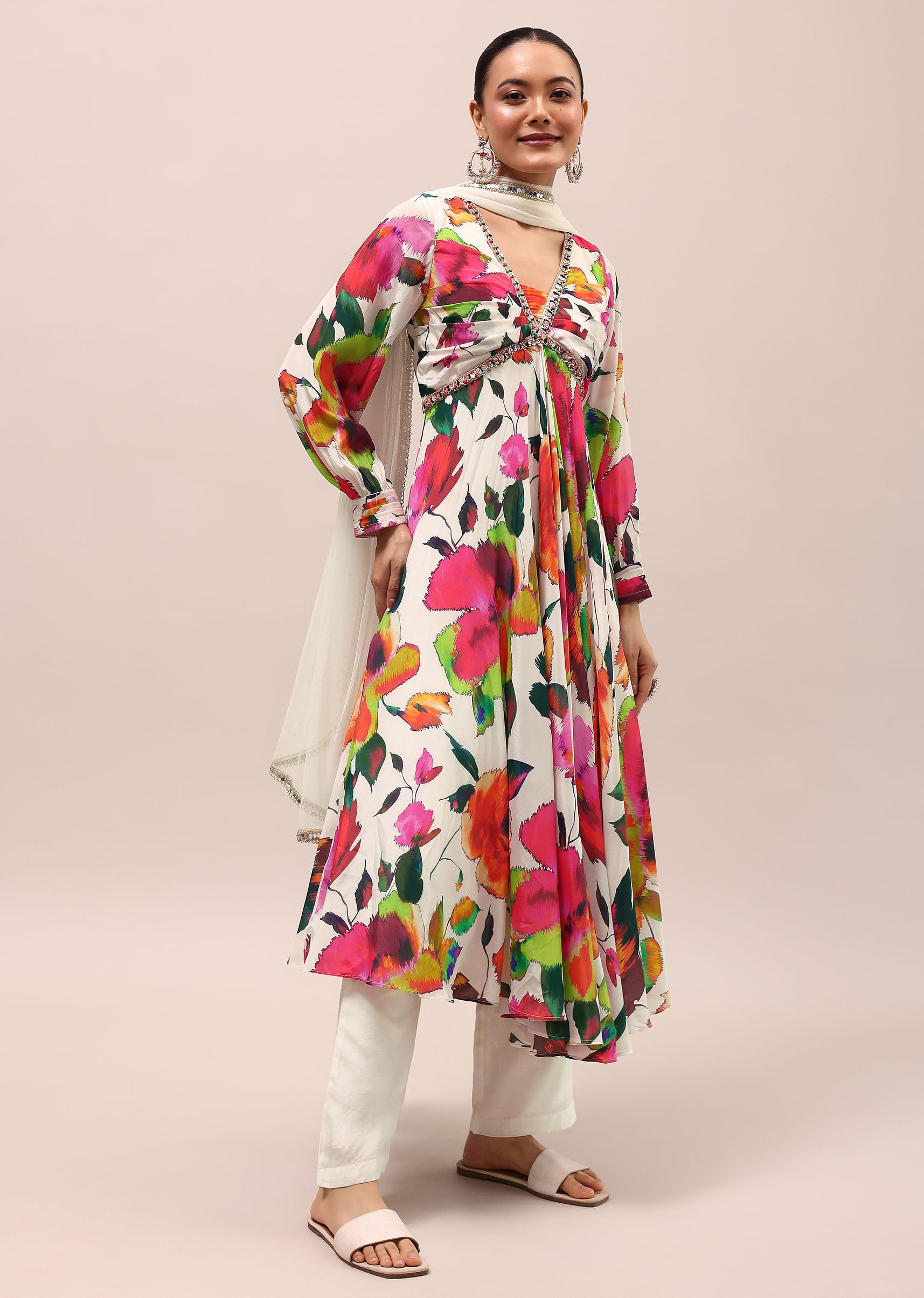 Indulge in the allure of our white kurta set, perfect for festive gatherings. Made from luxurious silk fabric, this set is exquisitely embellished with prints, cut dana, beads, sequins, and... More Product Details