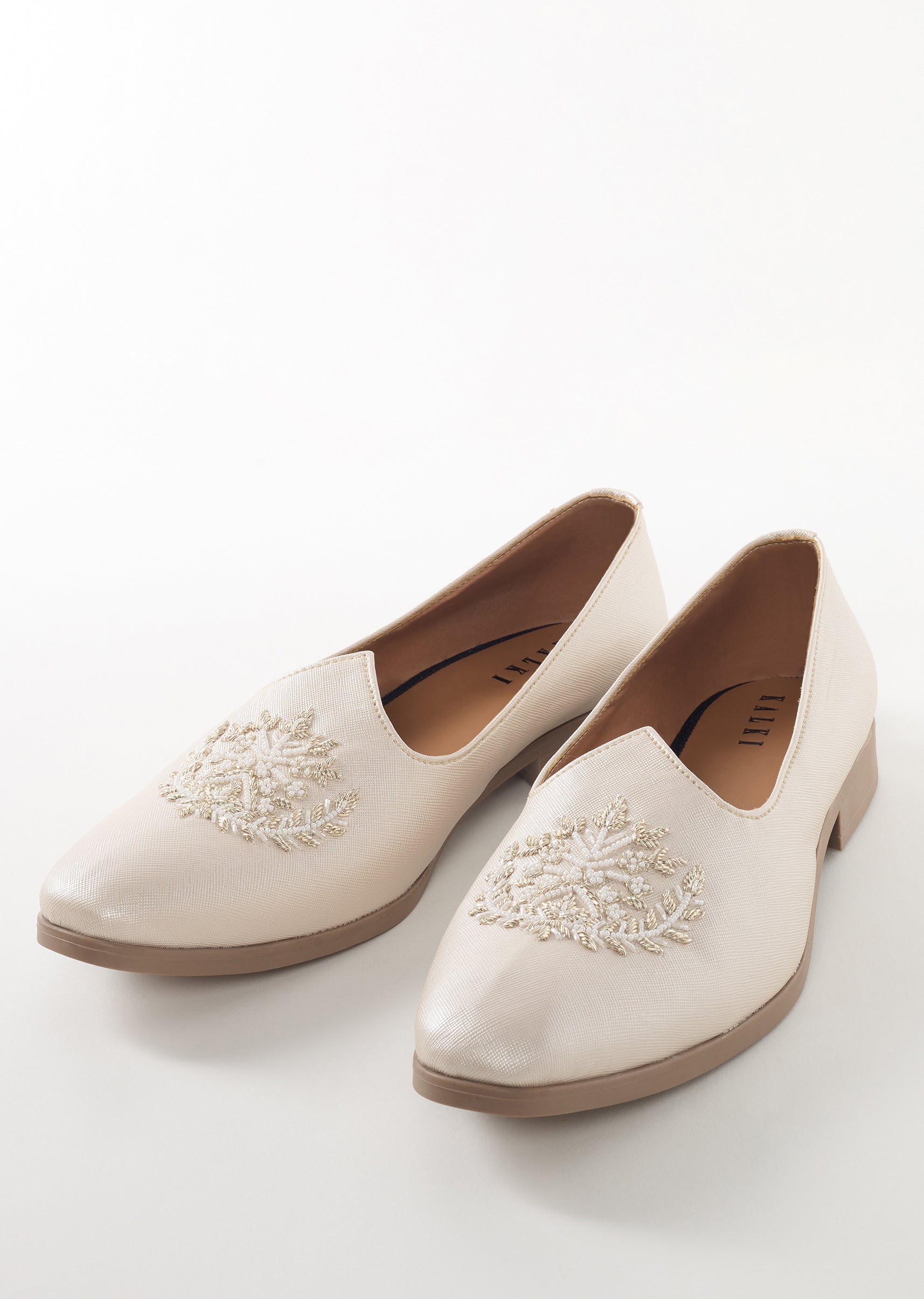 These white ethnic juttis feature intricate hand embroidery and a textured finish that creates a classy and ethnic look. The faux leather base with embroidery detailing adds elegance while ensuring... More Product Details