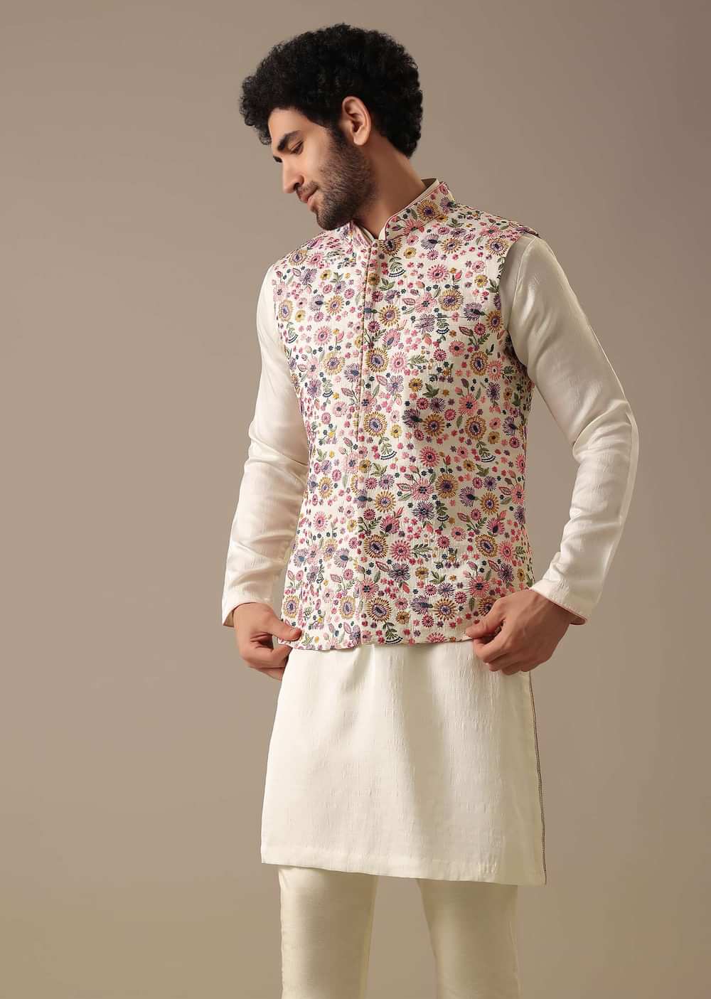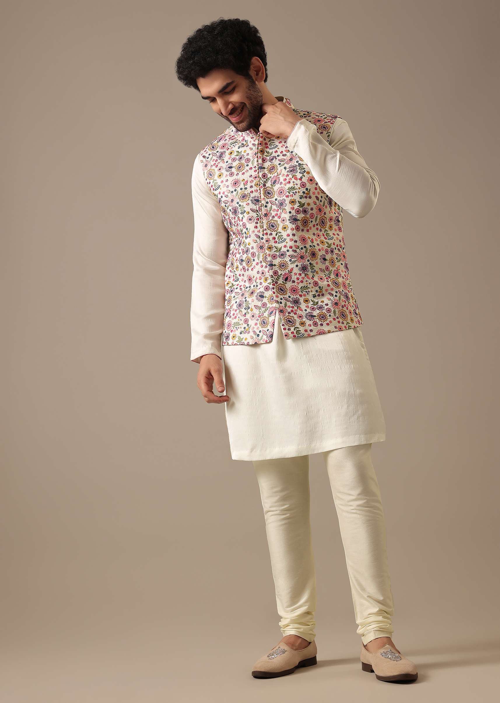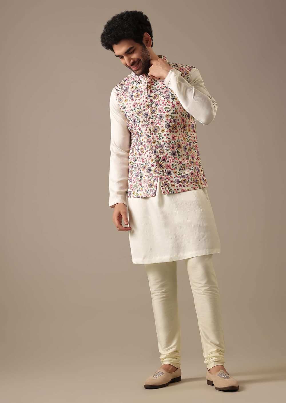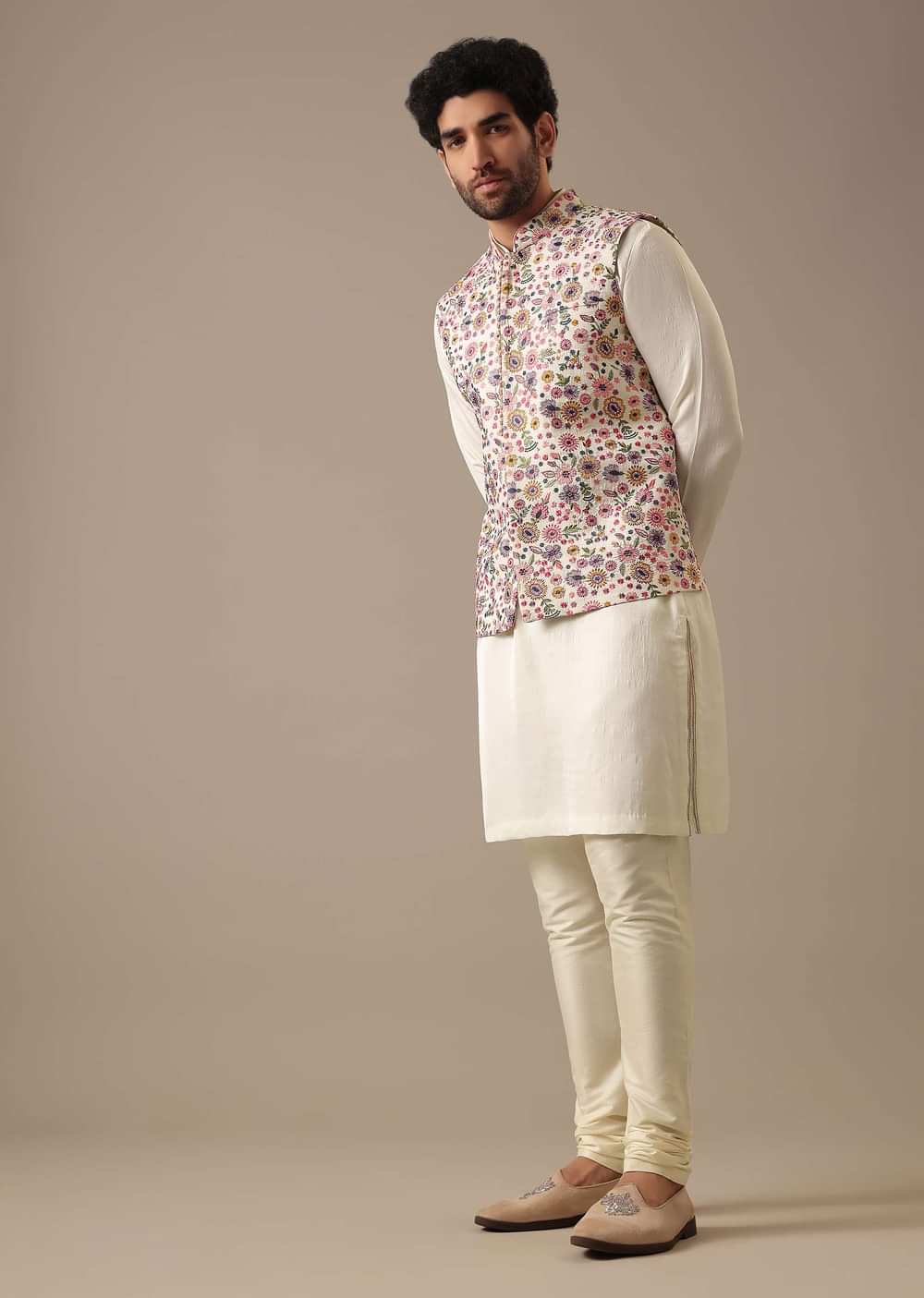 This opulent fusion set is a modern take on celebration wear. Adding a dash of extravagance at every wedding function, the bundi features multi-color floral motifs in thread and resham work. Enhanced with welt pocket and a Mandarin collar, this set includes a complementing kurta and churidar.Add a glamorous touch with a a faux-feather brooch, studded cufflinks and suede mojaris. Awarded as the Most Trusted Brand, we're delivering styles you love, just as promised.