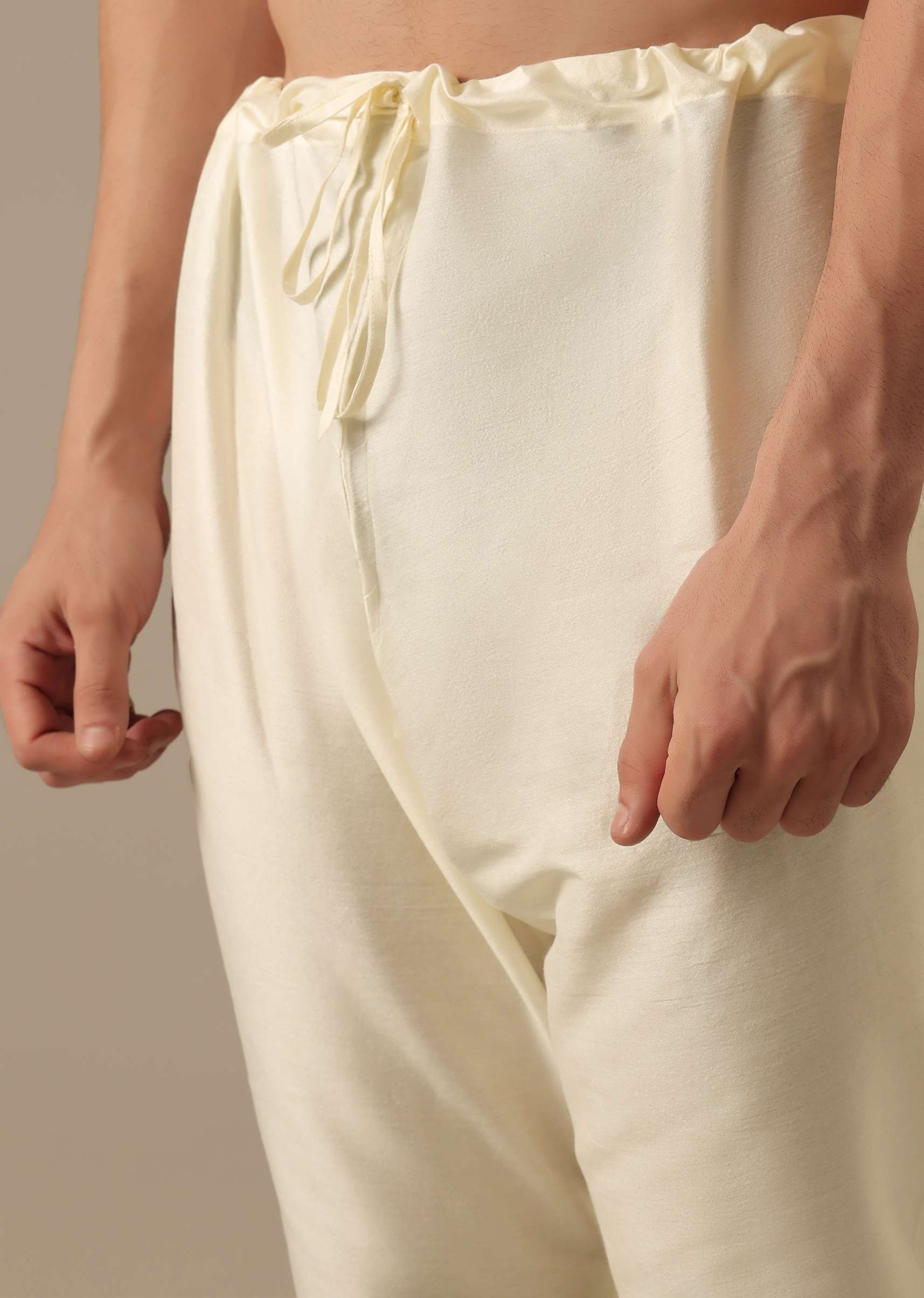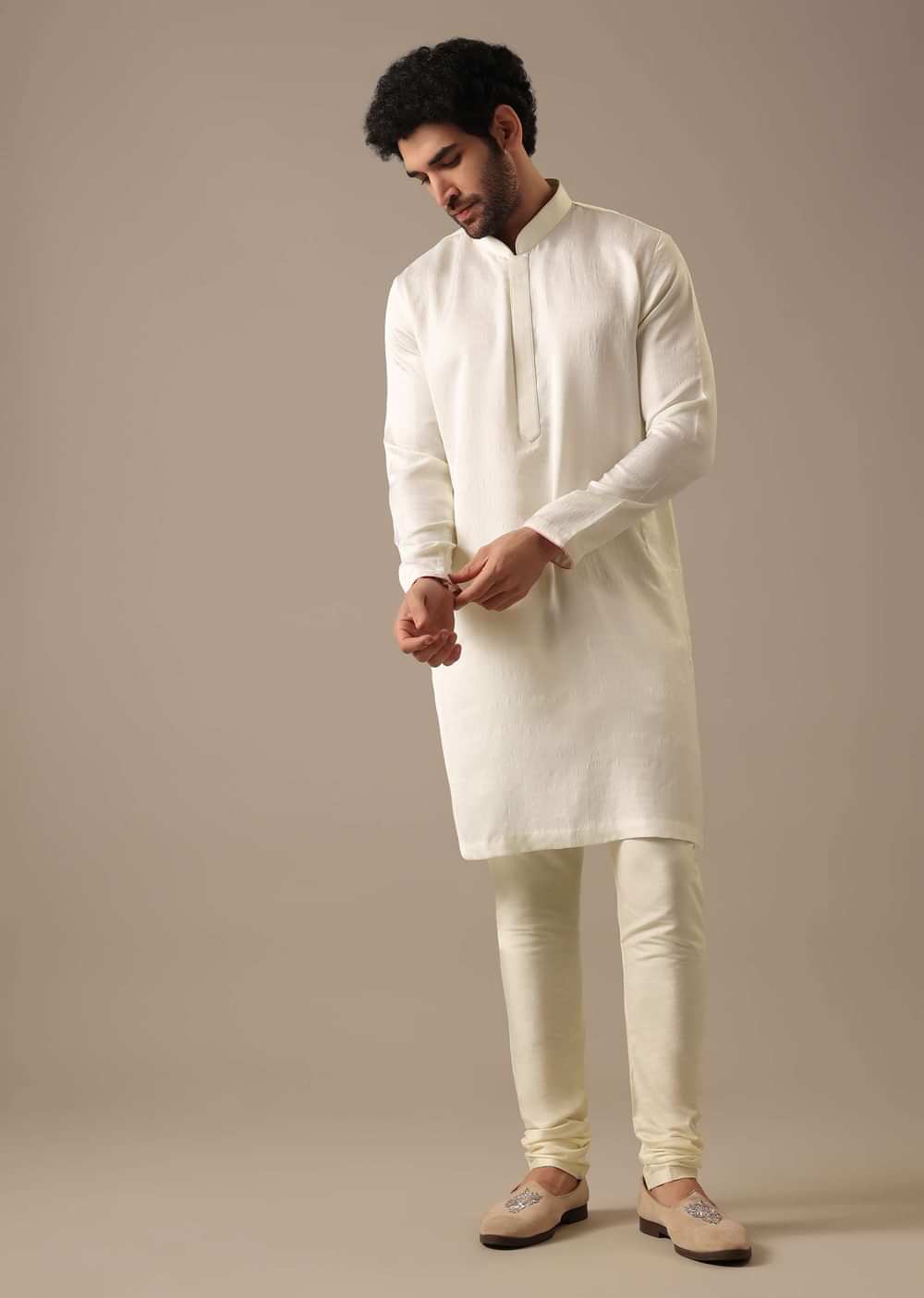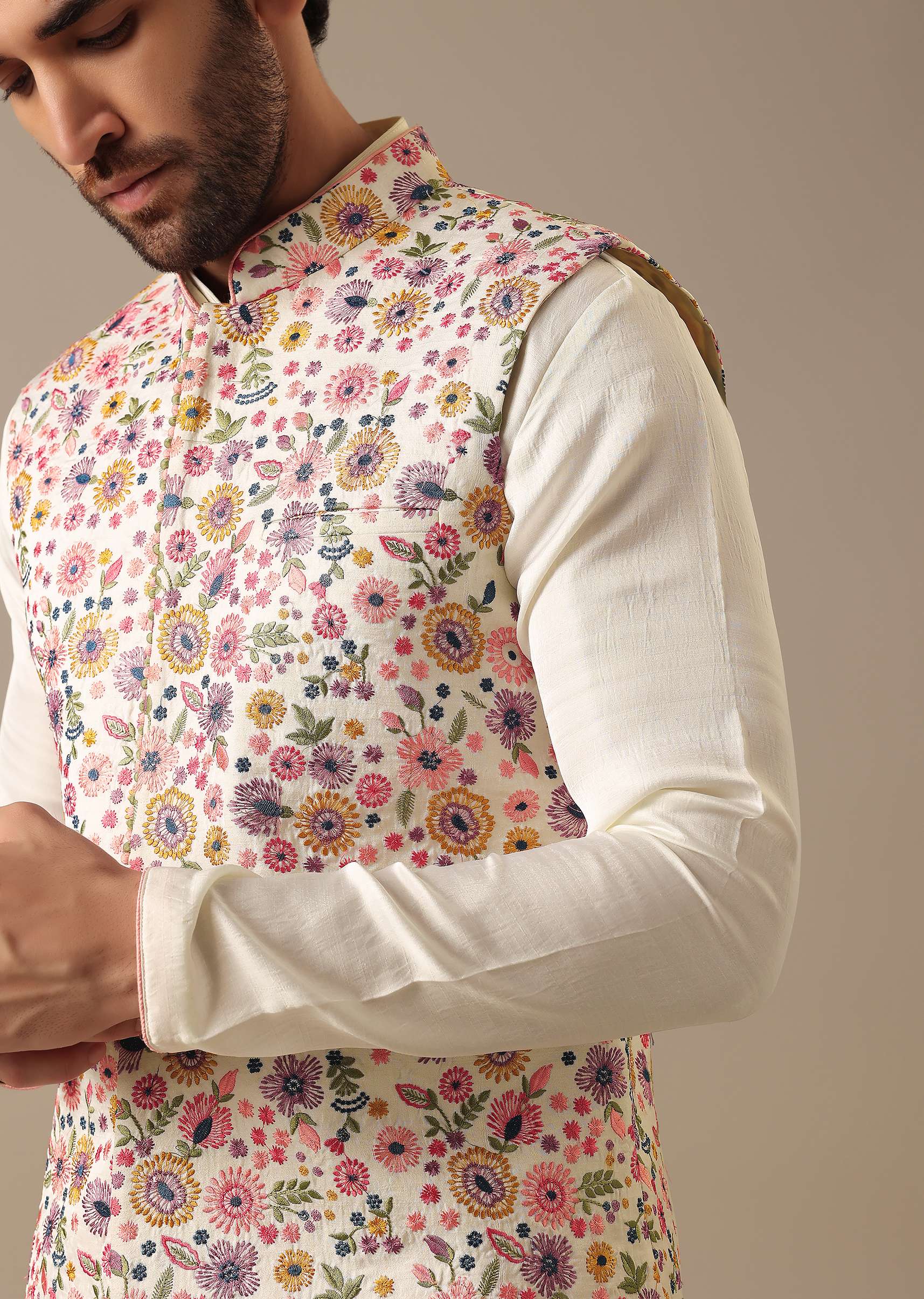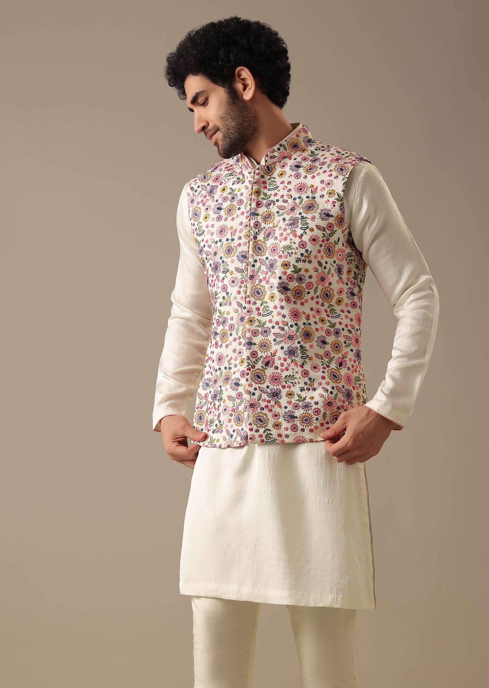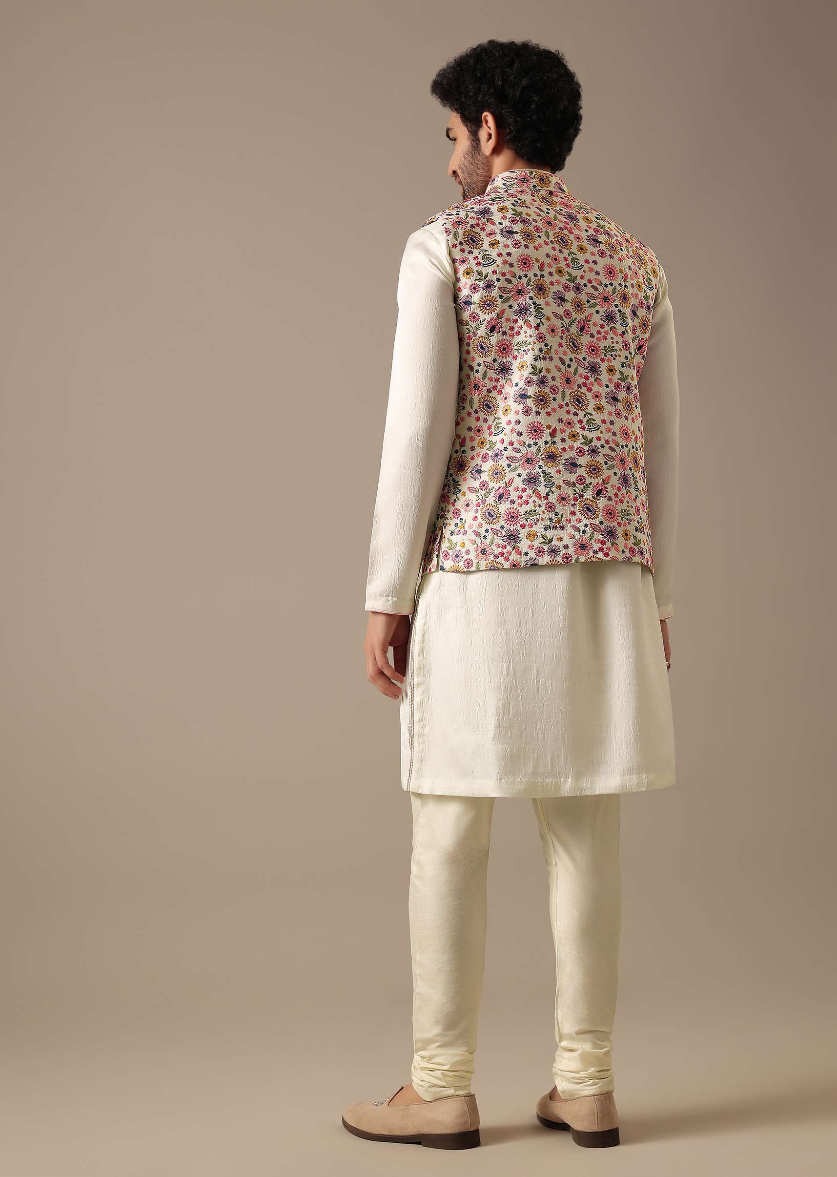 This opulent fusion set is a modern take on celebration wear. Adding a dash of extravagance at every wedding function, the bundi features multi-color floral motifs in thread and resham work. Enhanced with welt pocket and a Mandarin collar, this set includes a complementing kurta and churidar.Add a glamorous touch with a a faux-feather brooch, studded cufflinks and suede mojaris. Awarded as the Most Trusted Brand, we're delivering styles you love, just as promised.