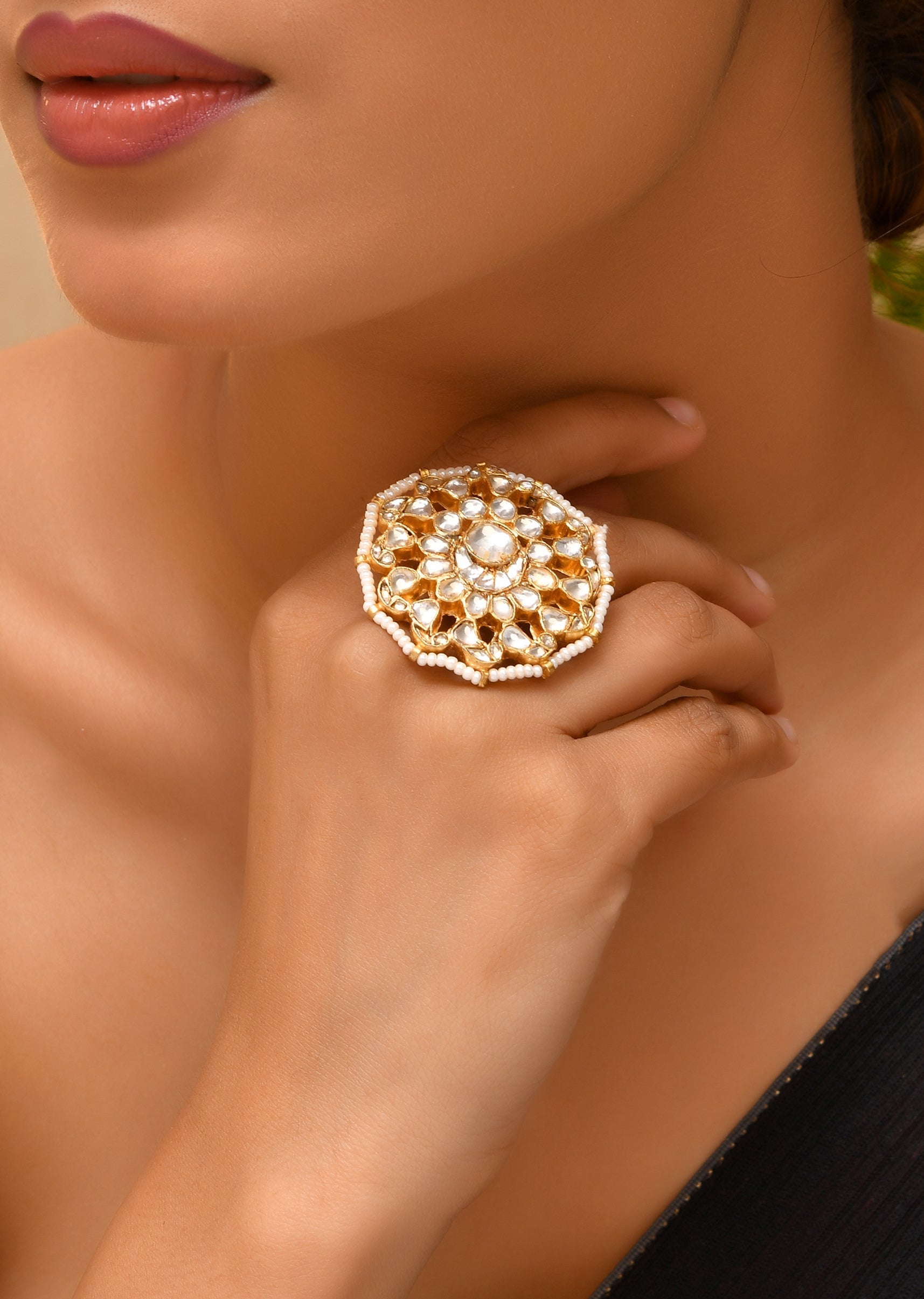 Add delicate elegance to your look with this white floral kundan ring, finished with a charming bead border for a refined traditional touch. Perfect for festive occasions or weddings, it brings a soft, graceful sparkle to any outfit.Awarded as the Most Trusted Brand, we're delivering styles you love, just as promised.