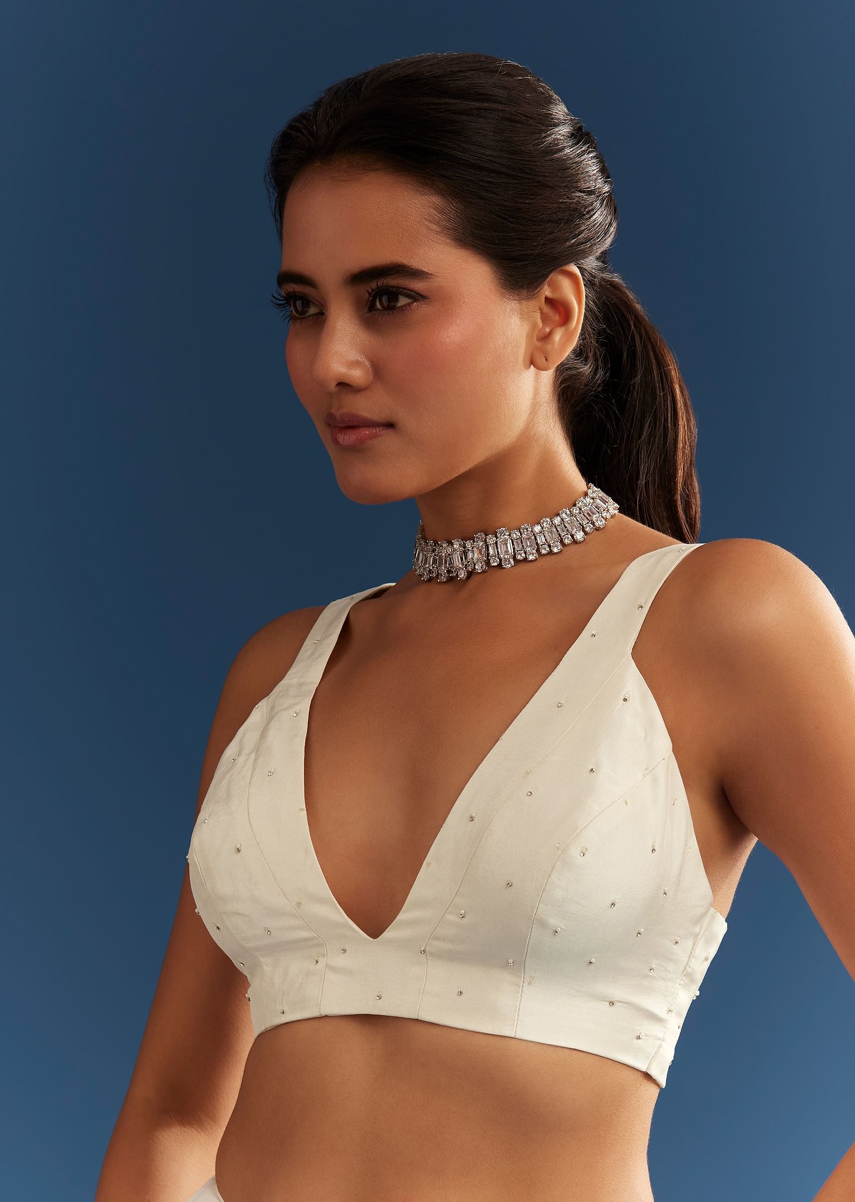 Complement the look with a diamond choker and a sleek bun for an effortlessly refined appeal.