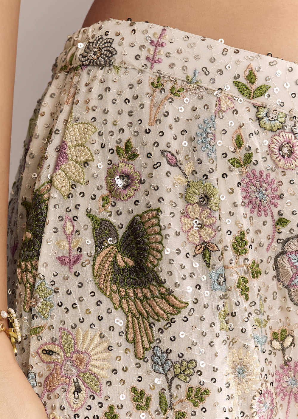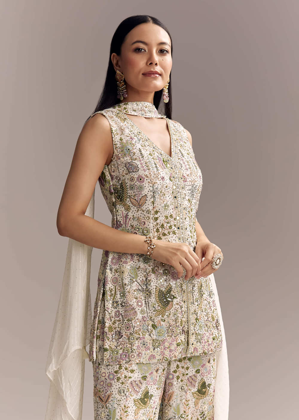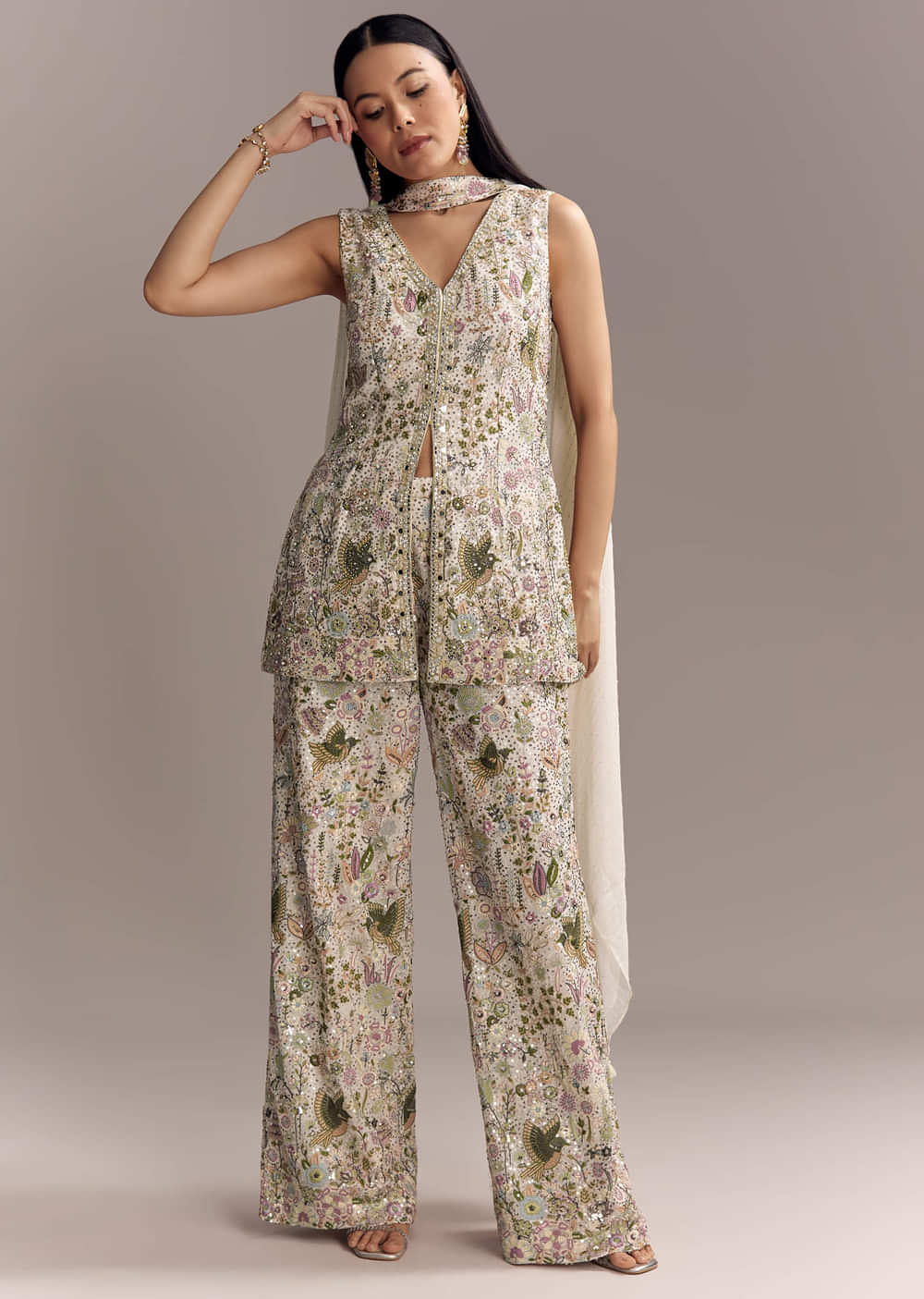 White Georgette Palazzo Suit With Sequins And Resham Embroidery