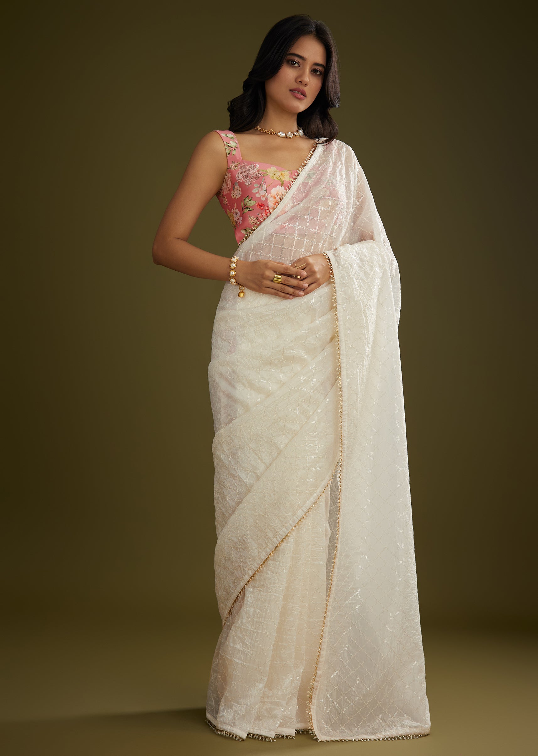 White Glass Tissue Embroidered Saree With Contrast Blouse