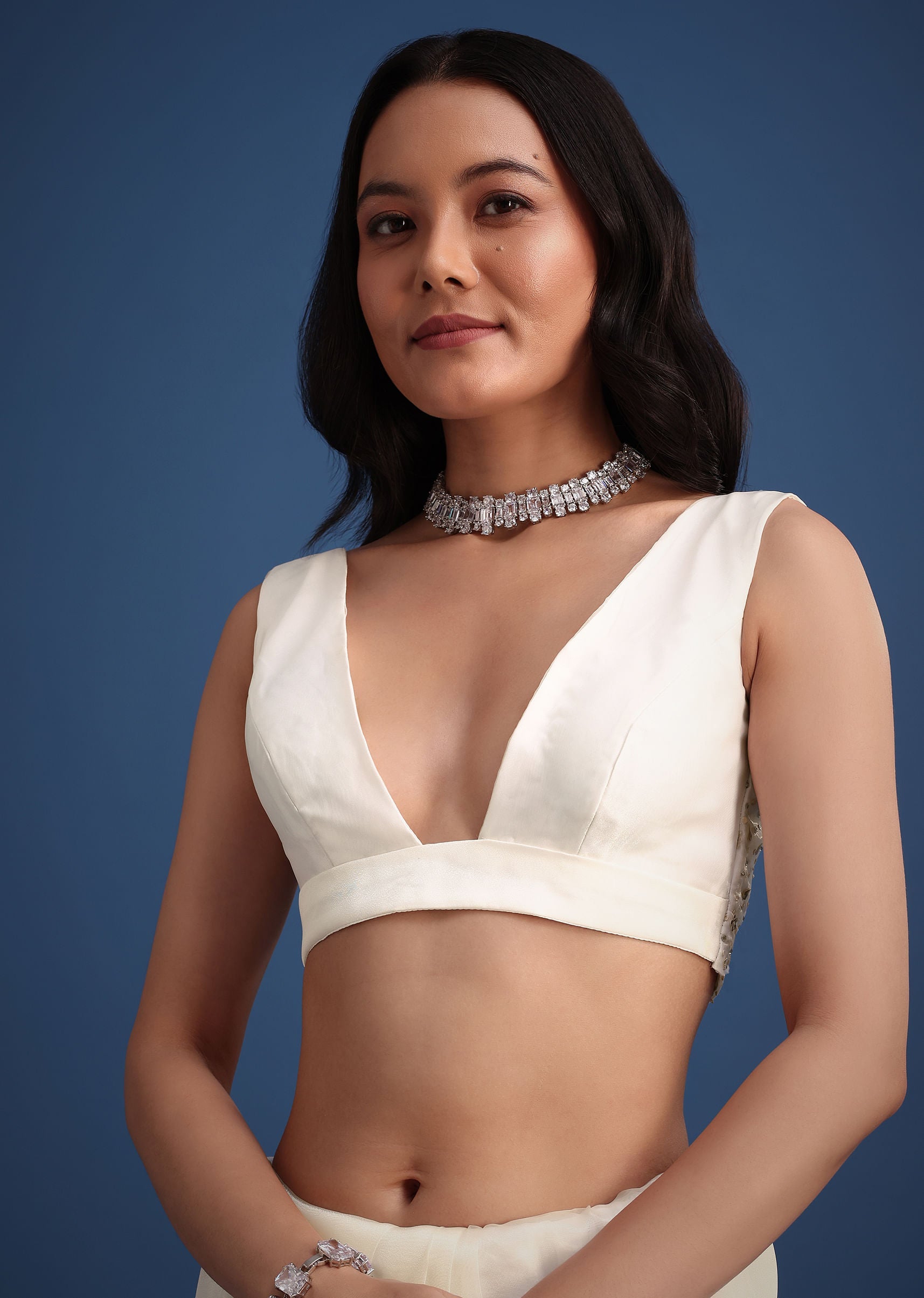 This white glass tissue saree is adorned with sequin embellishments creating a captivating sparkle that's perfect for evening events or cocktail parties. The minimal sparkle adds just the right amount... More Product Details