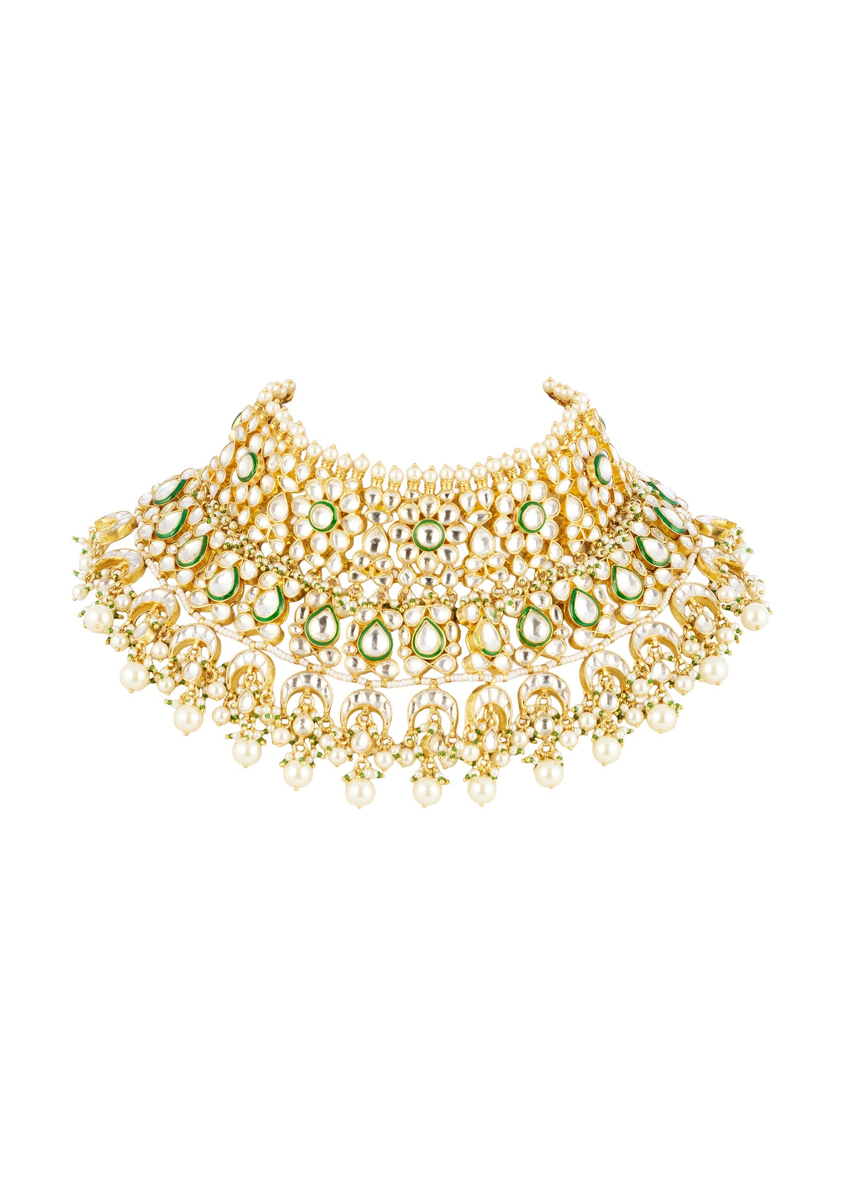 Pair it with white, gold, or pastel bridal outfits to highlight the kundan work and complete your engagement, mehendi, or wedding look.