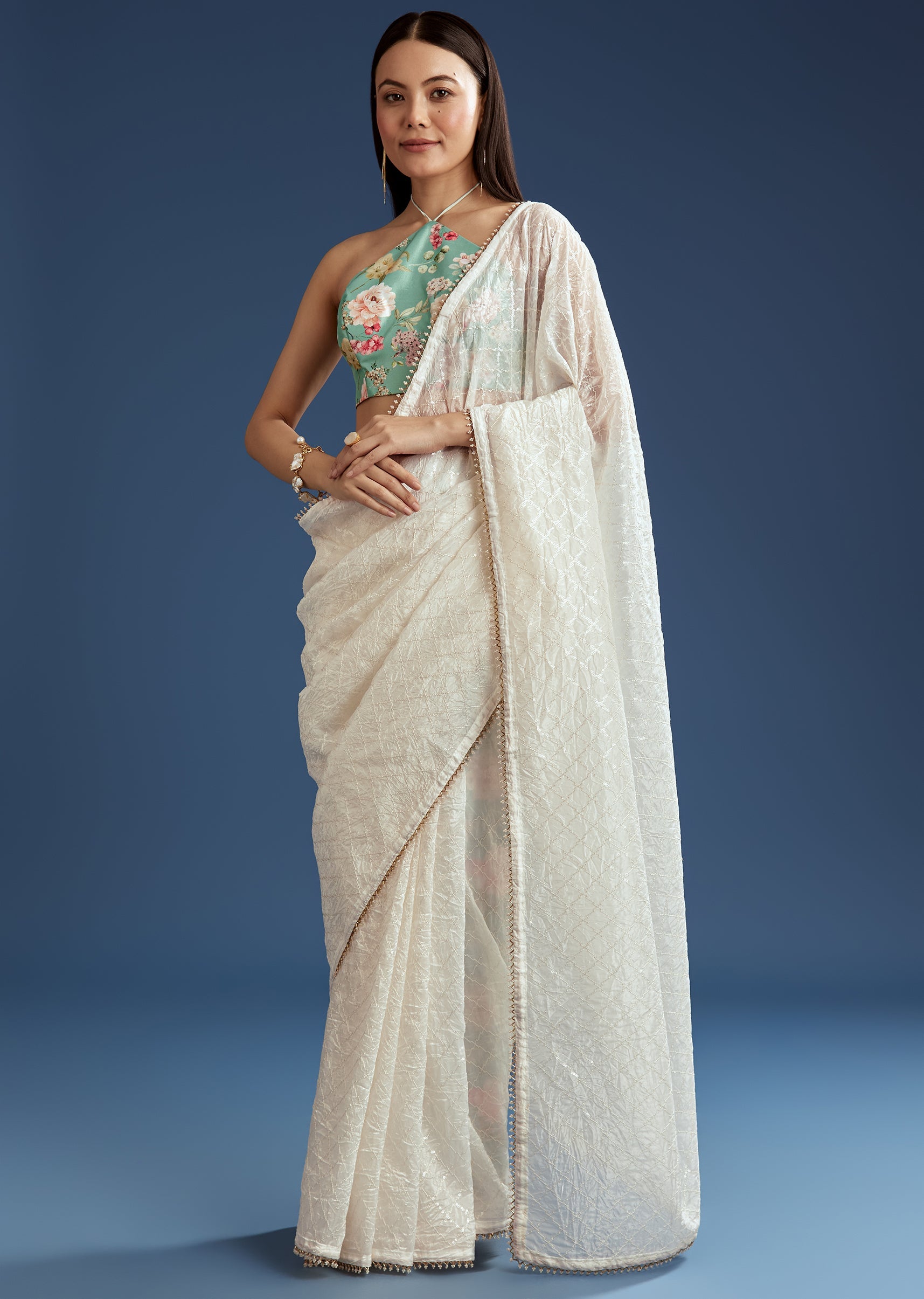 A white green glass tissue saree featuring sequins embroidery, cutdana and bead border with contrast blouse, perfect for weddings. It feels like wearing a quiet poem stitched in shimmer and tradition. Awarded as the Most Trusted Brand, we're delivering styles you love, just as promised.