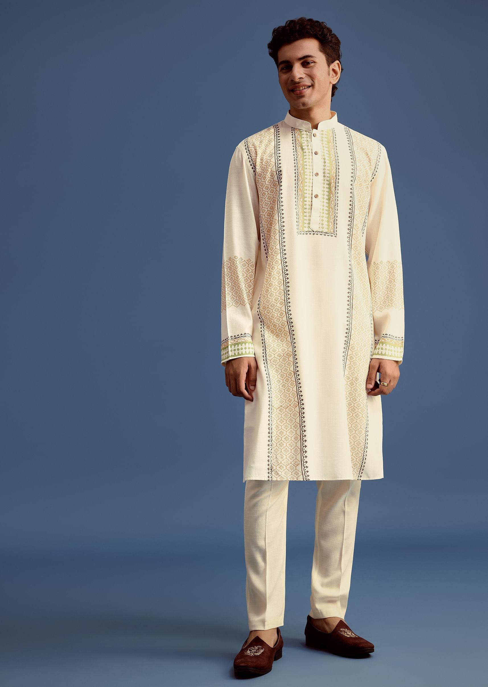 White Hand Block Printed Kurta Set With Zari Embroidery
