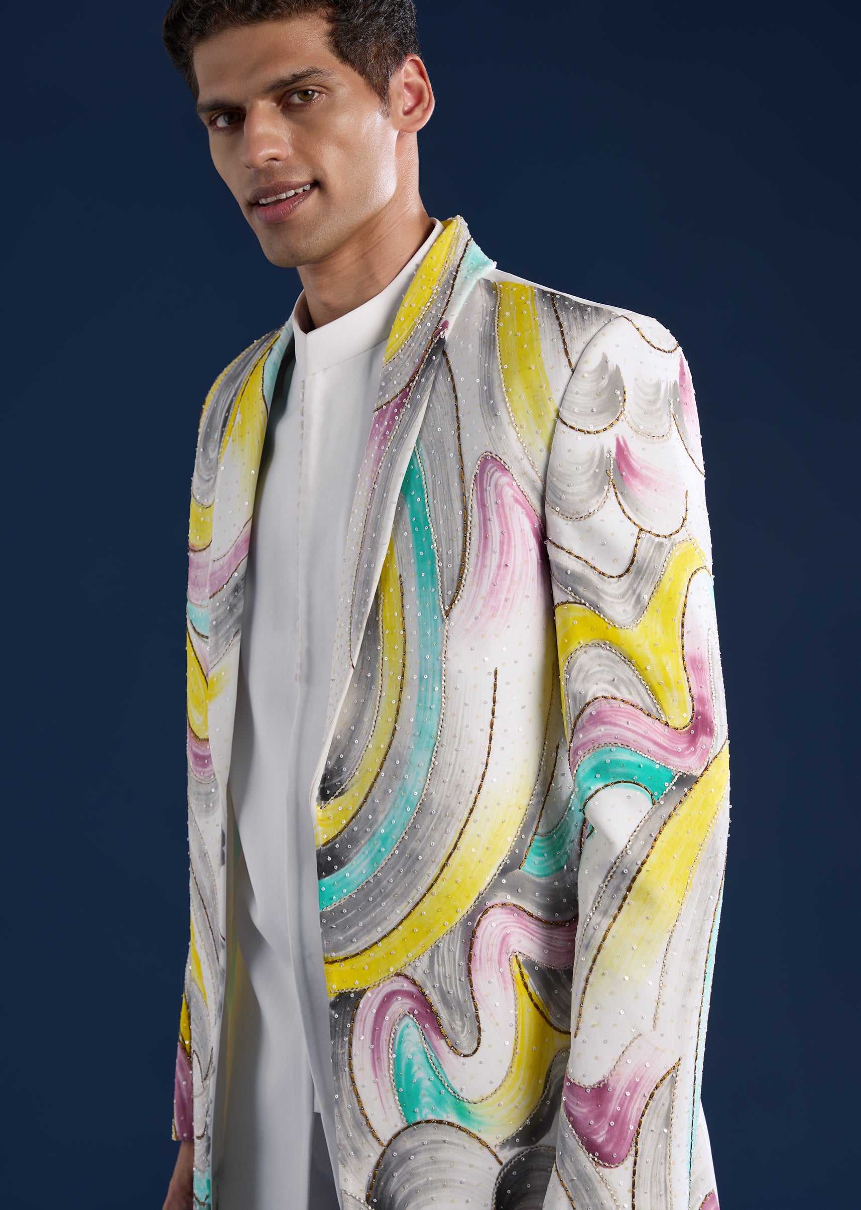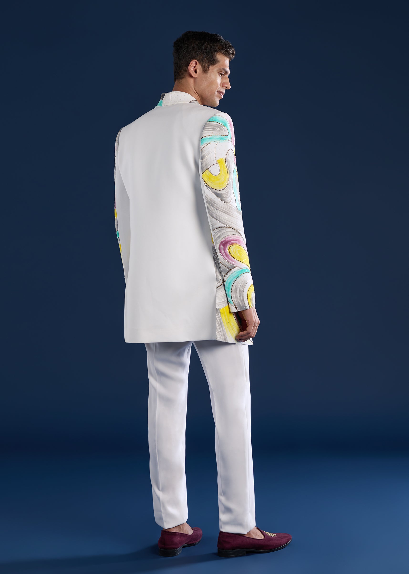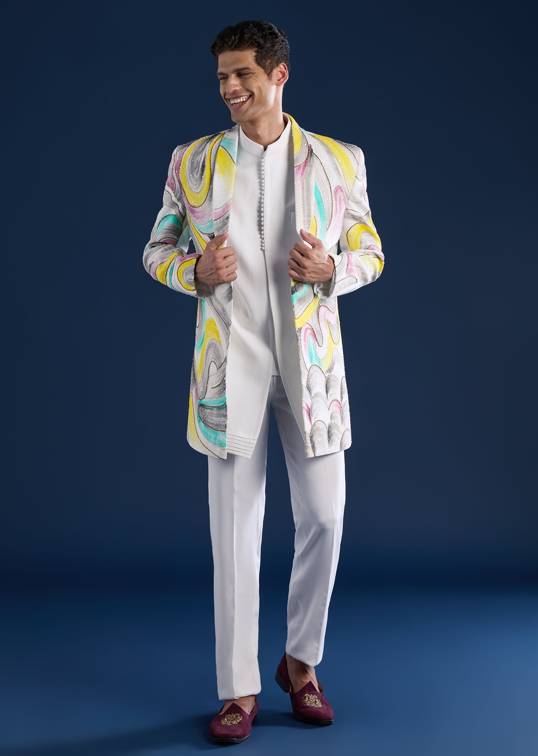 Artful and fresh, the look comes together when this white men’s indo western set in suiting fabric leads the event. Hand painted detailing meets intricate salli pearl and cutdana sequins... More Product Details