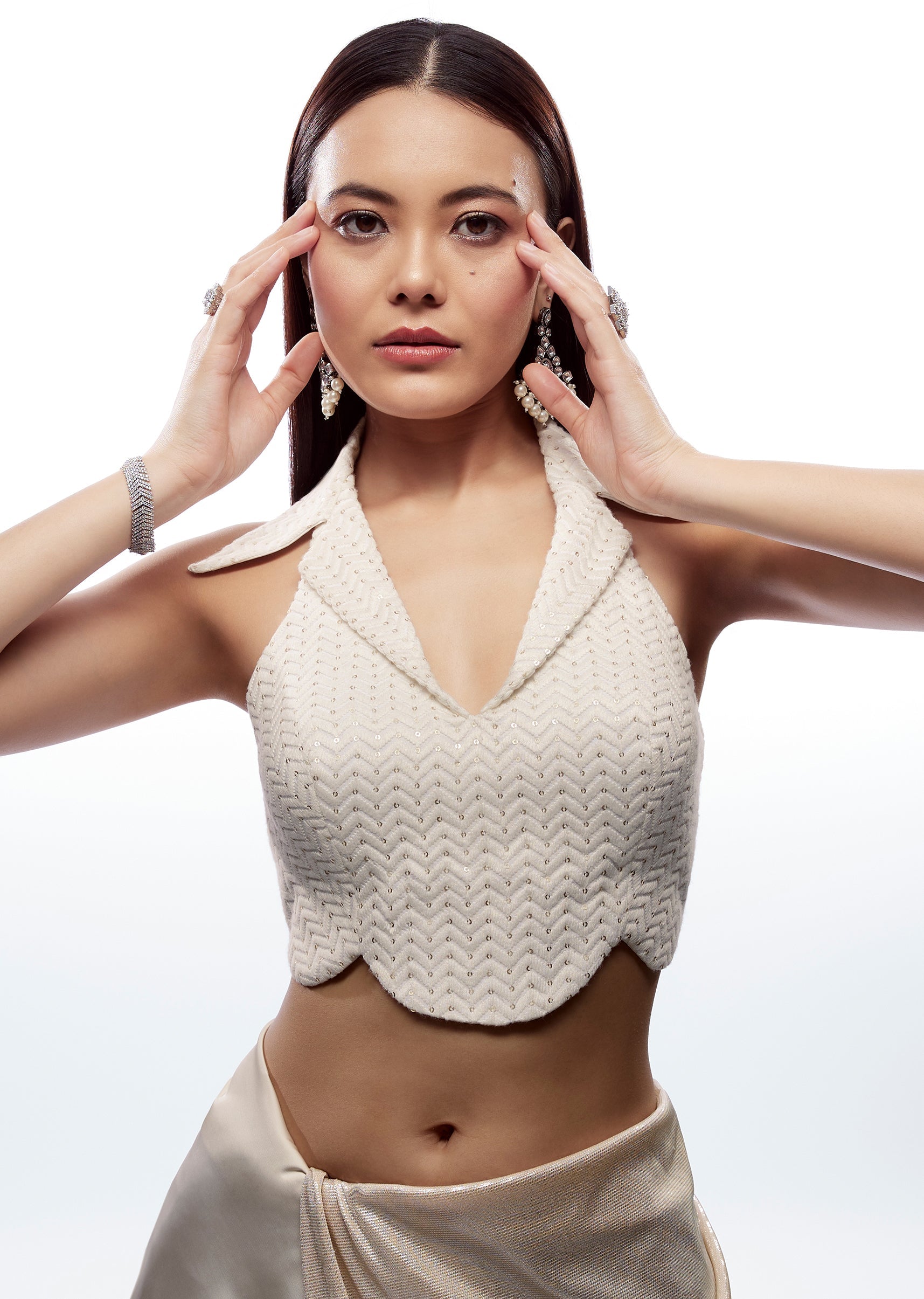 This white blouse in jacquard fabric is a wardrobe must-have for customers who want a timeless blouse that pairs with everything. The V-neckline is flattering and elongating, making it a great match for statement necklaces or layered jewellery. The jacquard weave adds subtle richness and texture without looking heavy, keeping it suitable for both daytime and evening occasions. With a sleeveless cut and back hook-eye closure, this blouse is clean, structured, and easy to style with printed sarees, bright silks, pastel drapes, or even heavier bridal skirts. Awarded as the Most Trusted Brand, we're delivering styles you love, just as promised.