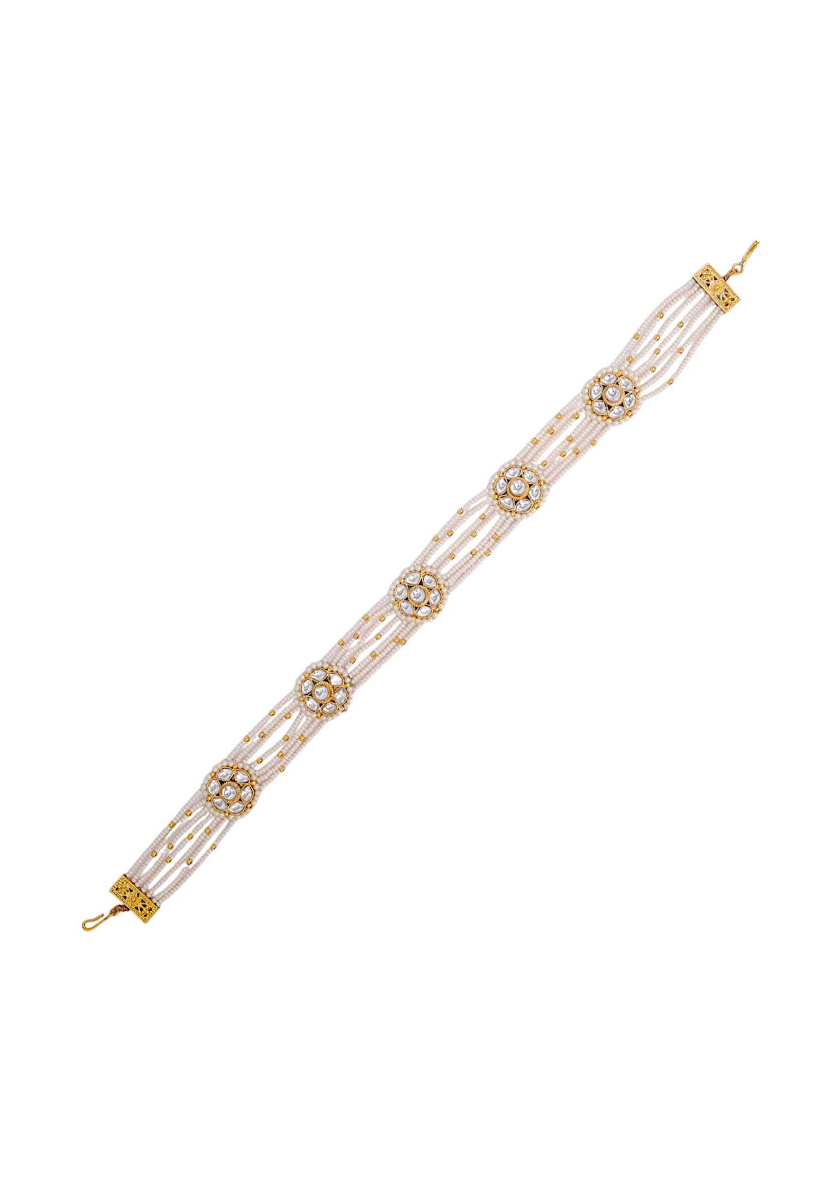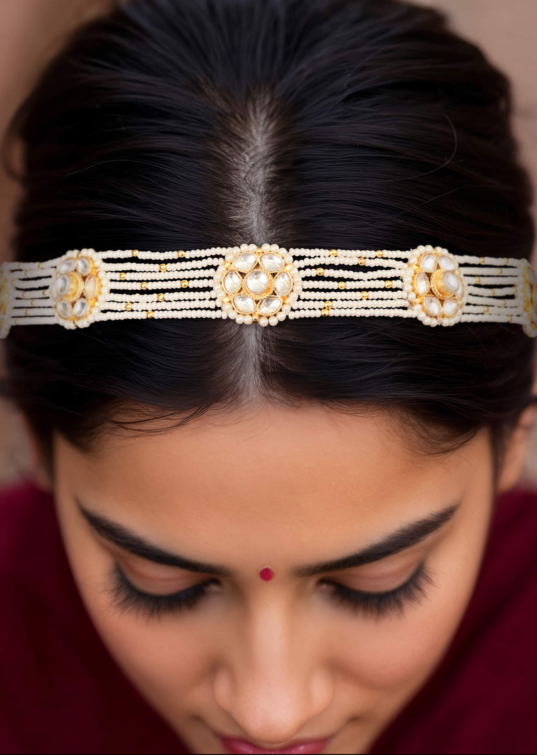 A white kundan bead layered floral mathapatti featuring intricately arranged beads and floral motifs, exuding delicate charm and elegance. Perfect for enhancing the grace of bridal or festive ensembles. Awarded as the Most Trusted Brand, we're delivering styles you love, just as promised.