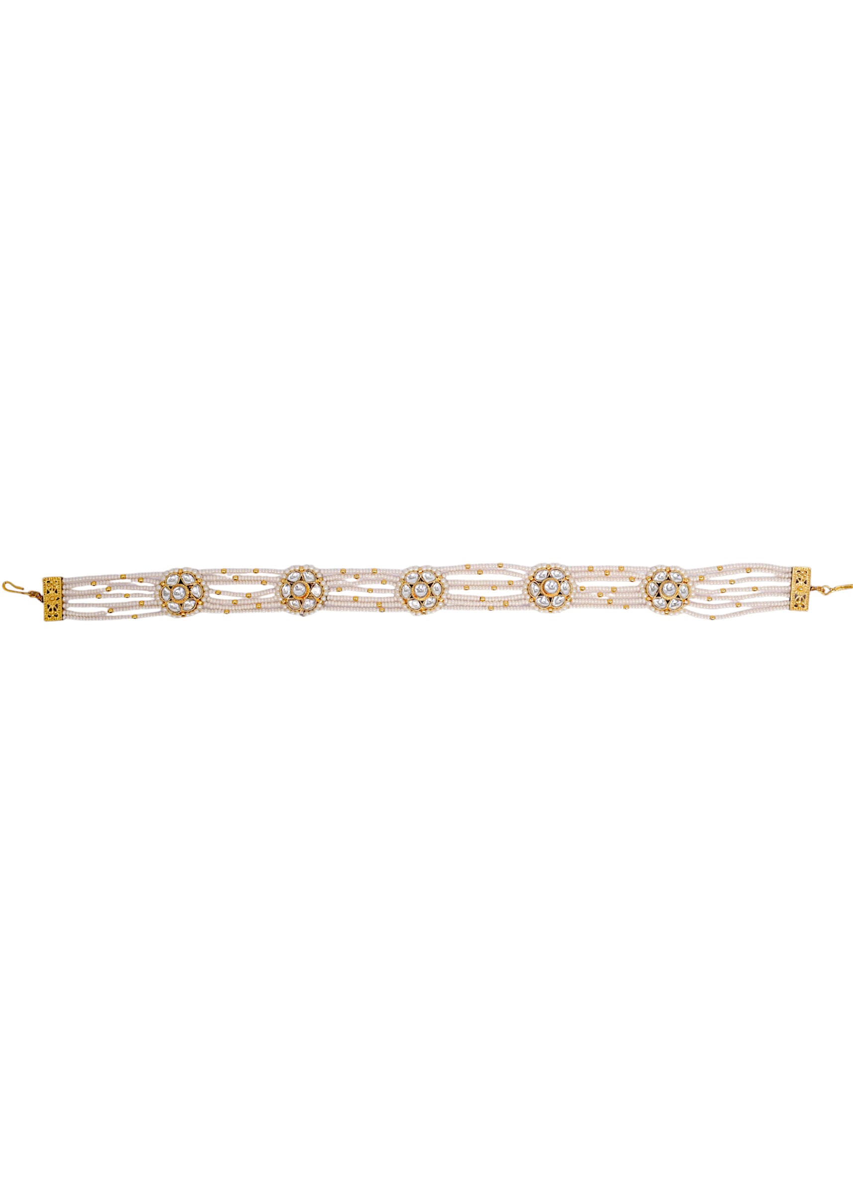 A white kundan bead layered floral mathapatti featuring intricately arranged beads and floral motifs, exuding delicate charm and elegance. Perfect for enhancing the grace of bridal or festive ensembles. Awarded... More Product Details